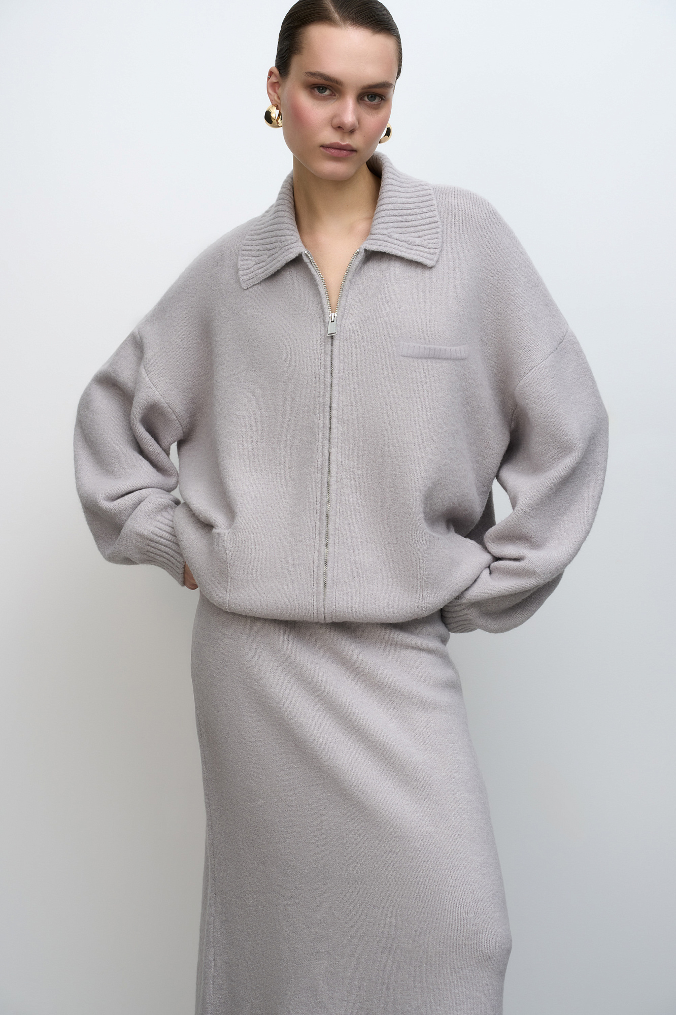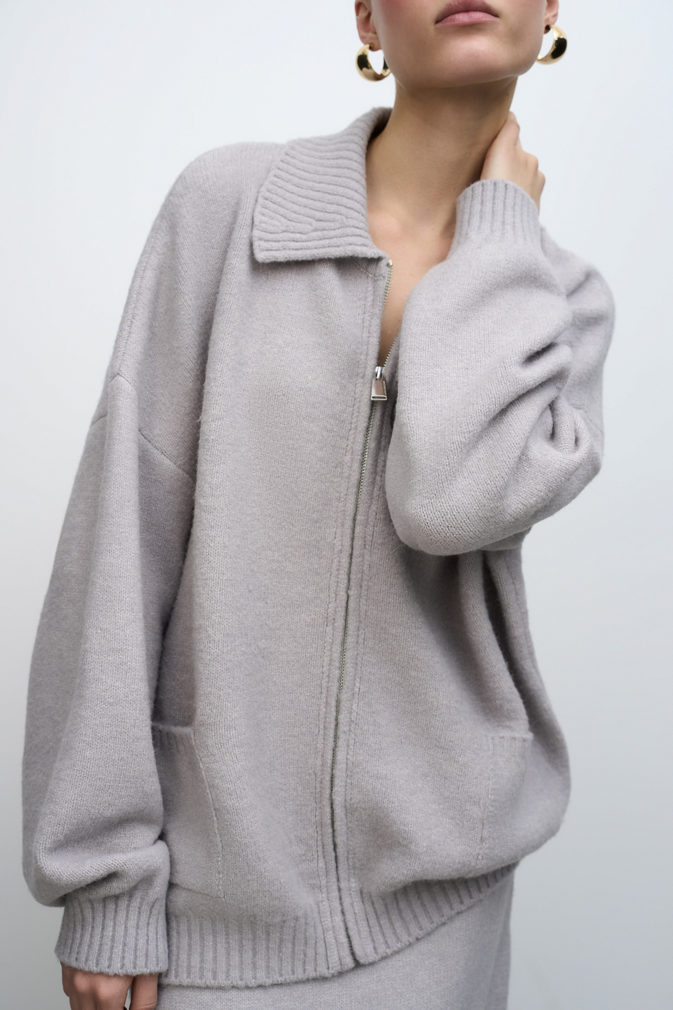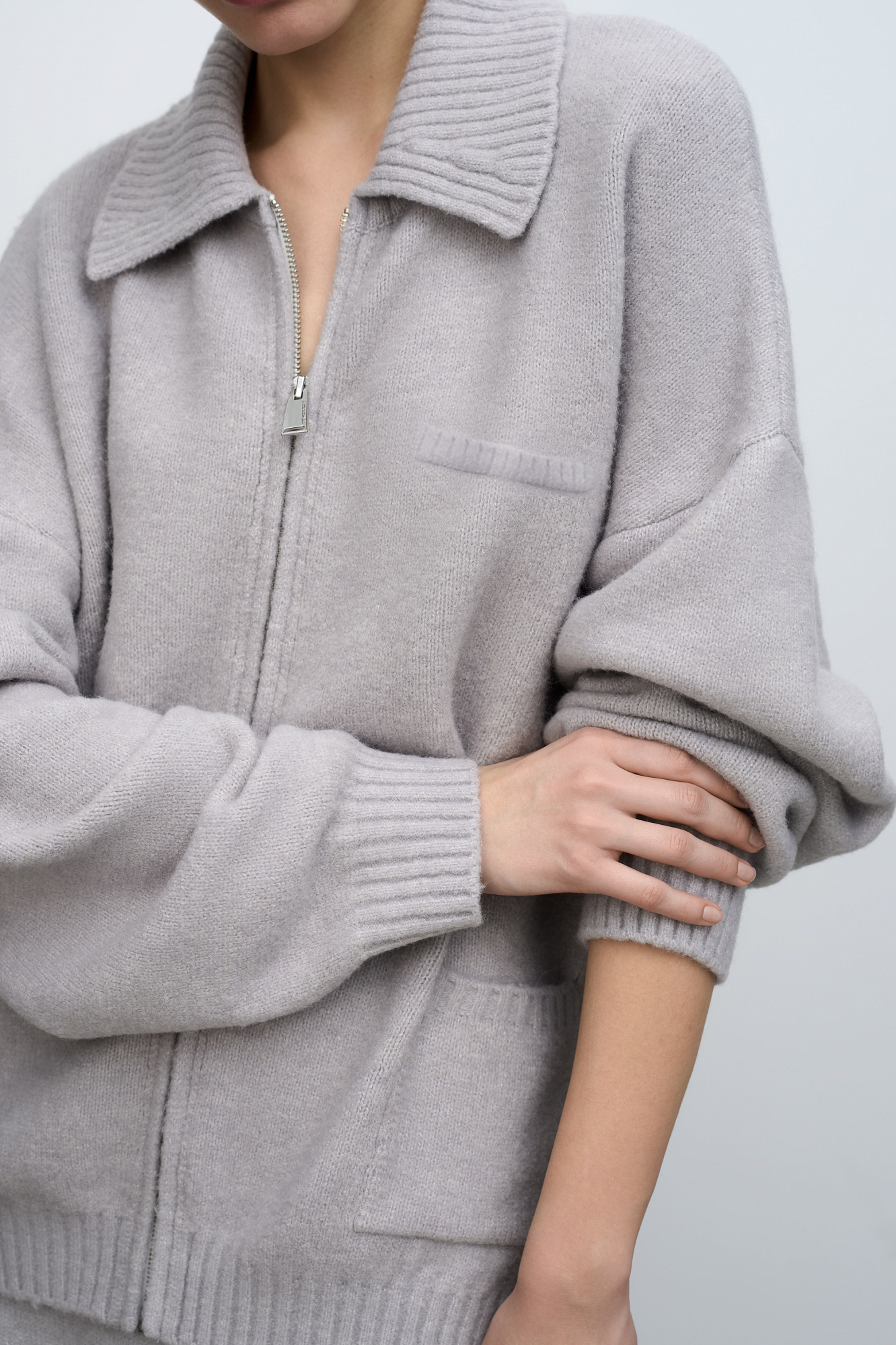 Трикотажный бомбер из шерсти с добавлением мохера. Модель свободного силуэта со спущенной линией плеча, отложным воротником и накладными карманами. Застежка на молнию. Изделие без подкладки.