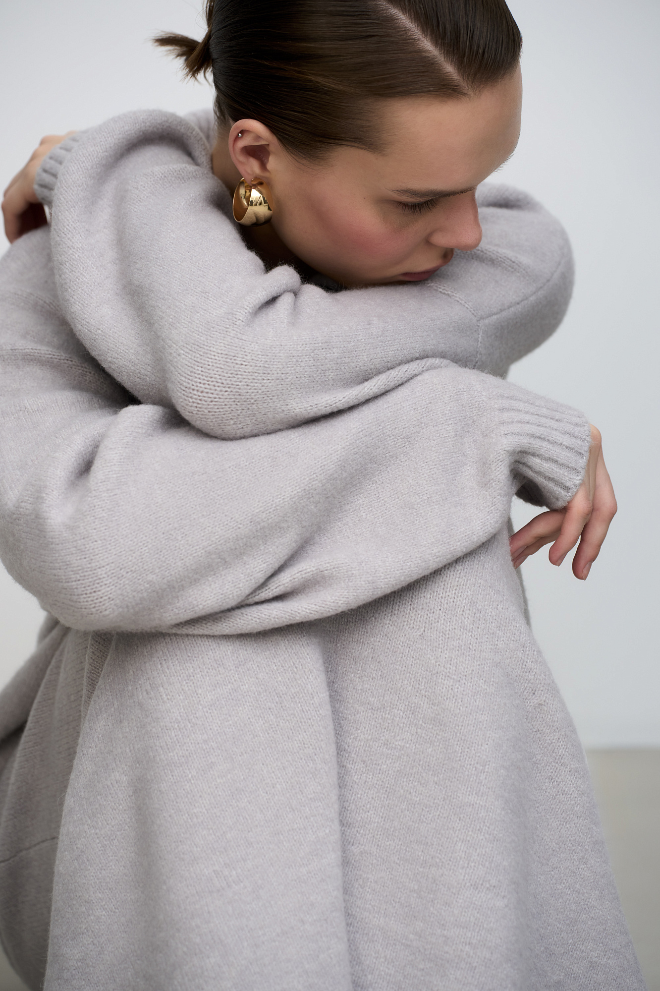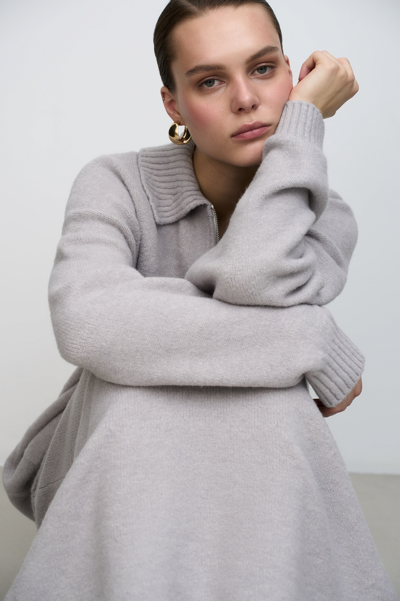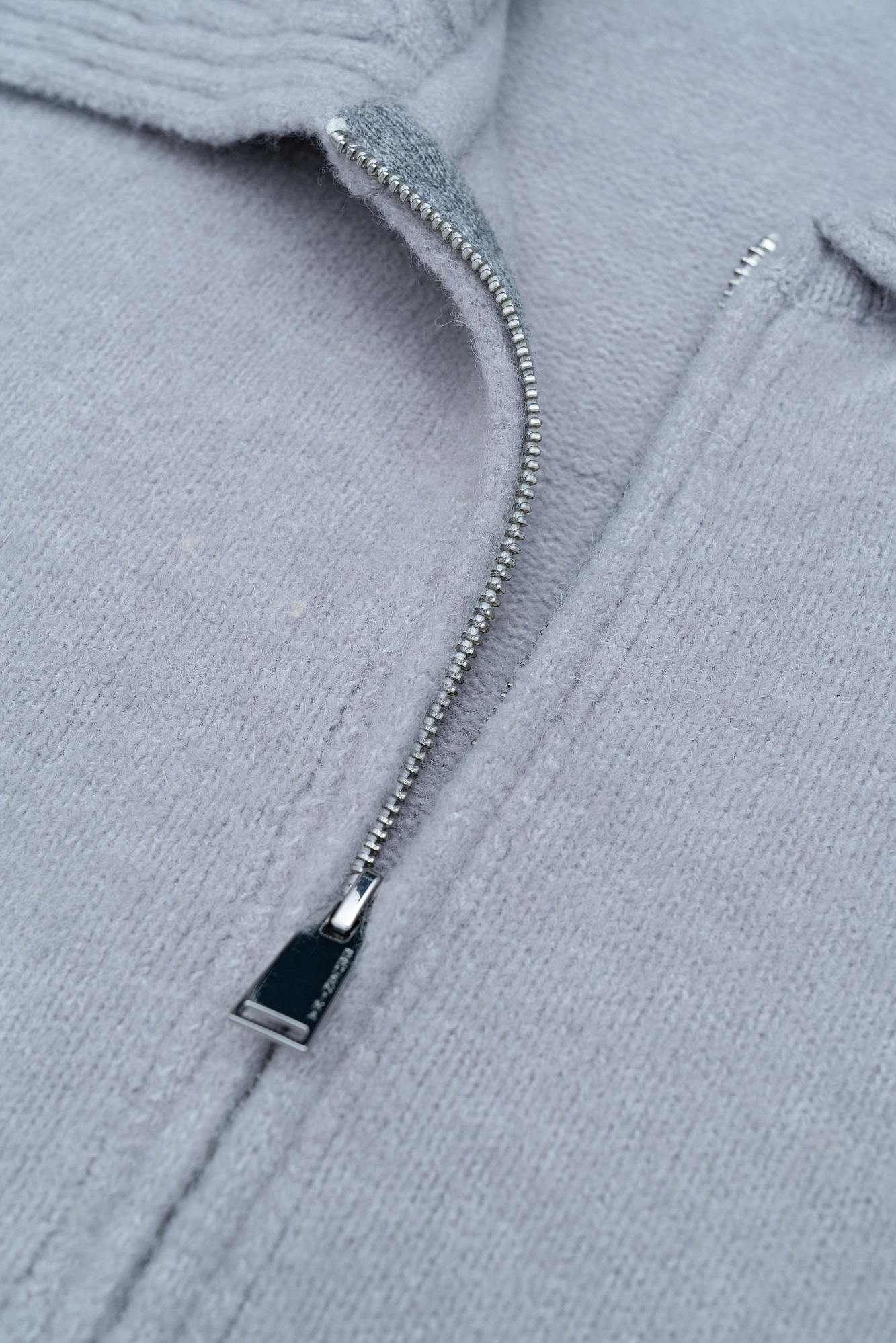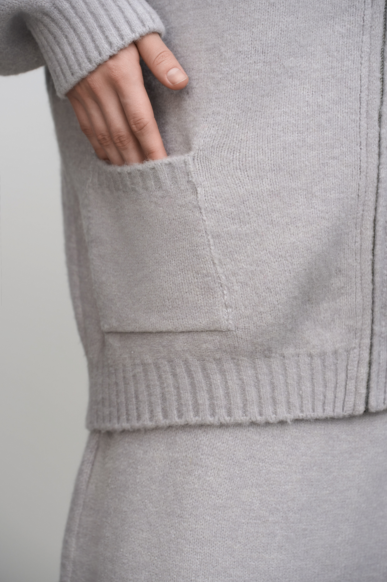 Трикотажный бомбер из шерсти с добавлением мохера. Модель свободного силуэта со спущенной линией плеча, отложным воротником и накладными карманами. Застежка на молнию. Изделие без подкладки.