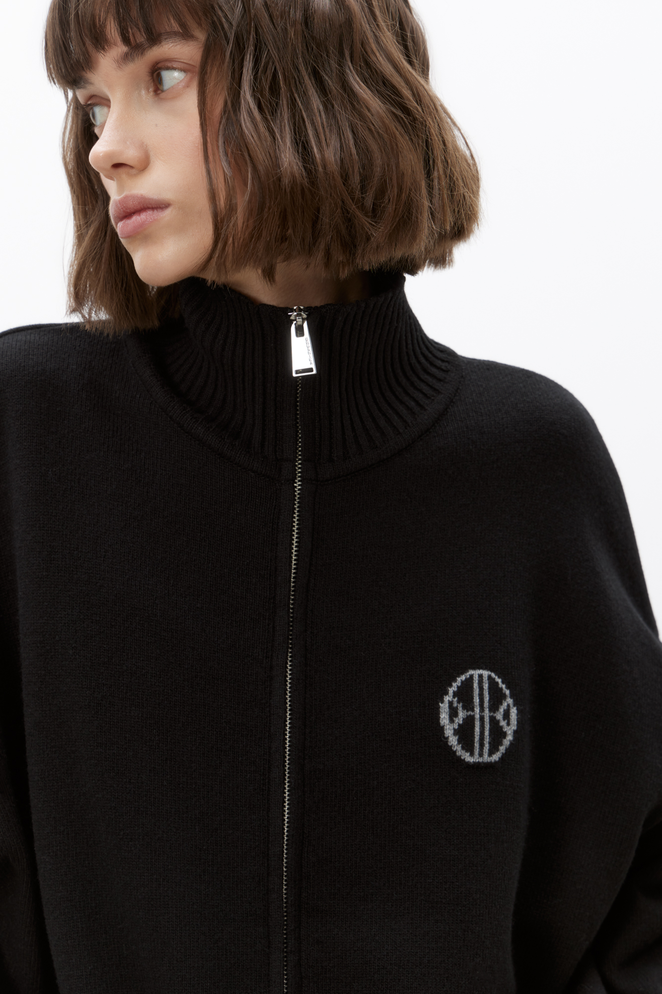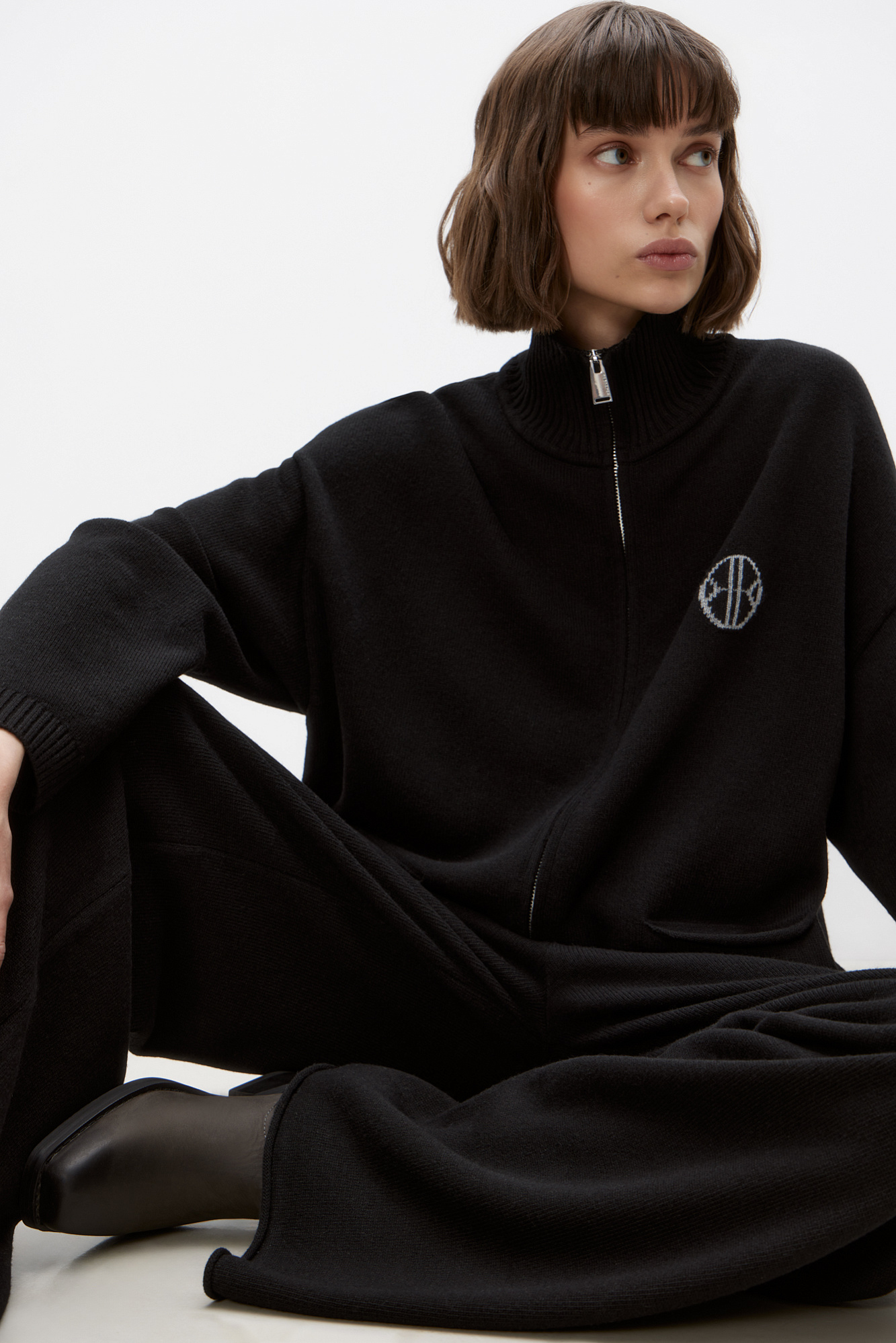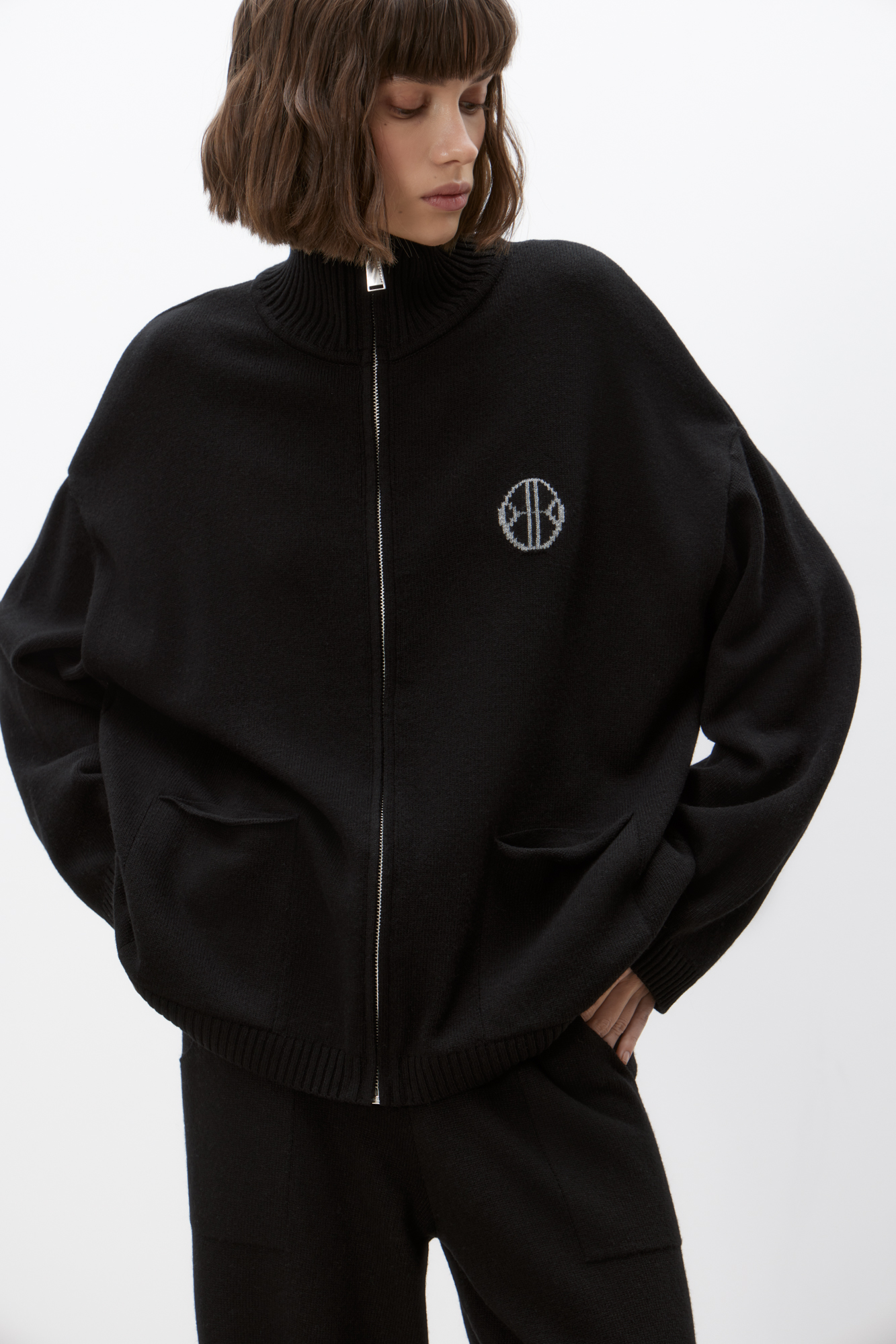 Трикотажный бомбер в спортивном стиле. Модель свободного силуэта со спущенной линией плеча и боковыми карманами. Вышивка логотипа бренда на груди. Застежка на молнию.