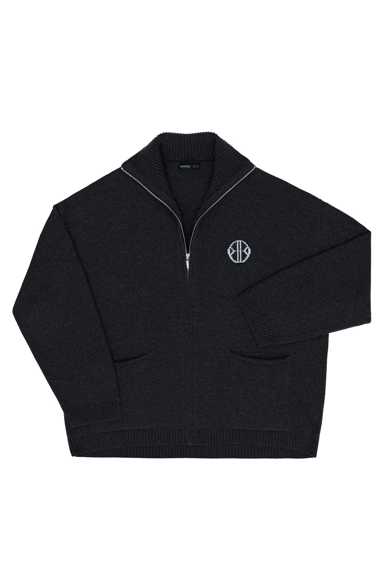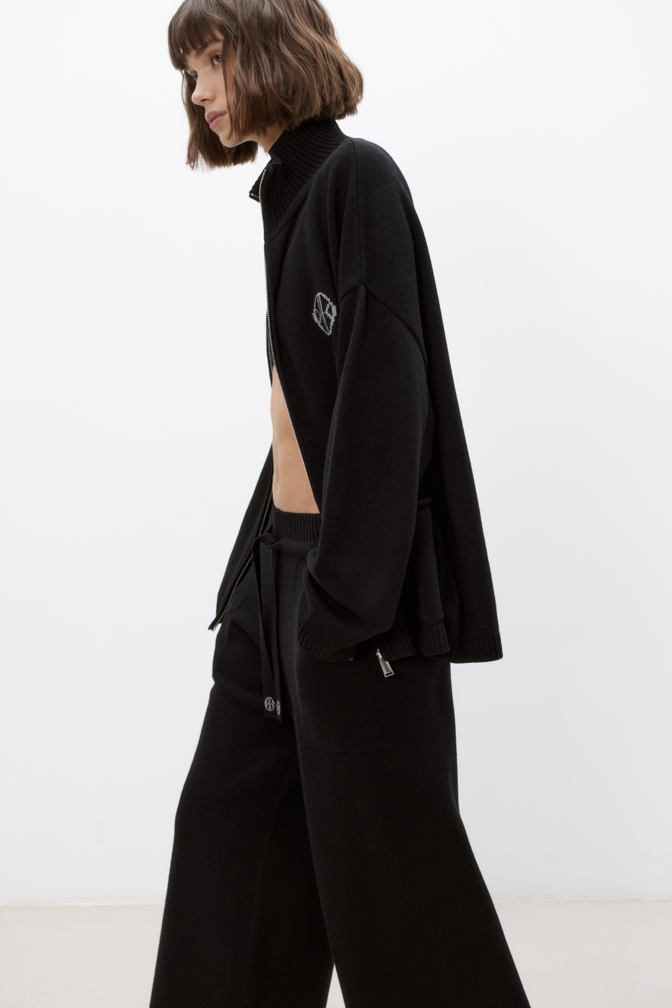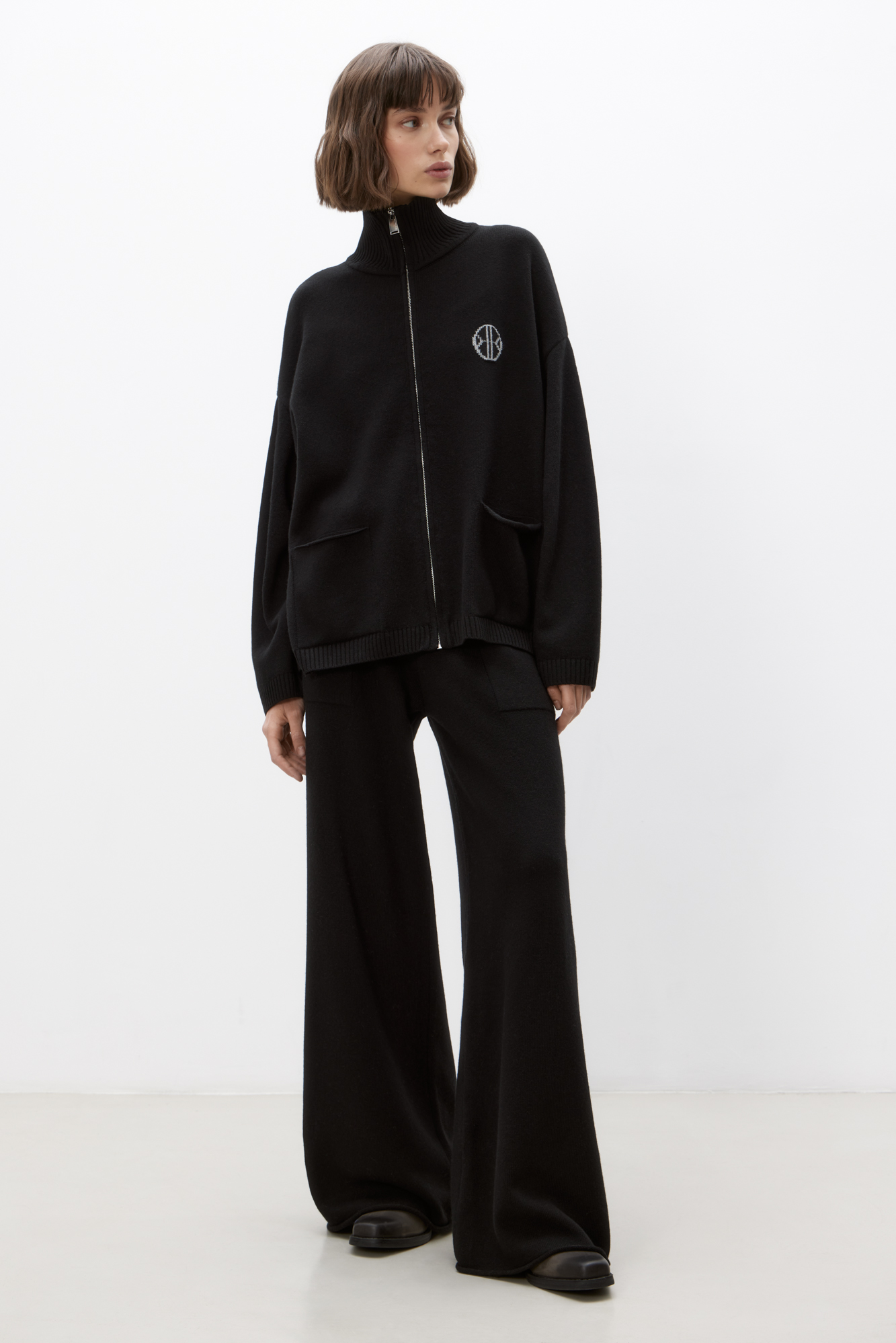 Трикотажный бомбер в спортивном стиле. Модель свободного силуэта со спущенной линией плеча и боковыми карманами. Вышивка логотипа бренда на груди. Застежка на молнию.