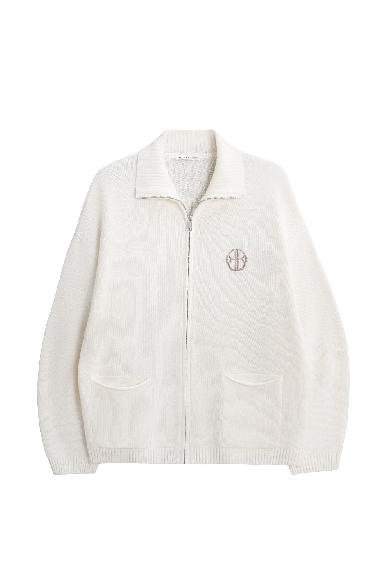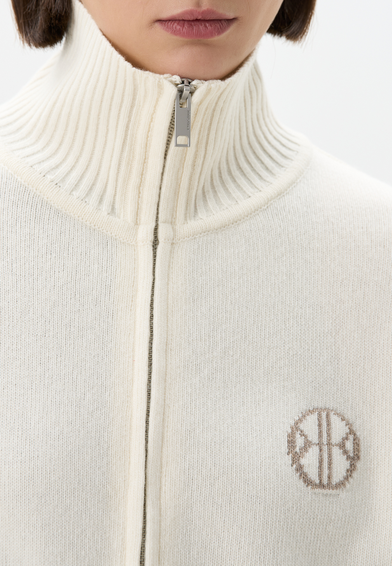Трикотажный бомбер в спортивном стиле из кашемира и шерсти. Модель свободного силуэта со спущенной линией плеча, накладными карманами и воротником-стойкой. Изделие декорировано вышитым логотипом бренда на груди. Застежка на молнию.