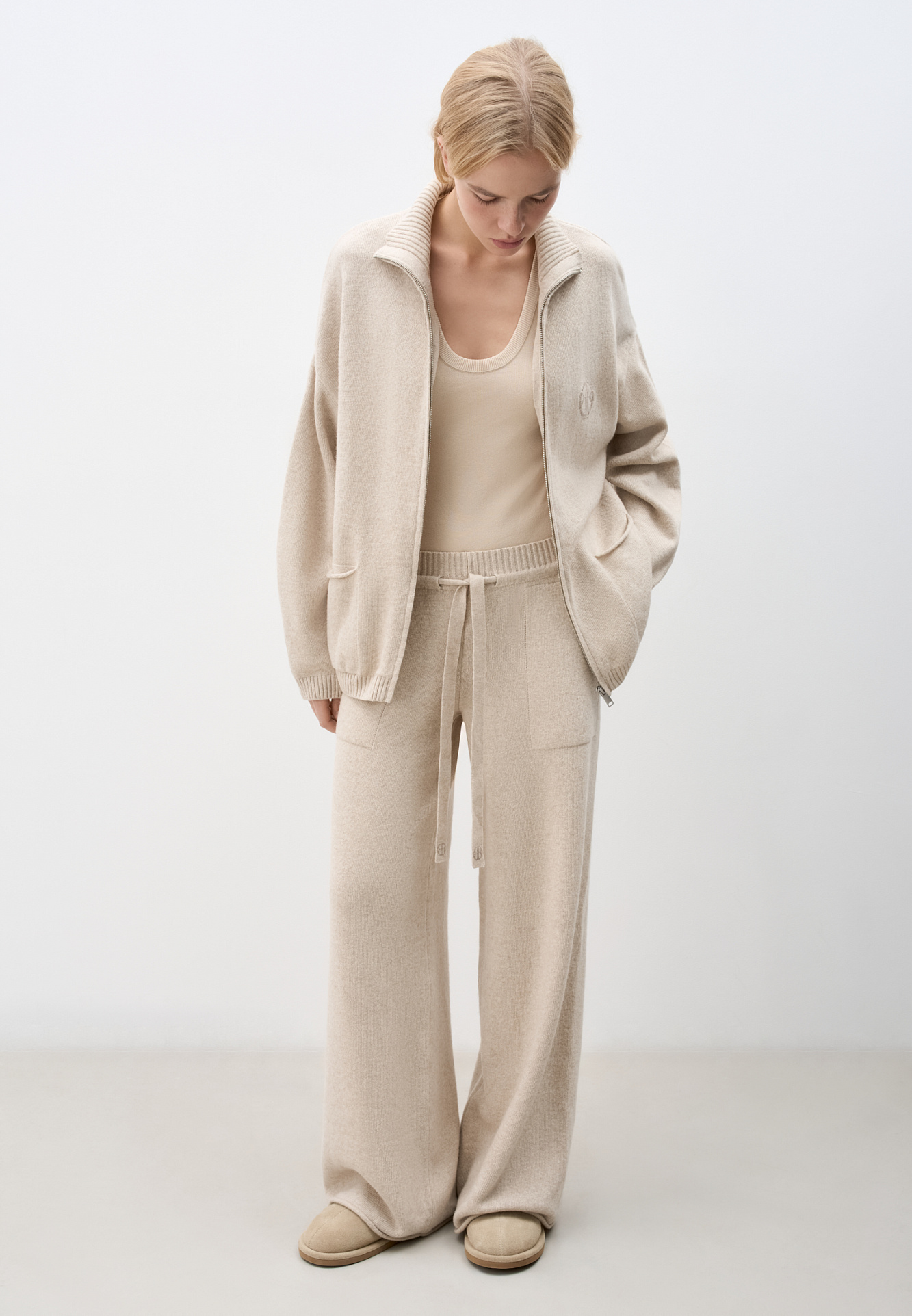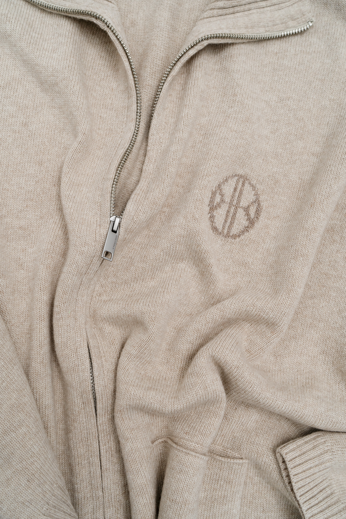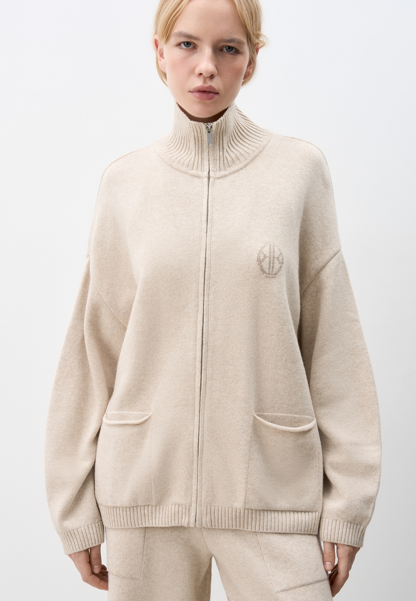 Трикотажный бомбер в спортивном стиле из кашемира и шерсти. Модель свободного силуэта со спущенной линией плеча, накладными карманами и воротником-стойкой. Изделие декорировано вышитым логотипом бренда на груди. Застежка на молнию.