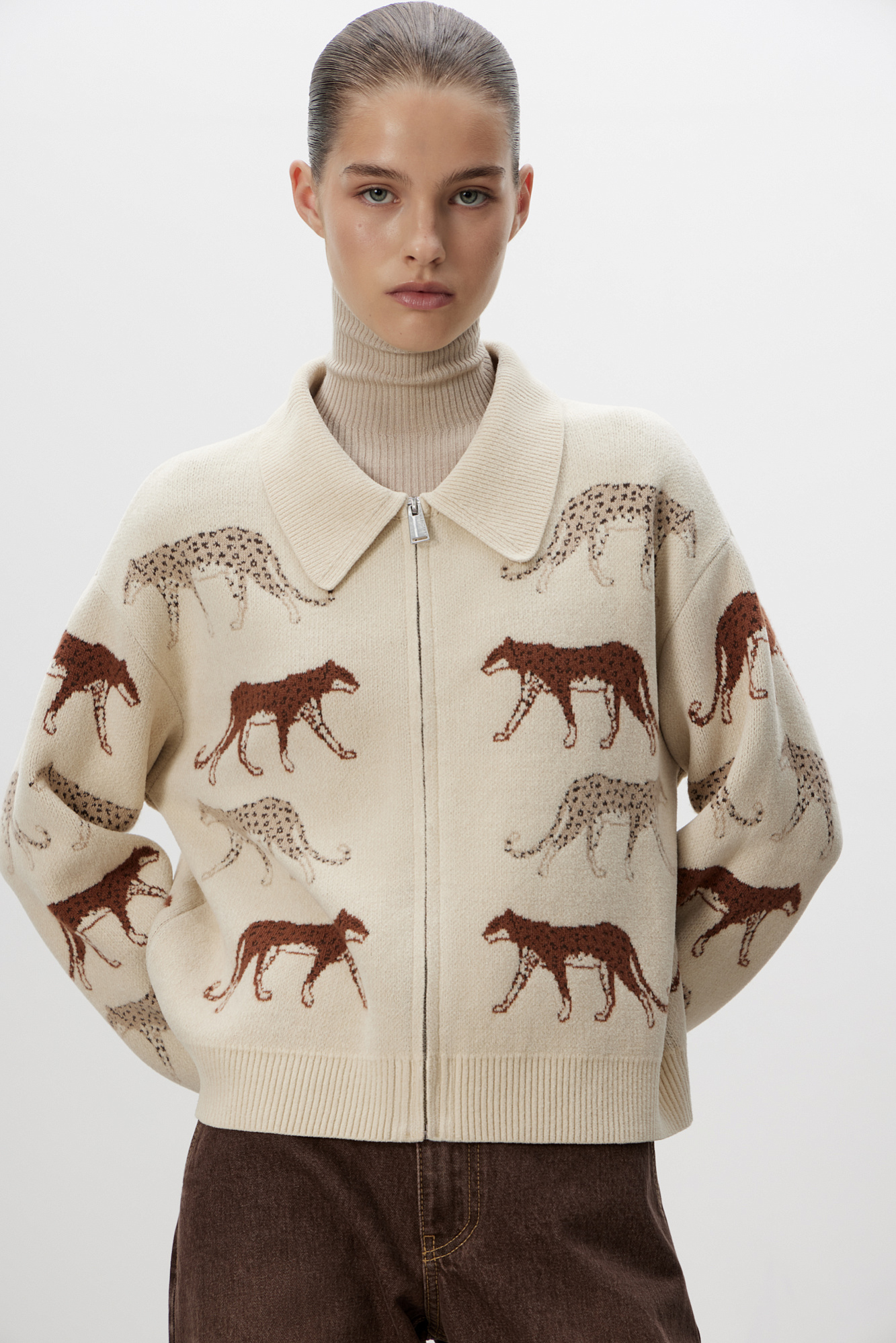 Бомбер с жаккардовым анималистическим дизайном. Модель свободного силуэта с застежкой на молнию. Края изделия в рубчик.