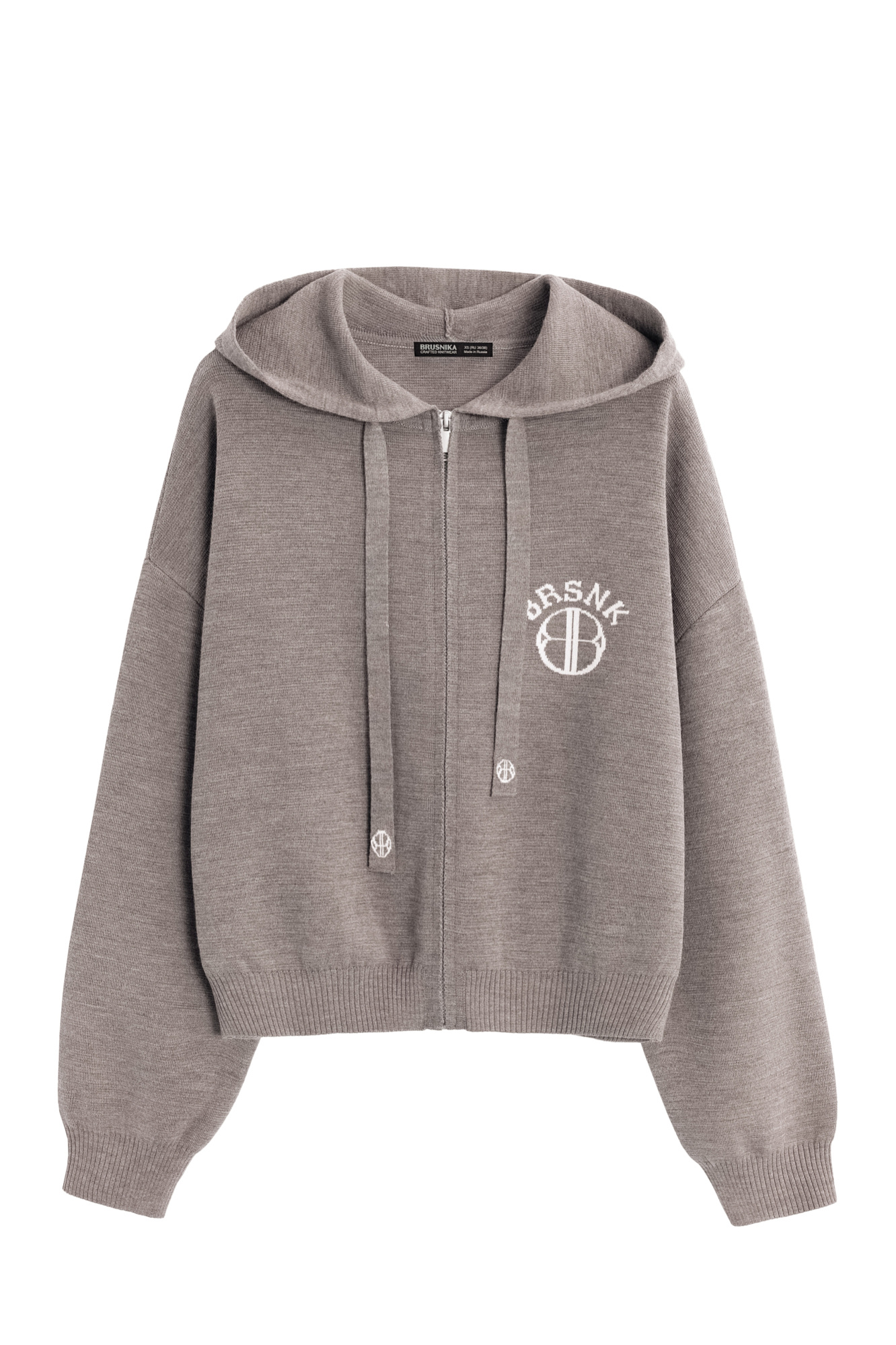 Трикотажный бомбер в спортивном стиле из шерсти с добавлением акрила. Модель свободного силуэта со спущенной линией плеча и капюшоном на кулиске. Низ изделия и манжеты рукавов выполнены на эластичной резинке. Изделие декорировано брендированным жаккардом на груди и шнурке. Застежка на молнию.