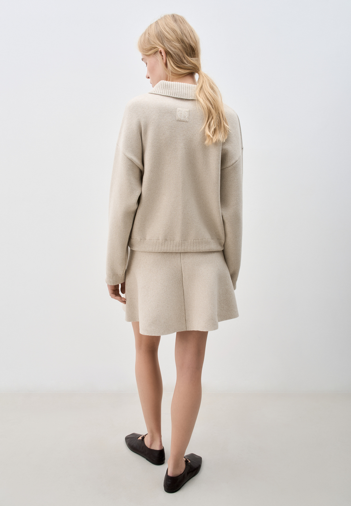 Трикотажный бомбер из кашемира и шерсти. Модель свободного силуэта, со спущенной линией плеч, отложным воротником, боковыми карманами, застежкой на молнию, планкой контрастного цвета и брендированным жаккардом на груди. Низ изделия выполнен на резинке. Дополнить образ можно юбкой в таком же стиле.
