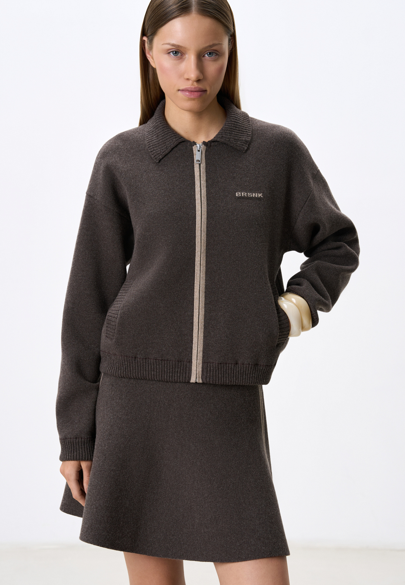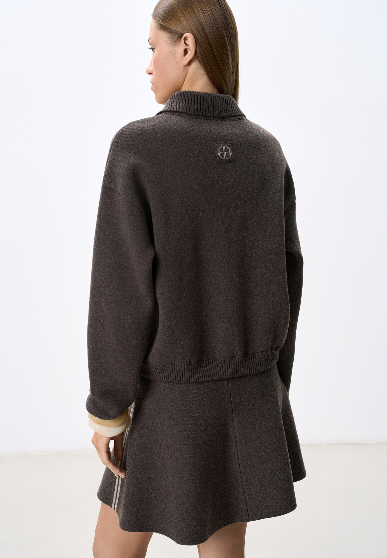 Трикотажный бомбер из кашемира и шерсти. Модель свободного силуэта, со спущенной линией плеч, отложным воротником, боковыми карманами, застежкой на молнию, планкой контрастного цвета и брендированным жаккардом на груди. Низ изделия выполнен на резинке. Дополнить образ можно юбкой в таком же стиле.