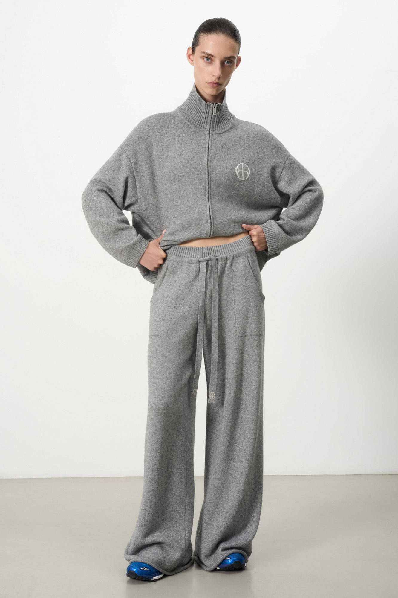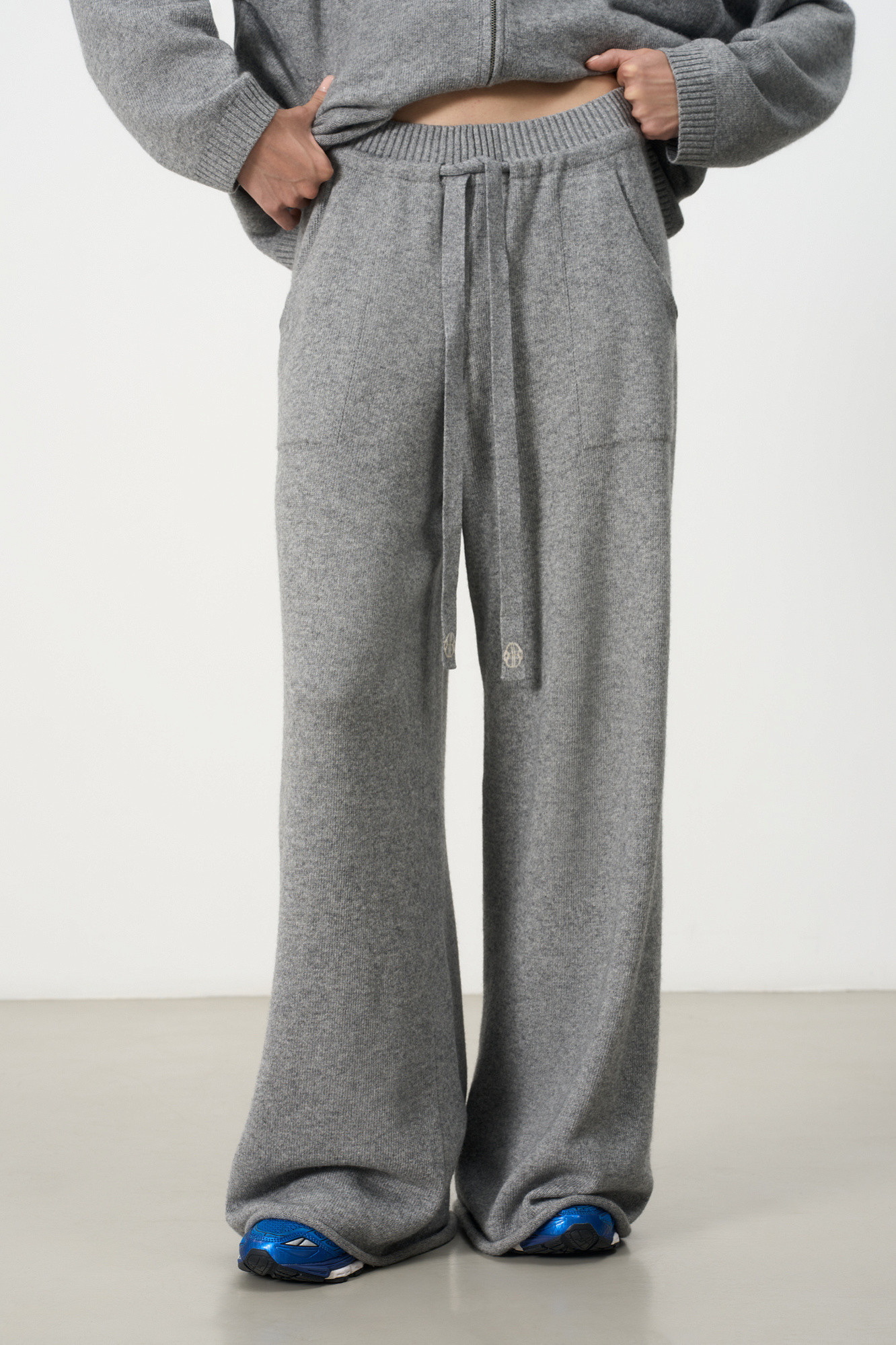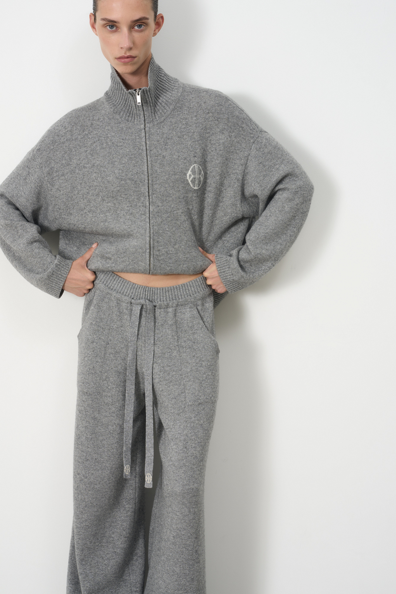 Трикотажные брюки из кашемира и шерсти. Модель прямого силуэта с накладными карманами и эластичным поясом в рубчик на кулиске. Дополнить образ можно бомбером.