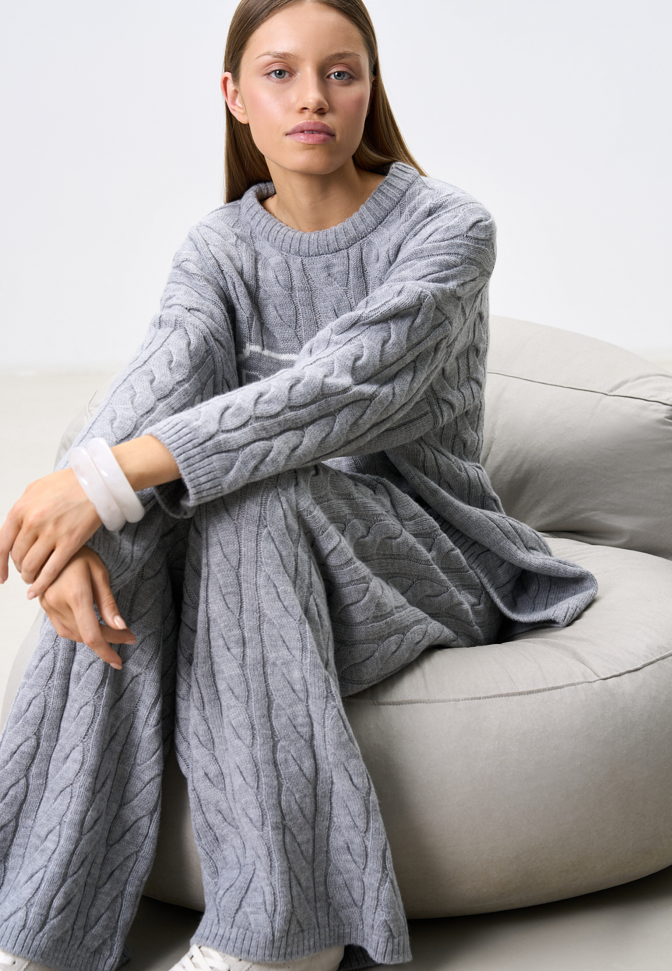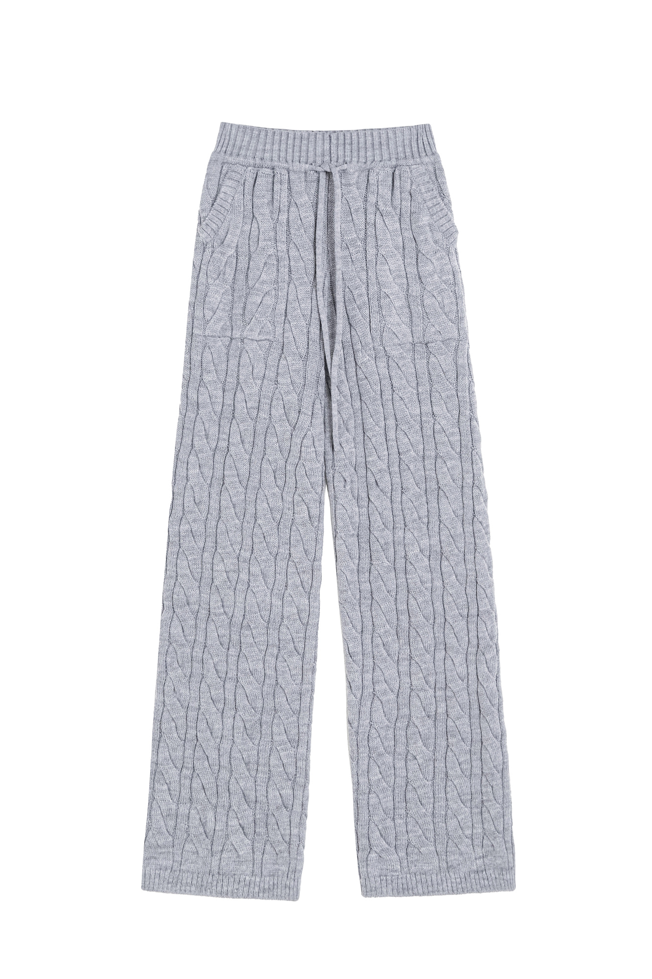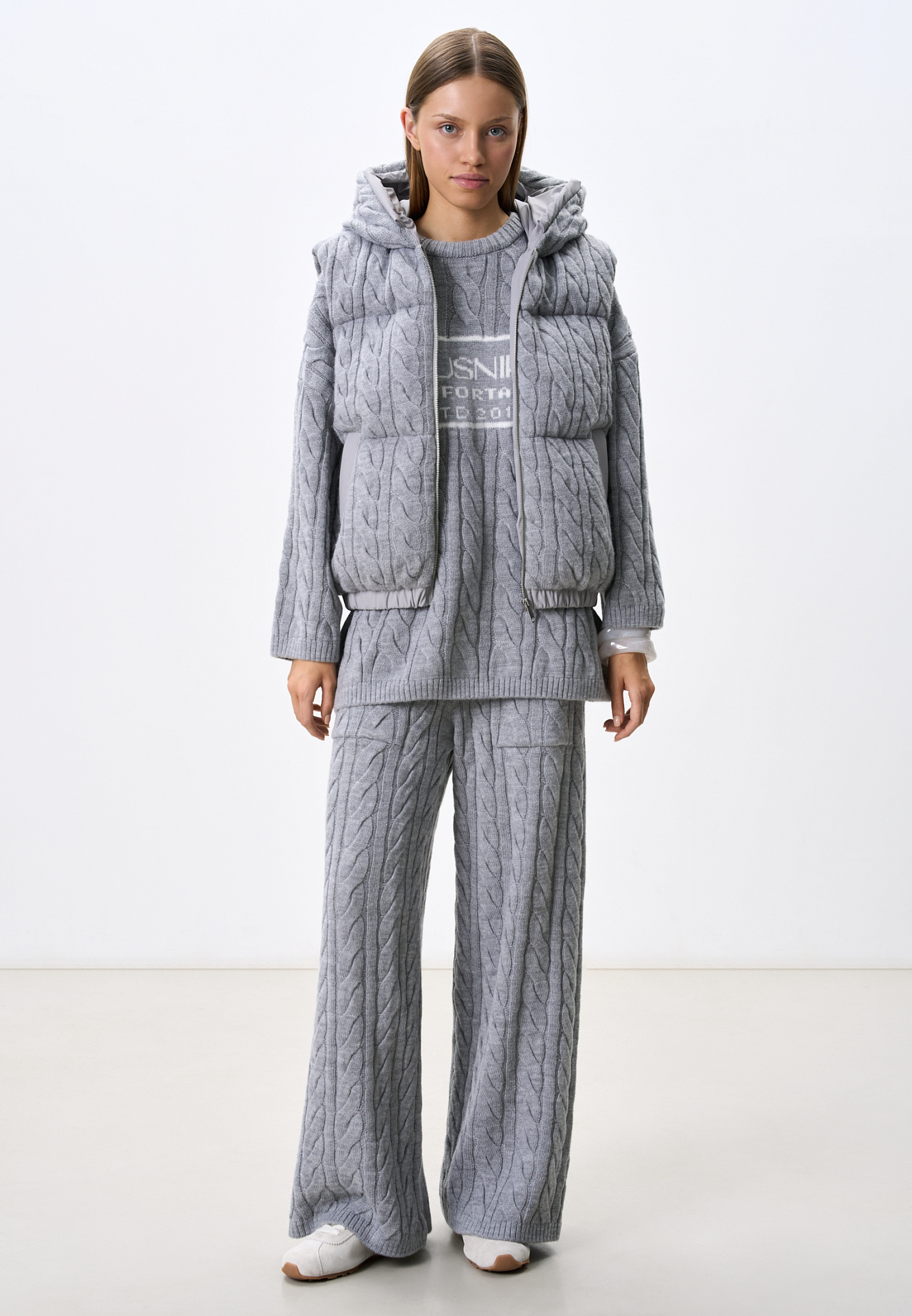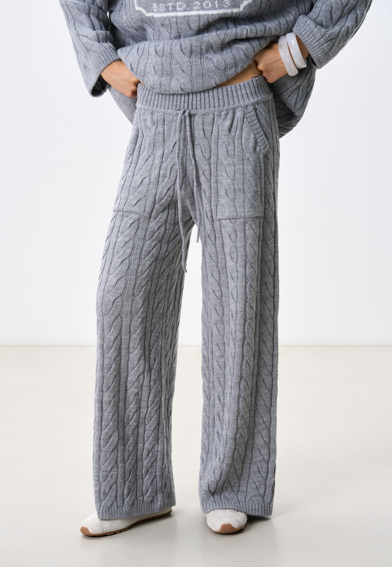 Прямые трикотажные брюки с объемными косами из мягкой шерсти. Широкий эластичный пояс на кулиске, передние и задние карманы и манжеты внизу. Дополнить образ можно джемпером в том же стиле.