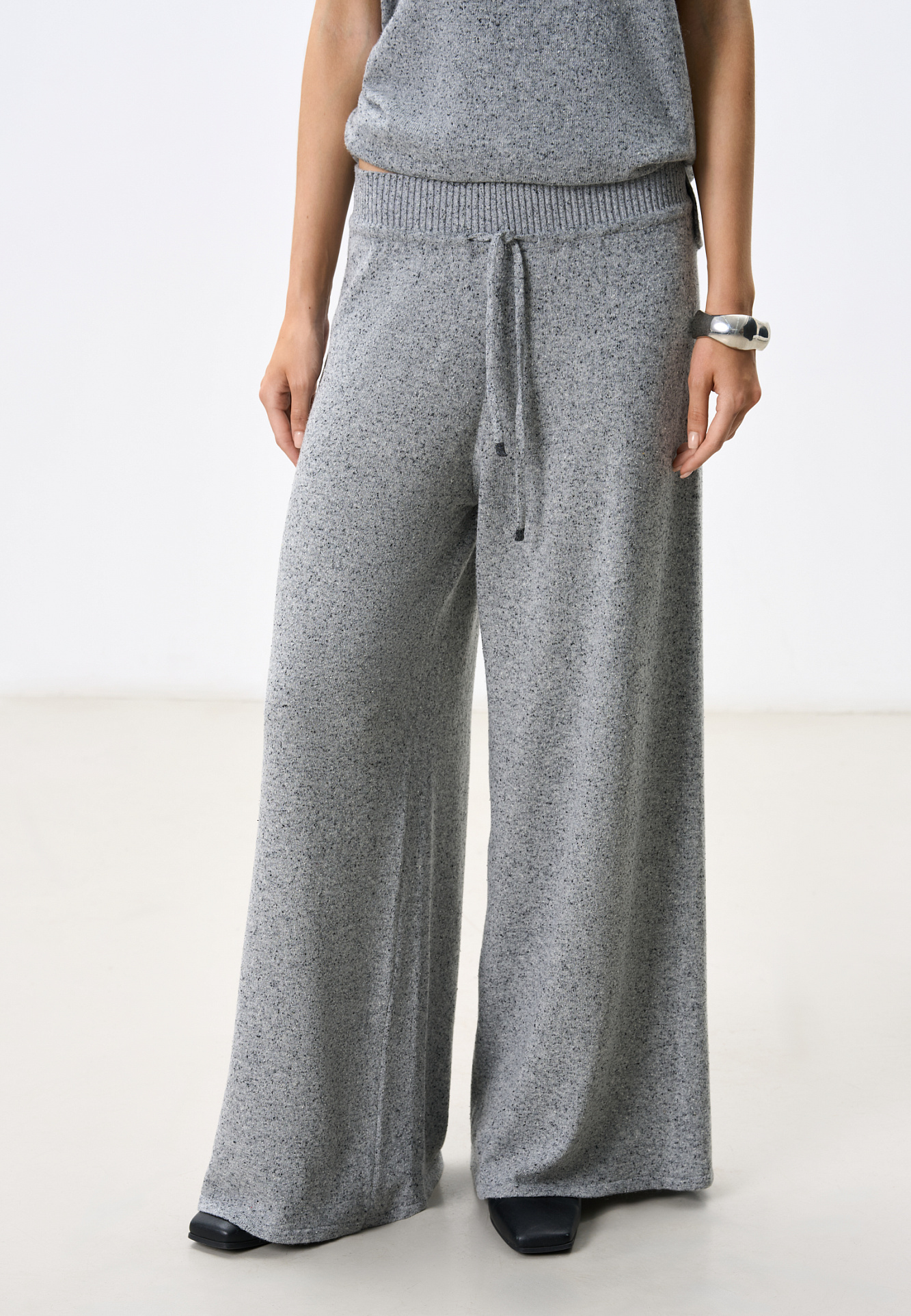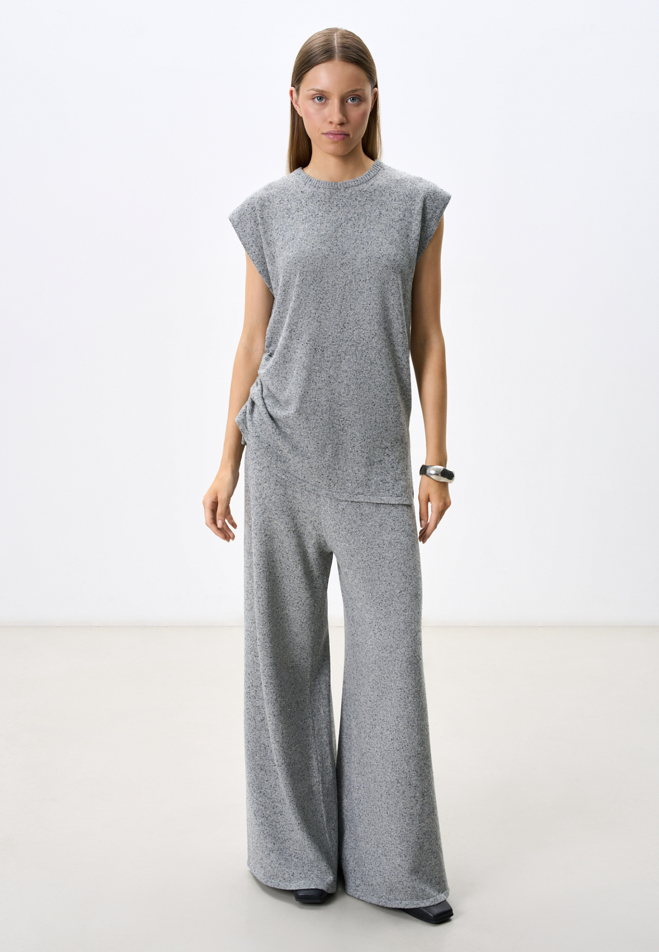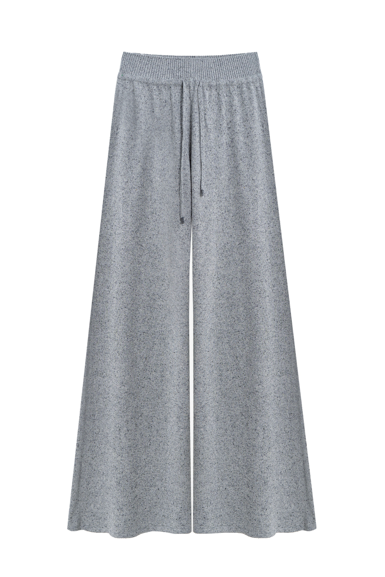Трикотажные меланжевые брюки из мягкой шерсти с добавлением шелка и вискозы. Модель прямого силуэта с широким поясом на кулиске. Можно дополнить жилетом из такой же пряжи.