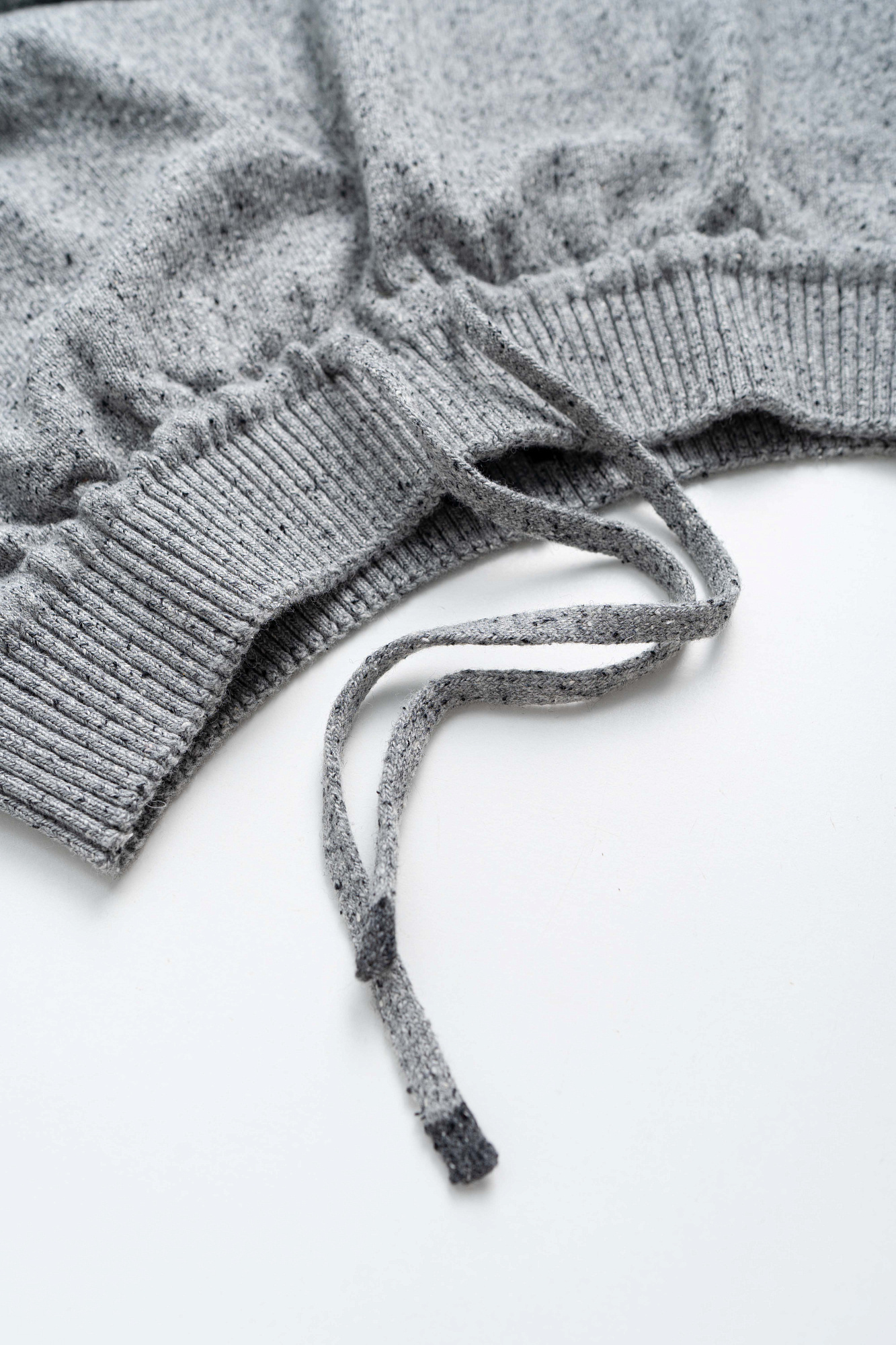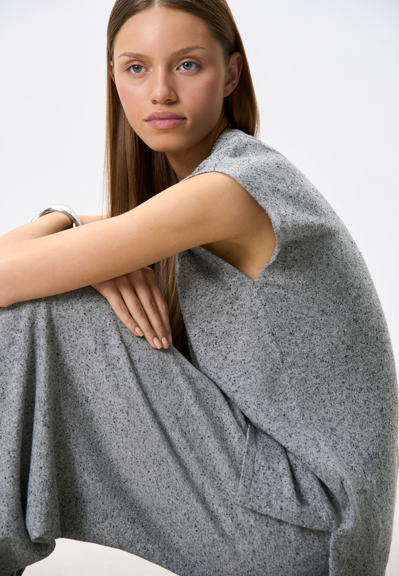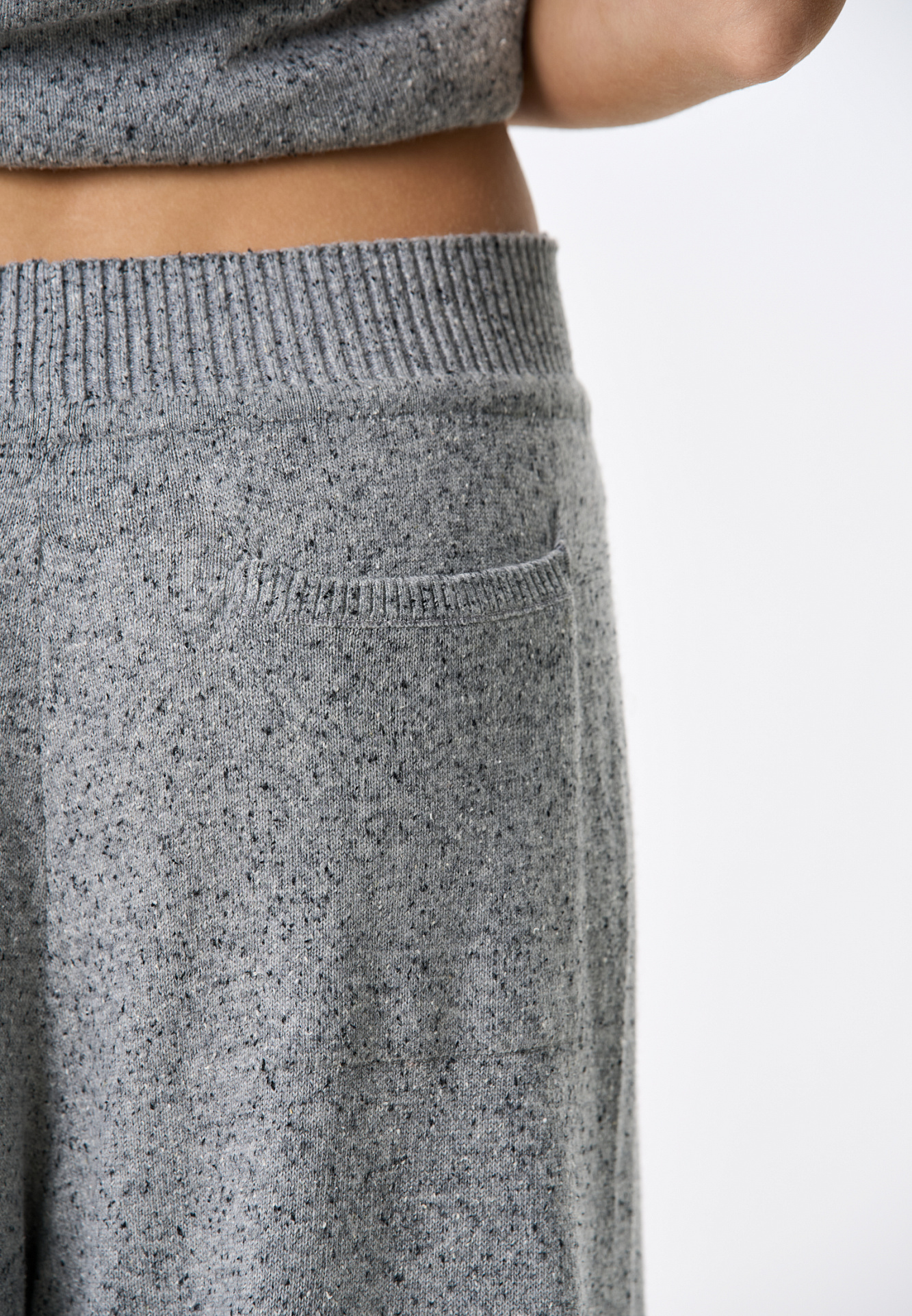 Трикотажные меланжевые брюки из мягкой шерсти с добавлением шелка и вискозы. Модель прямого силуэта с широким поясом на кулиске. Можно дополнить жилетом из такой же пряжи.