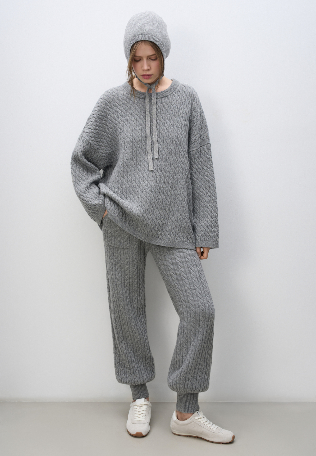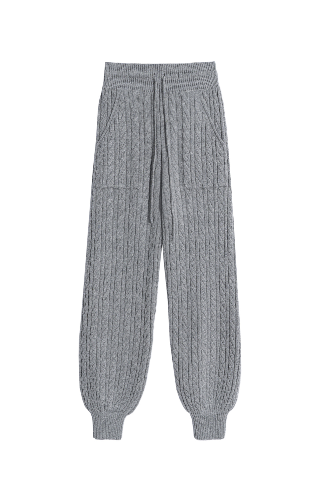 Трикотажные брюки-джоггеры из кашемира и шерсти с объемными косами. Модель с эластичным поясом, большими накладными карманами и манжетами в рубчик.