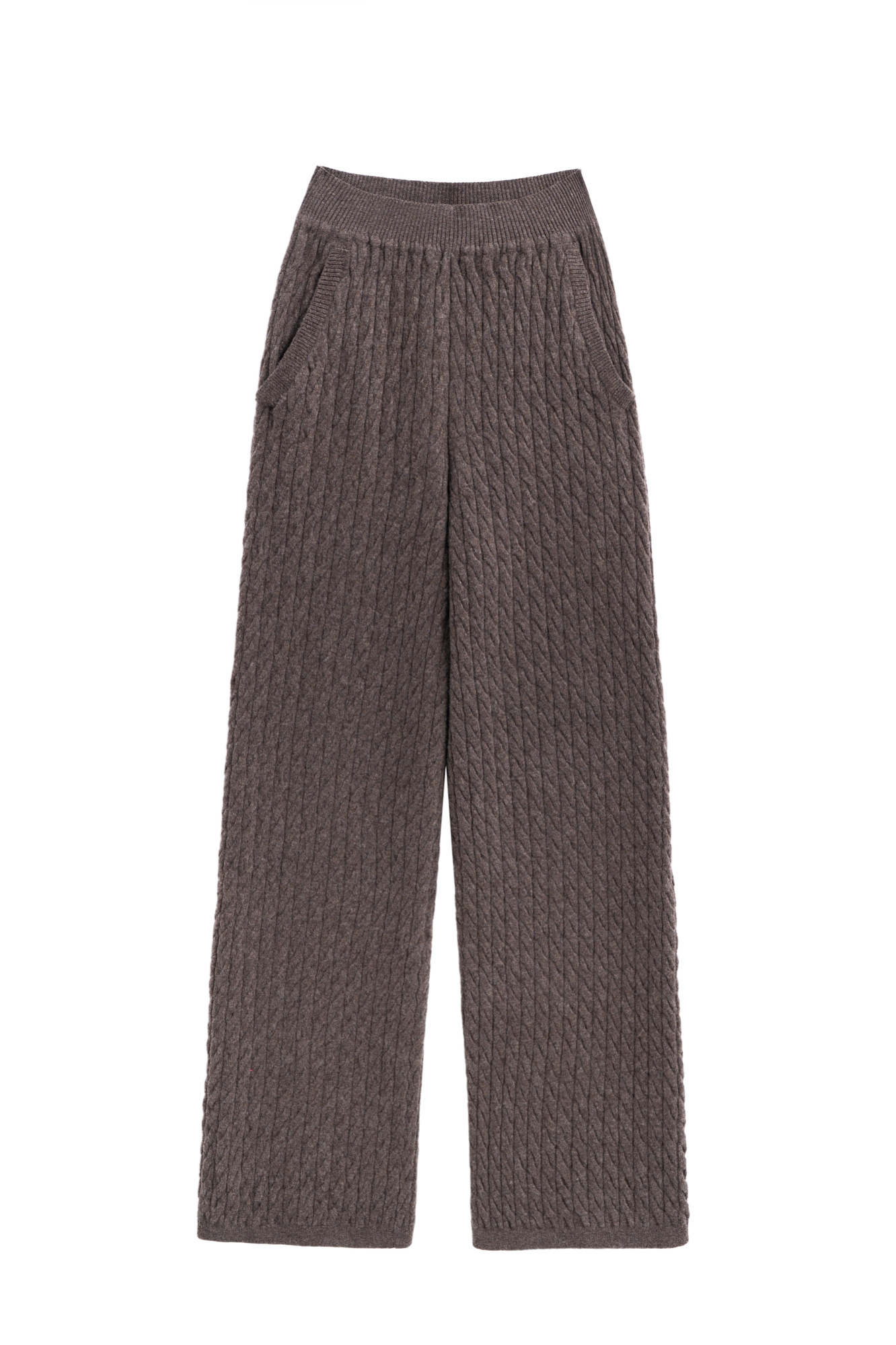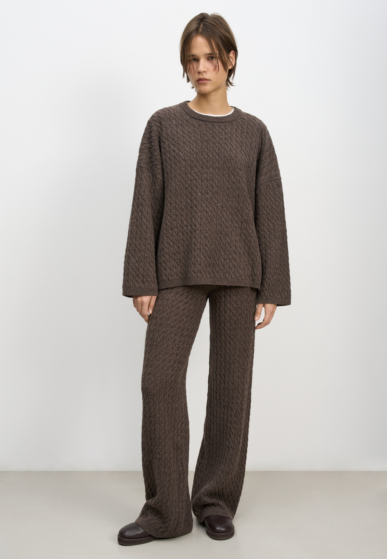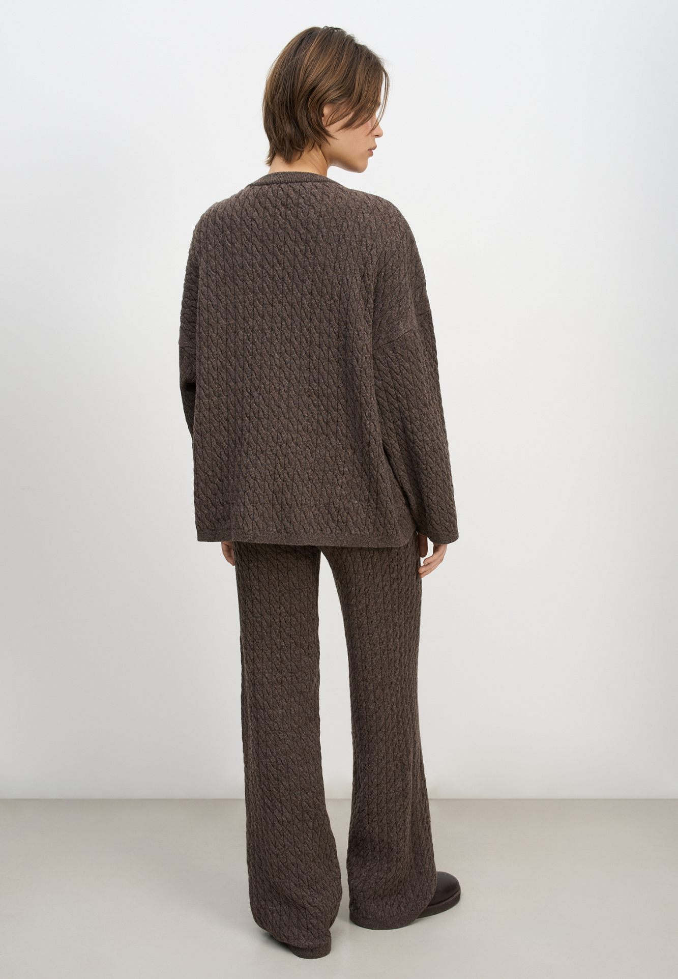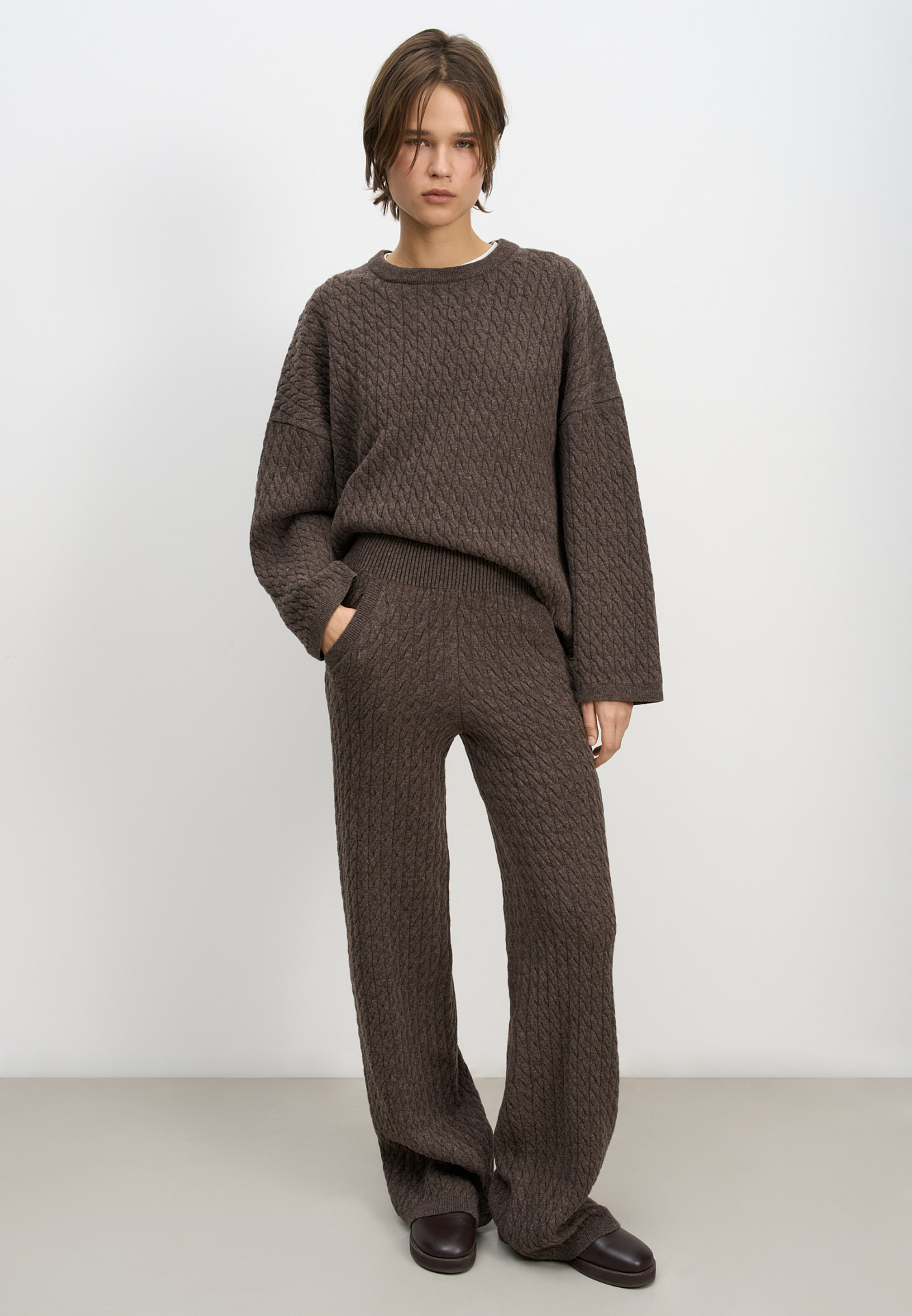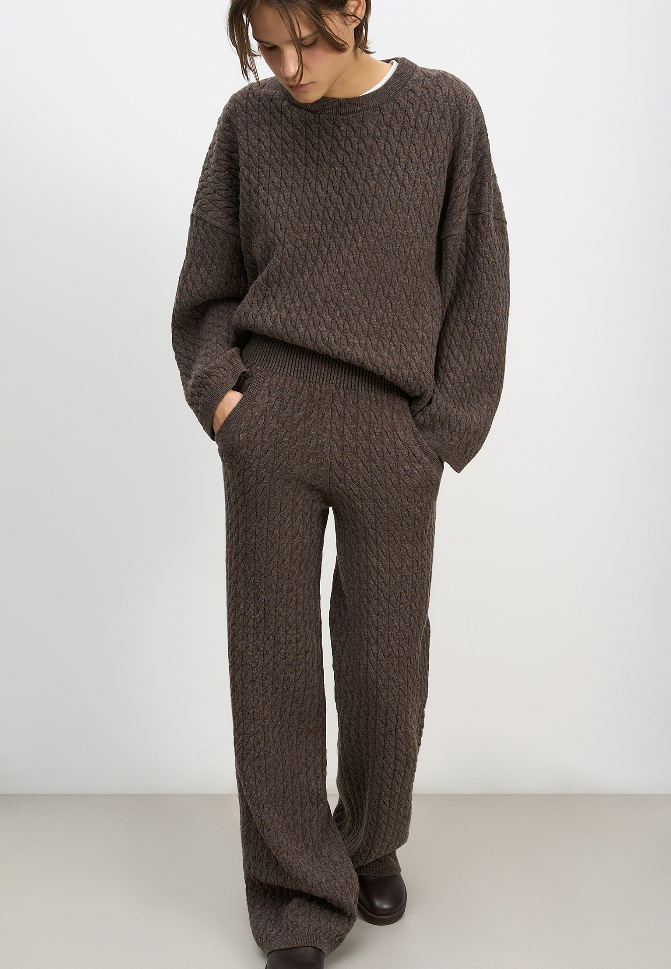 Трикотажные брюки с объемными косами из 100% шерсти мериноса экстрафайн. Модель на эластичной резинке и глубокими боковыми карманами.