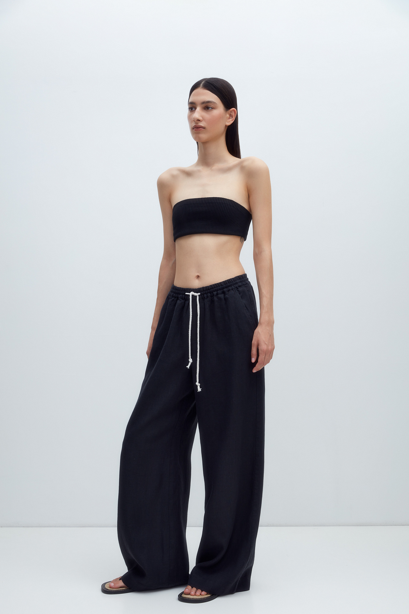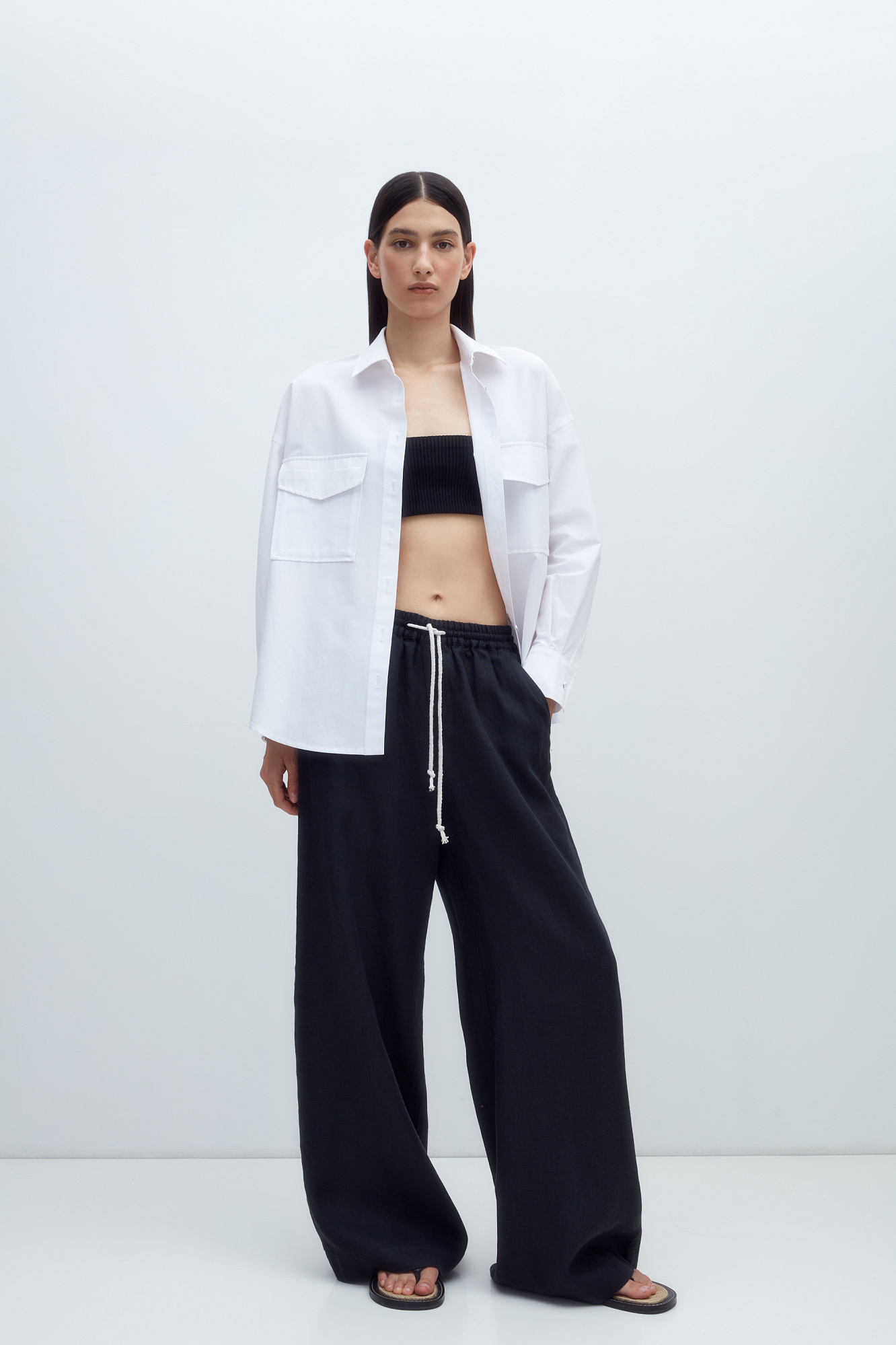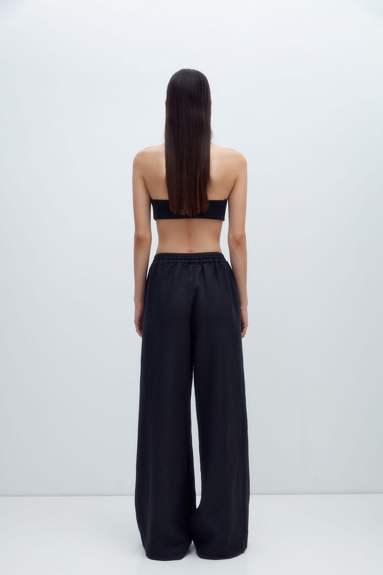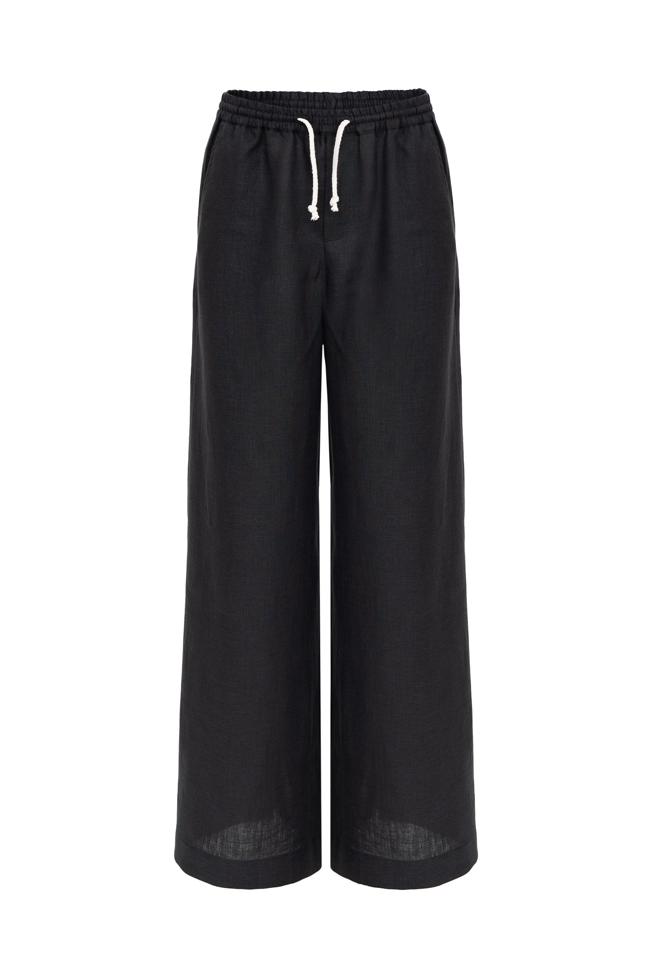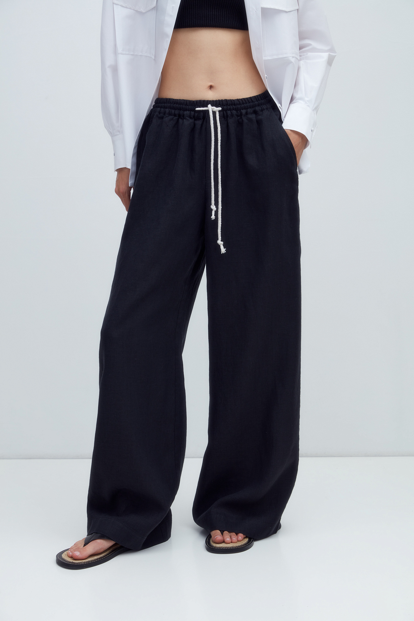 Широкие льняные брюки. Модель прямого силуэта с боковыми карманами и эластичным поясом на резинке с кулиской.