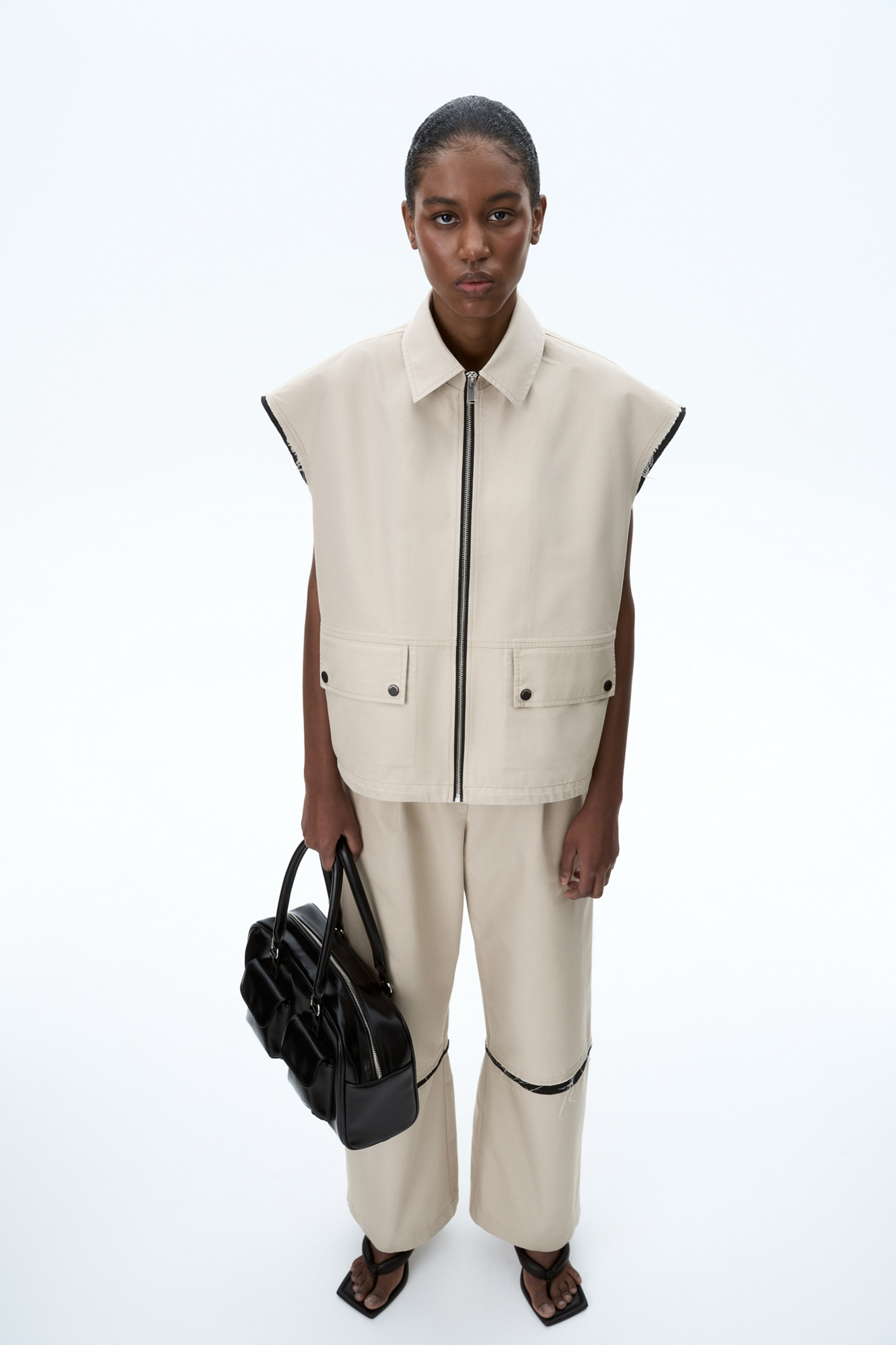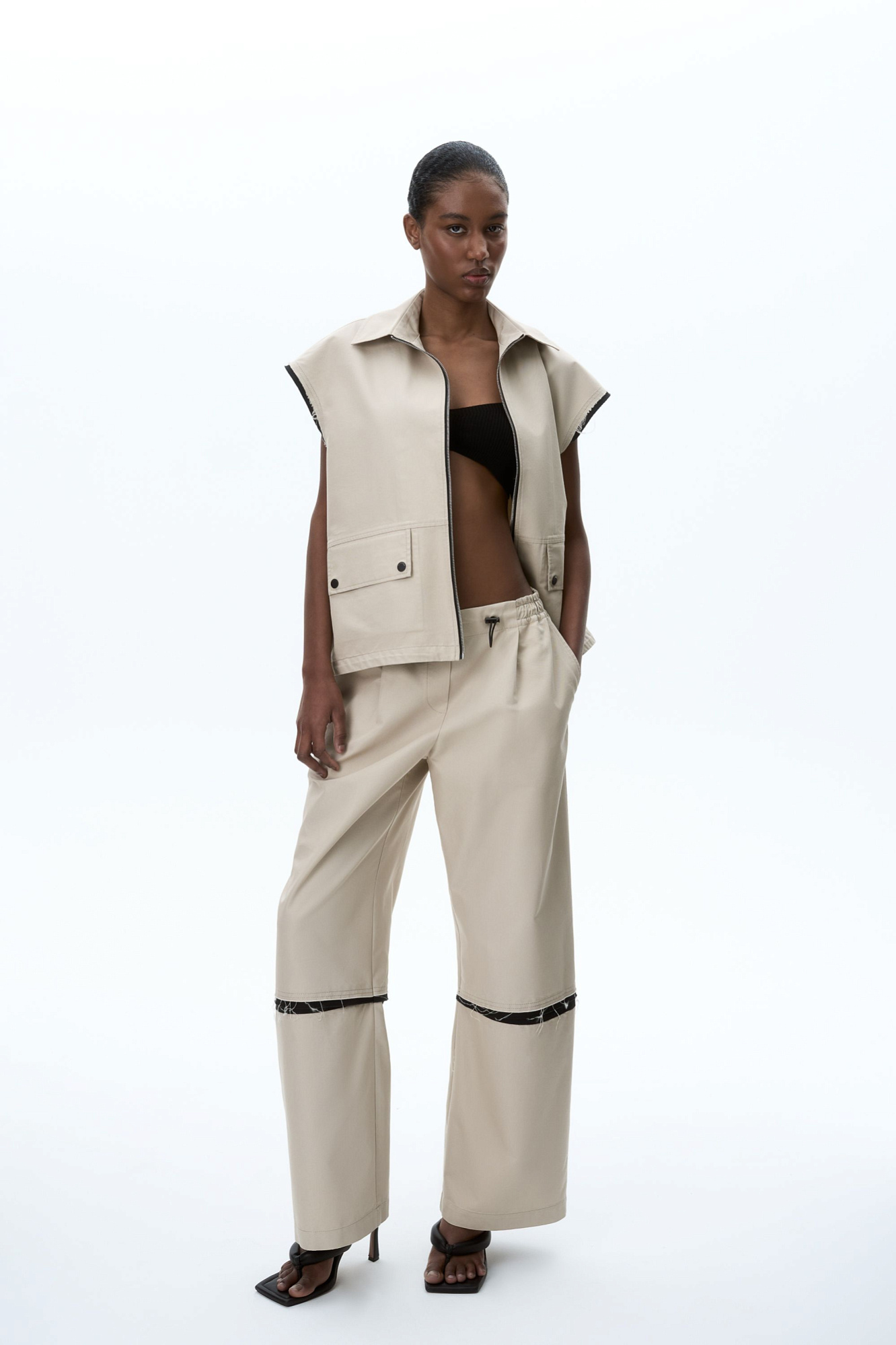 Широкие брюки со вставками. Модель свободного силуэта с боковыми карманами и эластичным поясом на резинке с кулиской. Дополнить образ можно жилетом в таком же стиле.