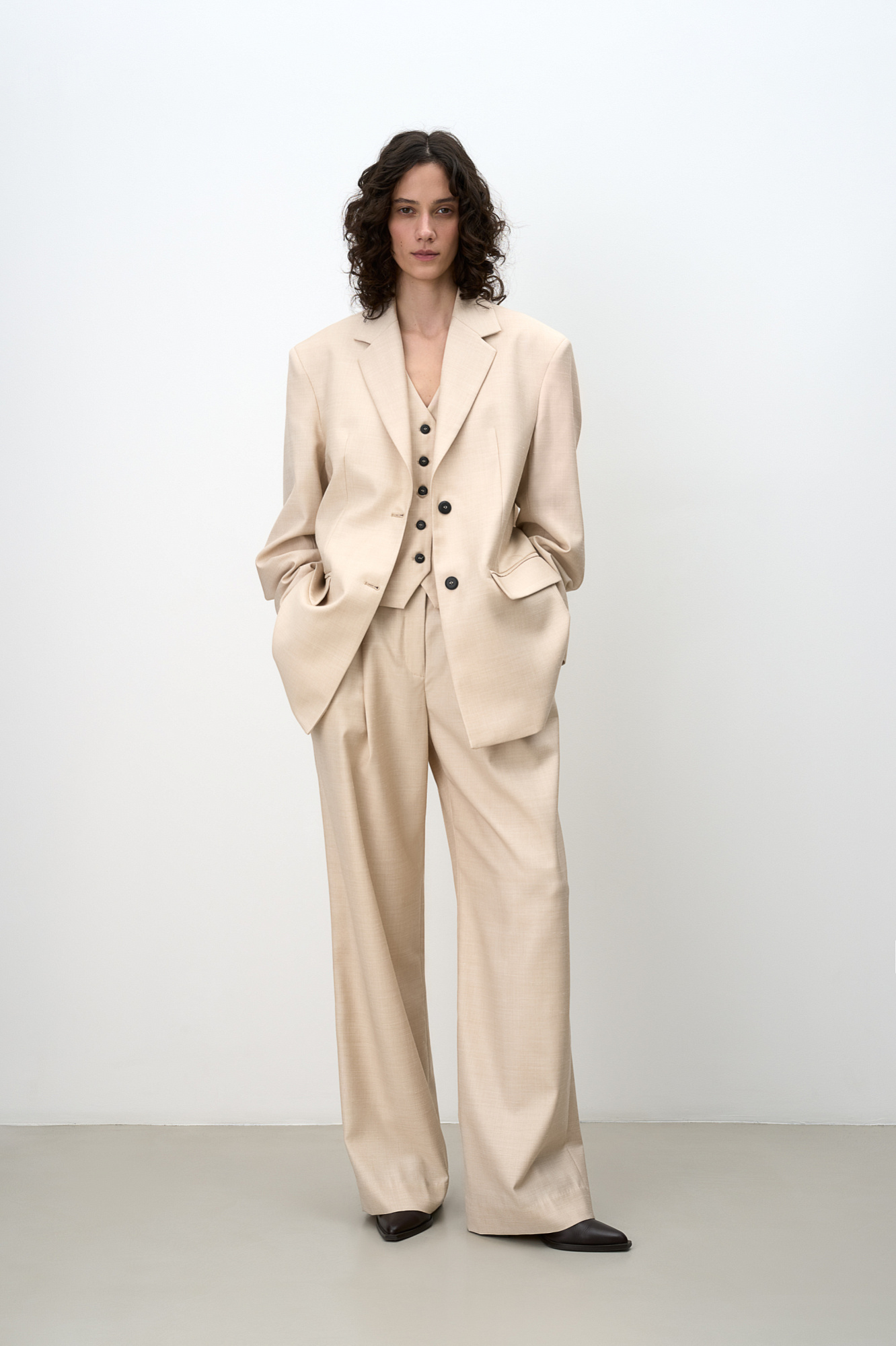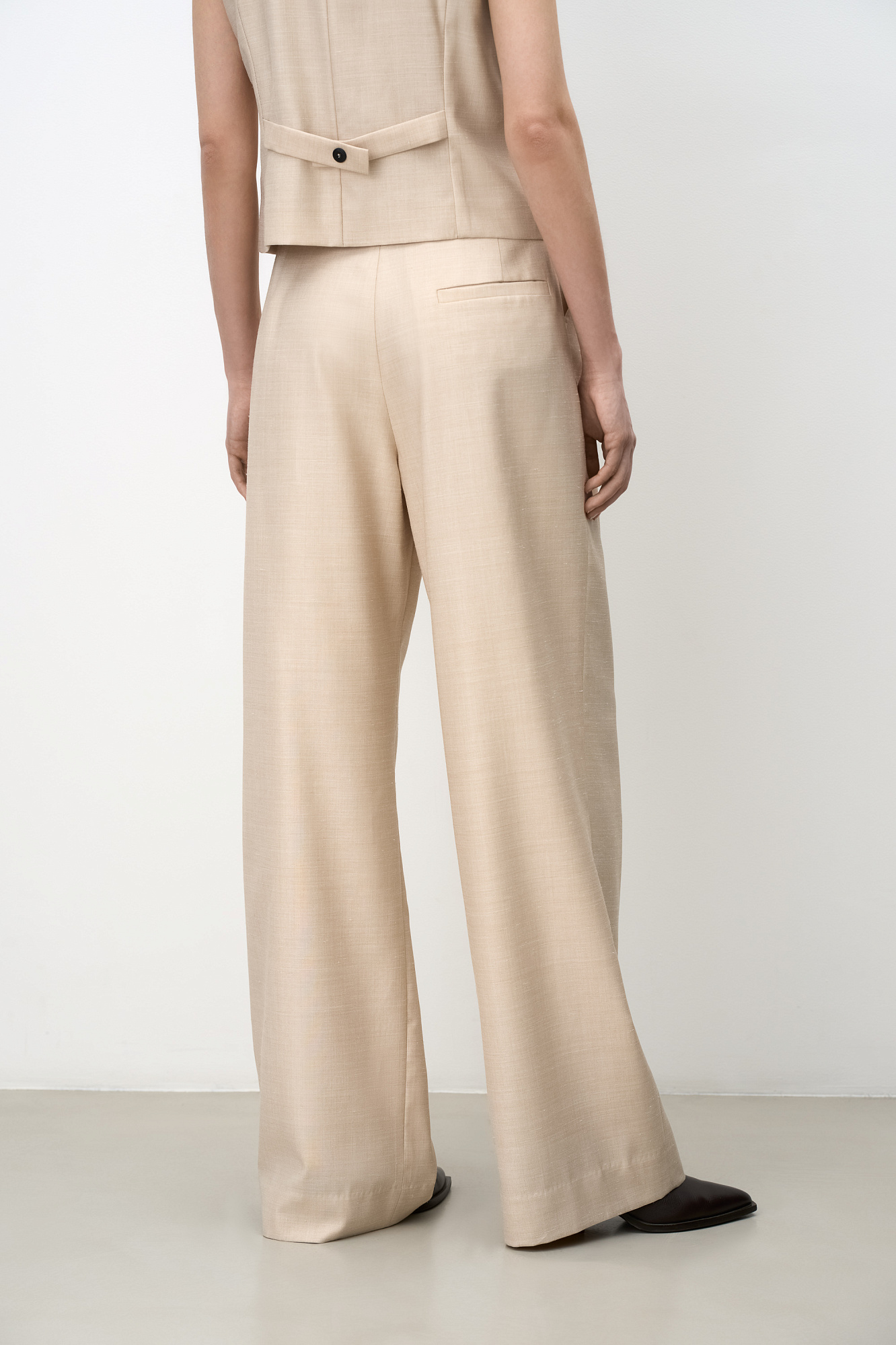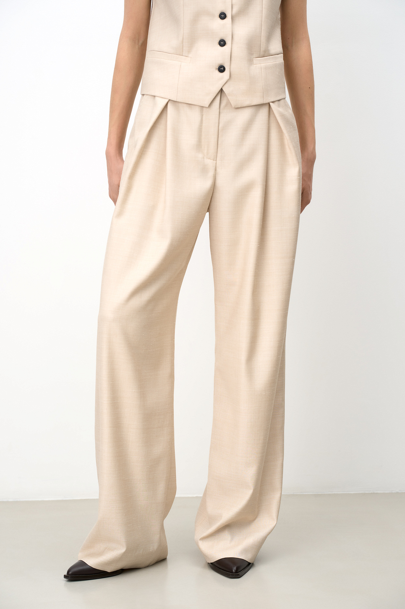 Классические брюки из смесовой шерсти с текстурой. Модель прямого кроя с косыми складками и объемными защипами спереди, шлевками на поясе для ремня и карманами. Застежка на молнию и скрытую пуговицу. Дополнить образ можно жакетом и жилетом в таком же стиле.