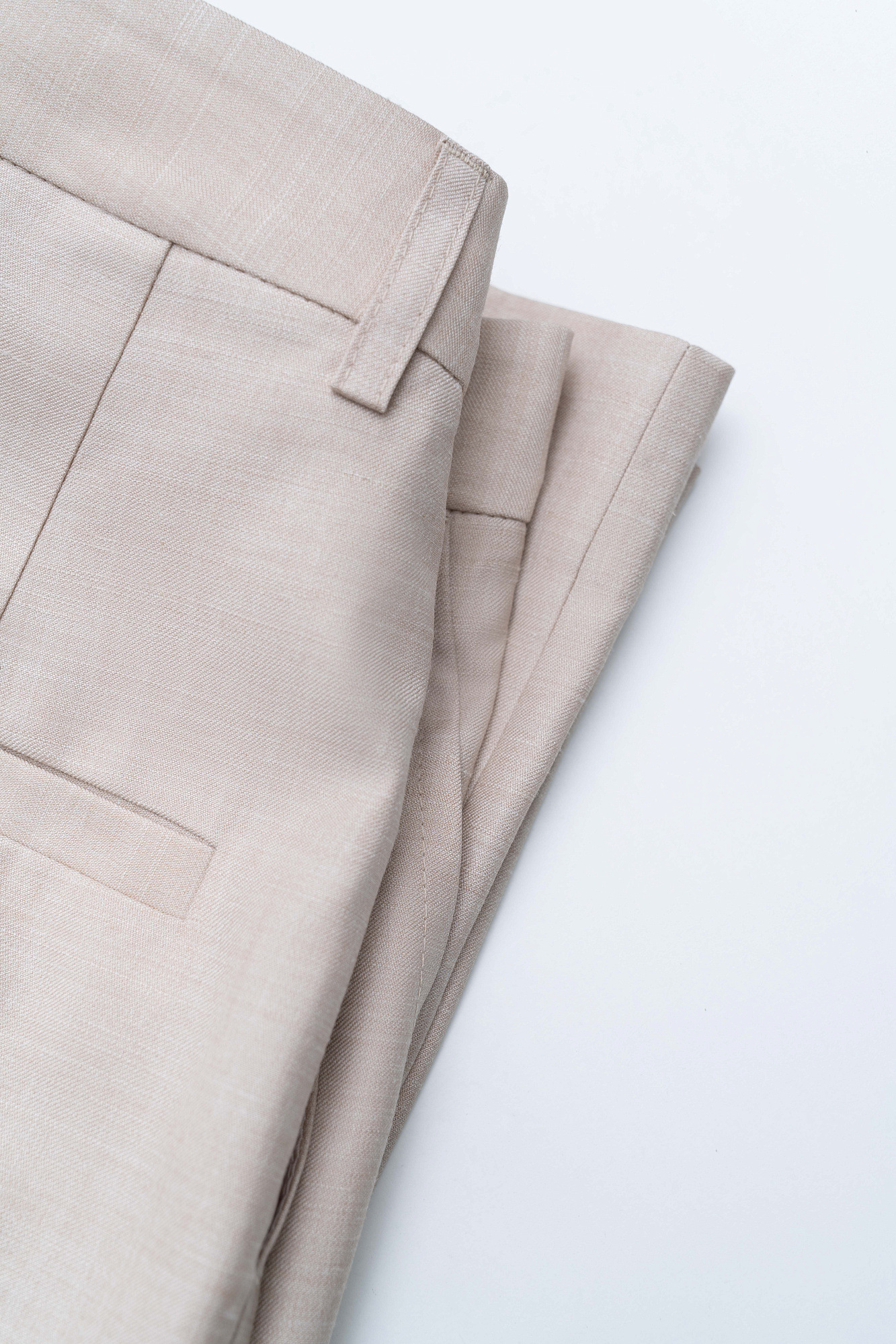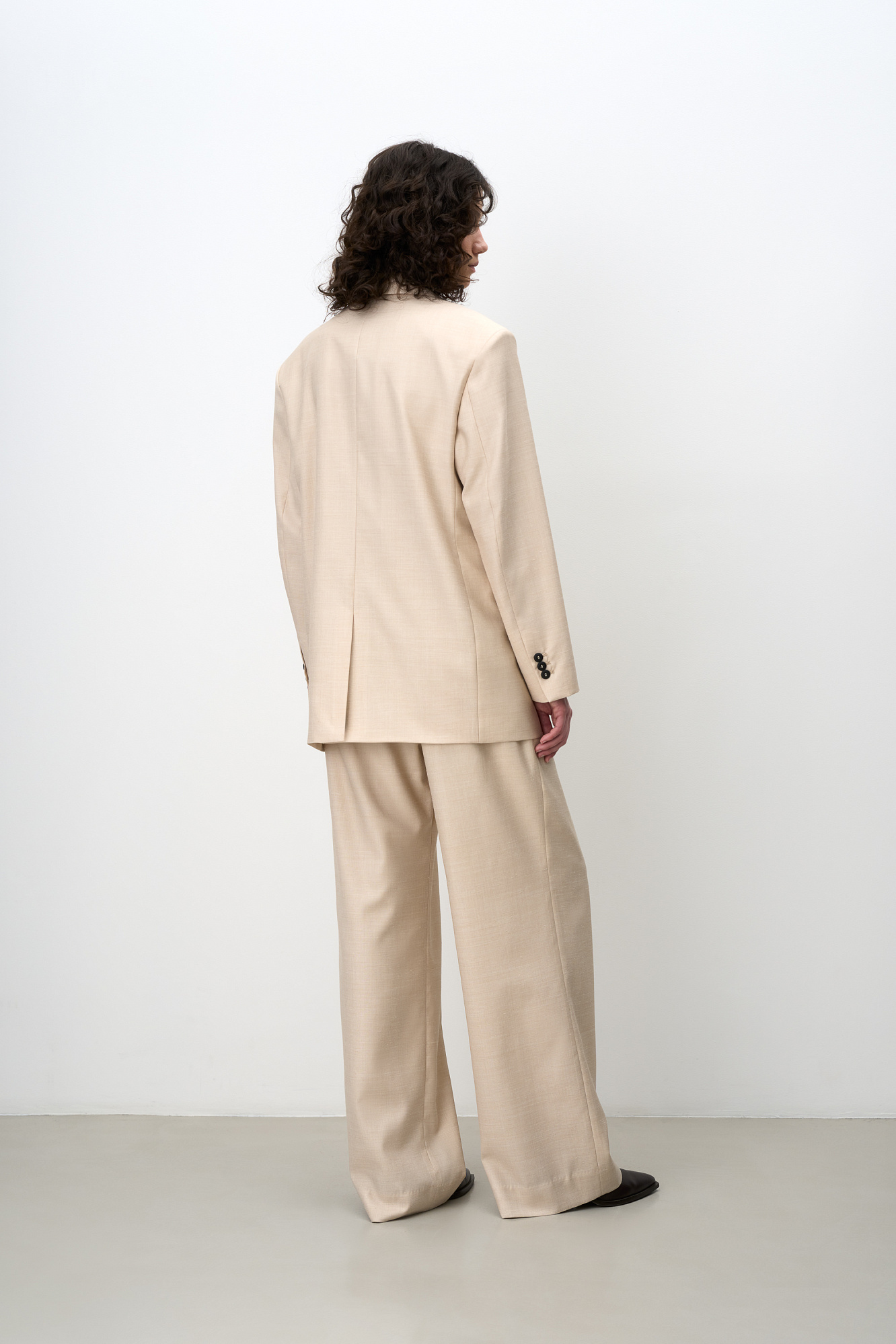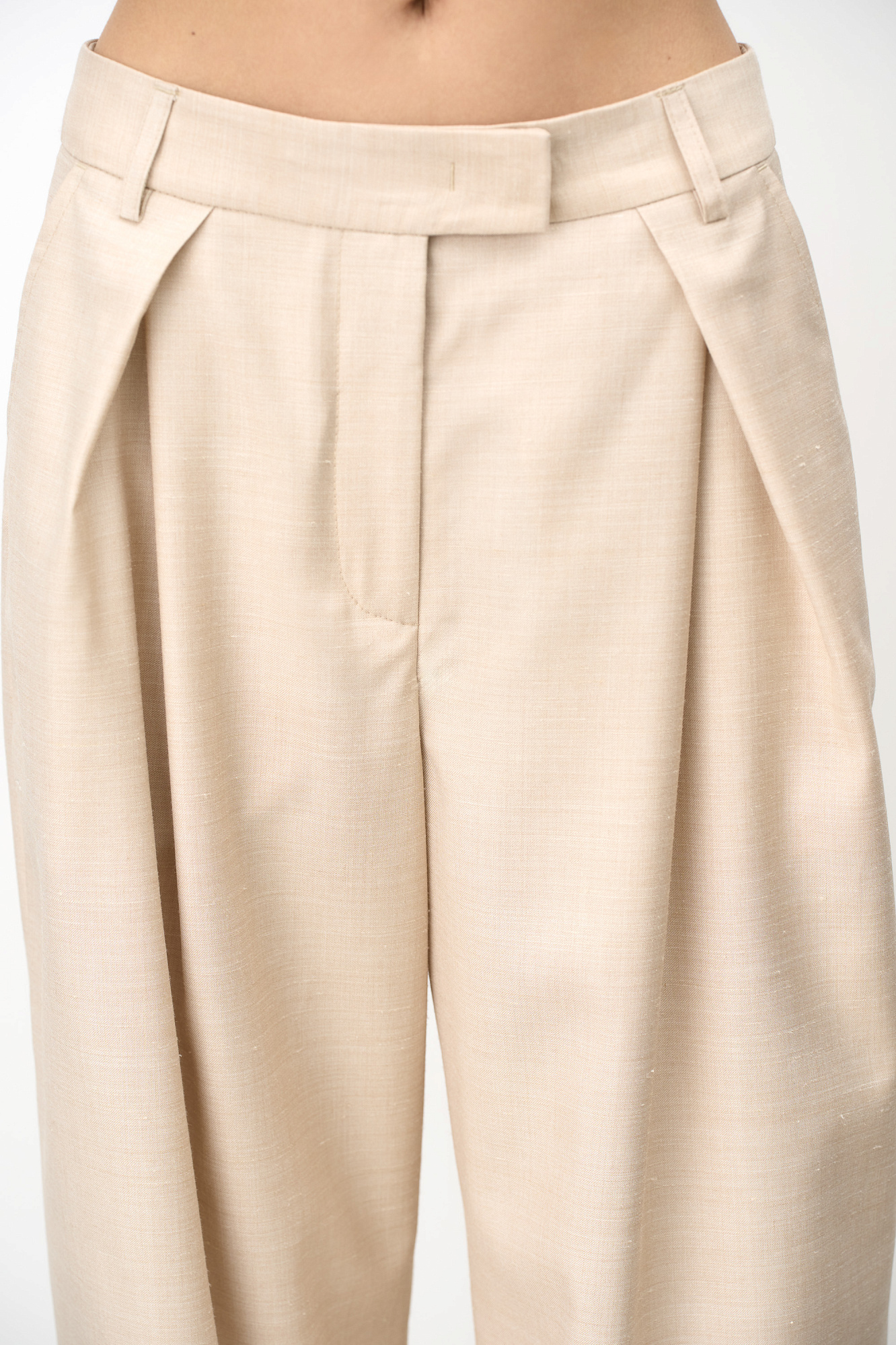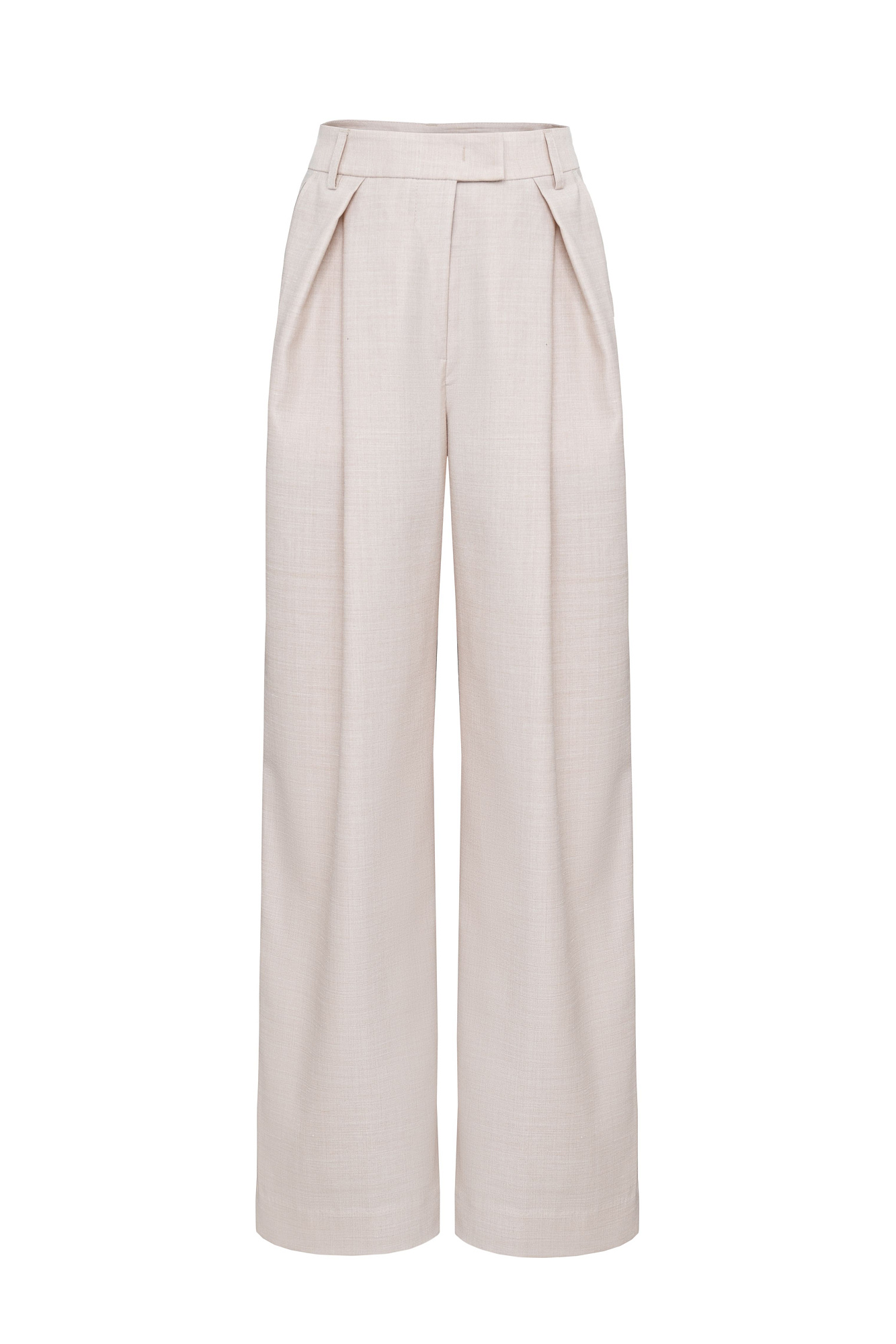 Классические брюки из смесовой шерсти с текстурой. Модель прямого кроя с косыми складками и объемными защипами спереди, шлевками на поясе для ремня и карманами. Застежка на молнию и скрытую пуговицу. Дополнить образ можно жакетом и жилетом в таком же стиле.