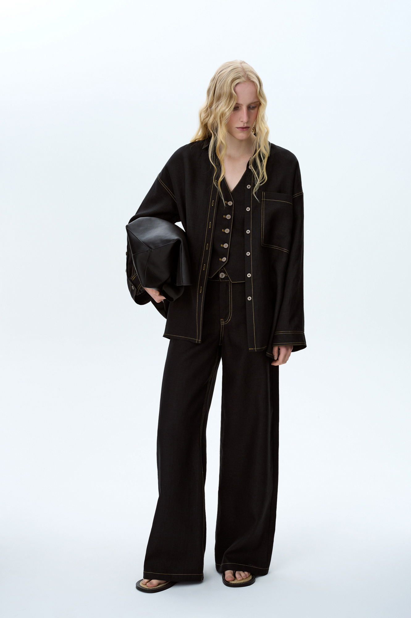 Брюки из 100% льна. Модель прямого кроя с небольшим расклешением. Пять карманов. Застежка на молнию и металлическую пуговицу. Дополнить образ можно жилетом и рубашкой в таком же стиле.