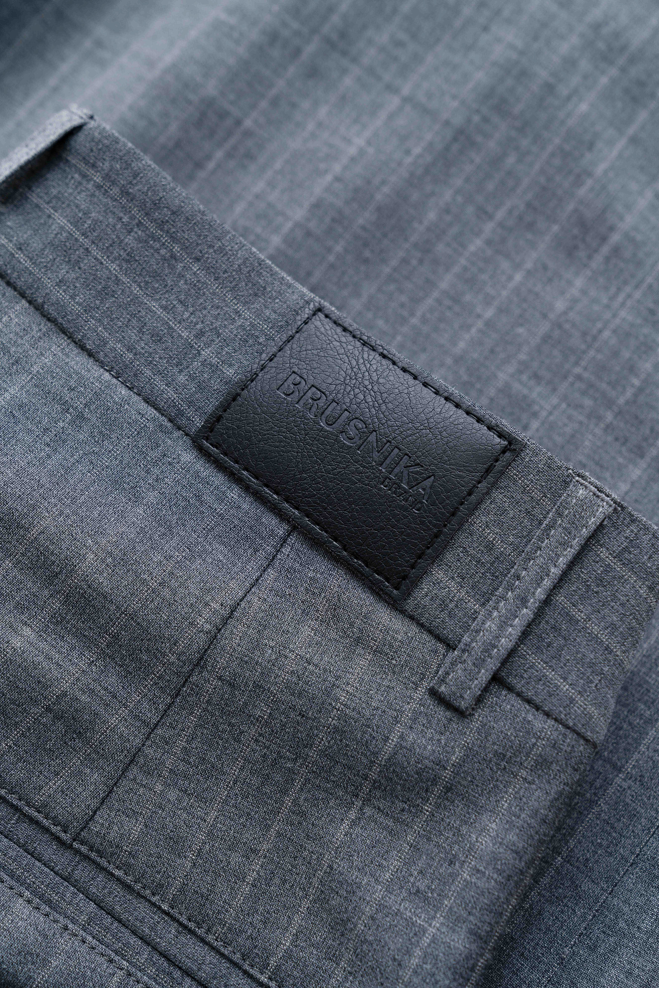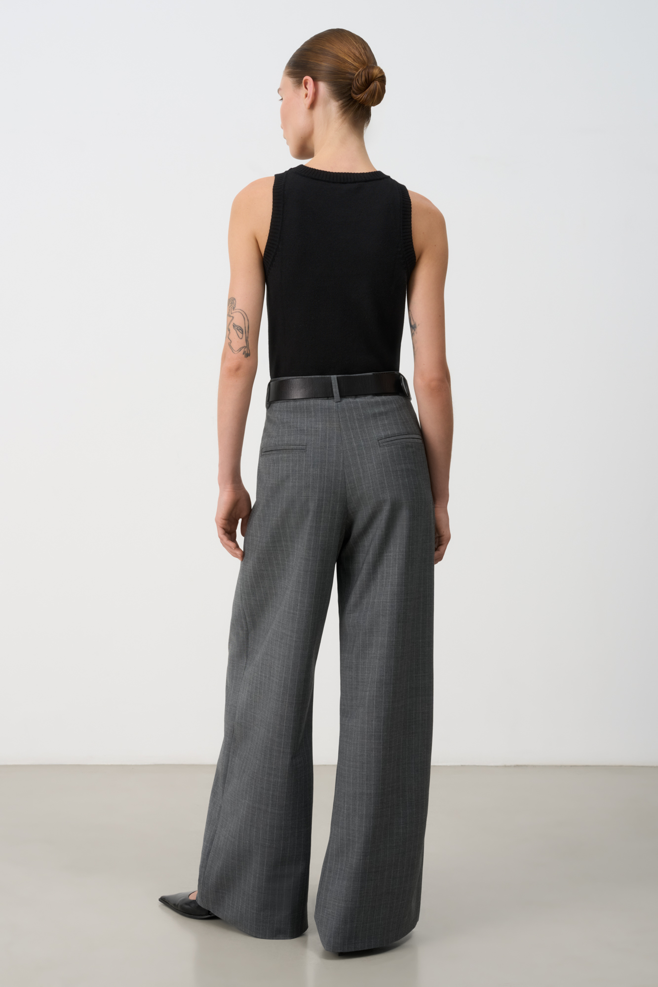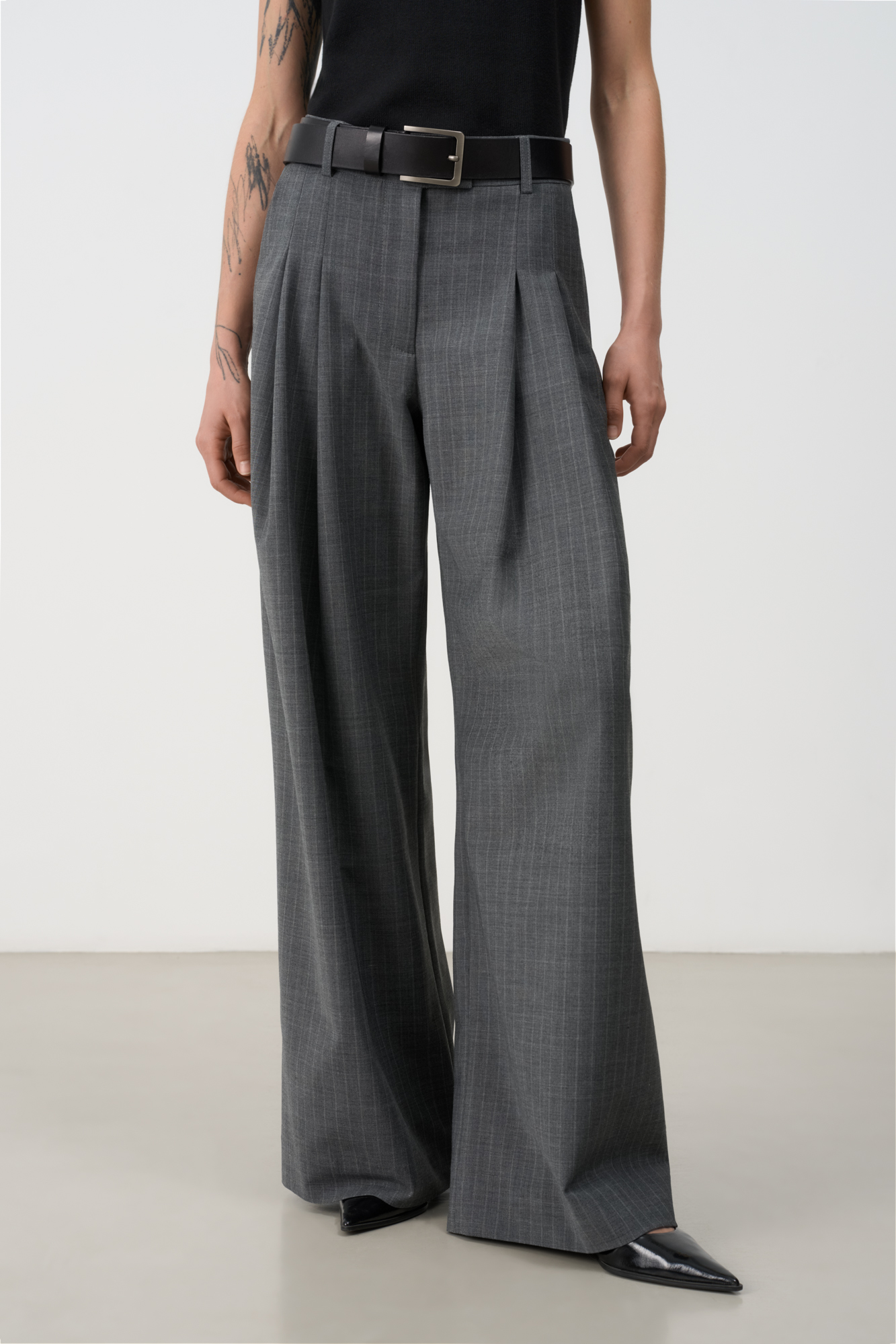 Широкие брюки палаццо в полоску. Модель свободного силуэта со средней посадкой. Боковые карманы, застежка на молнию и крючок.