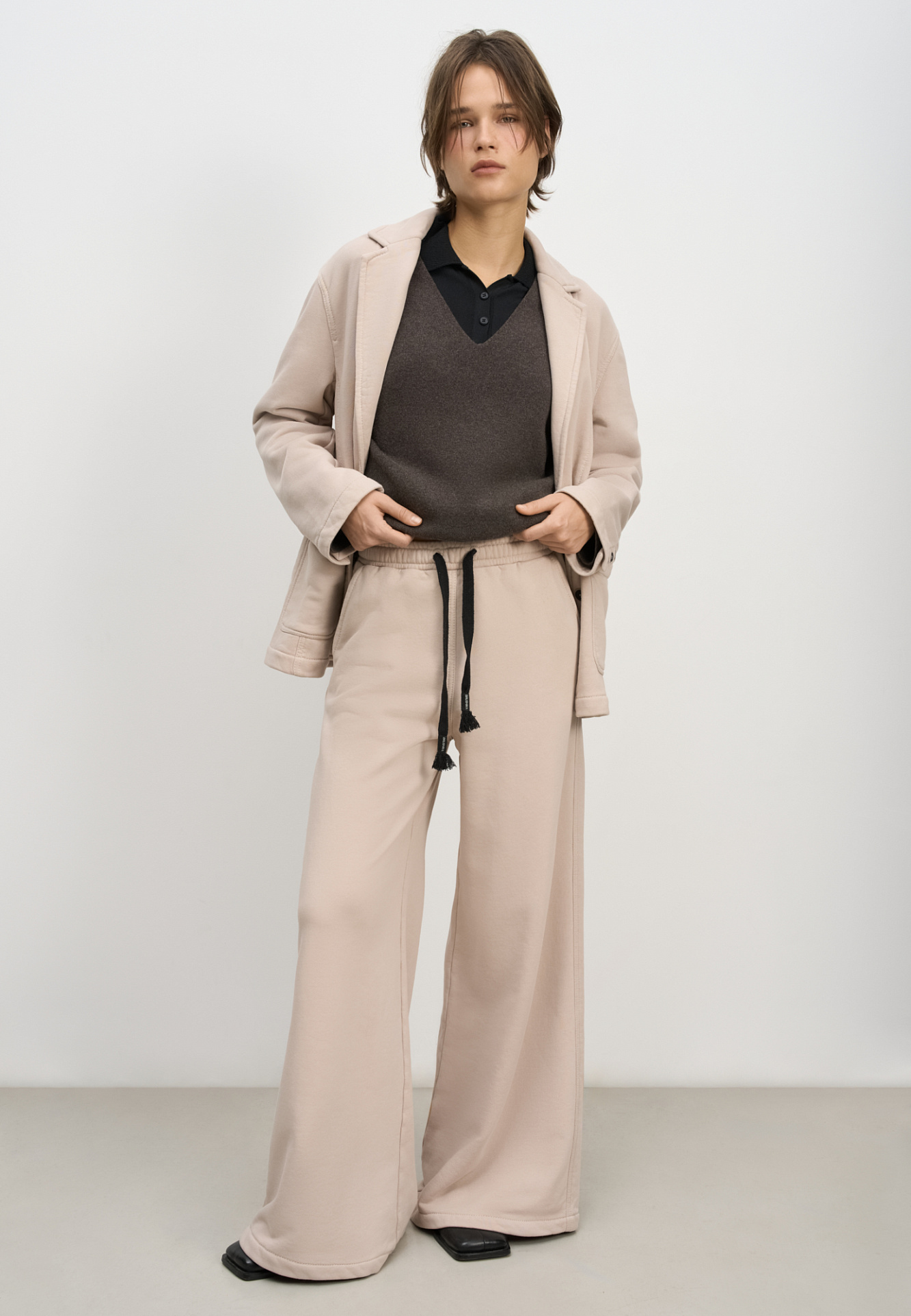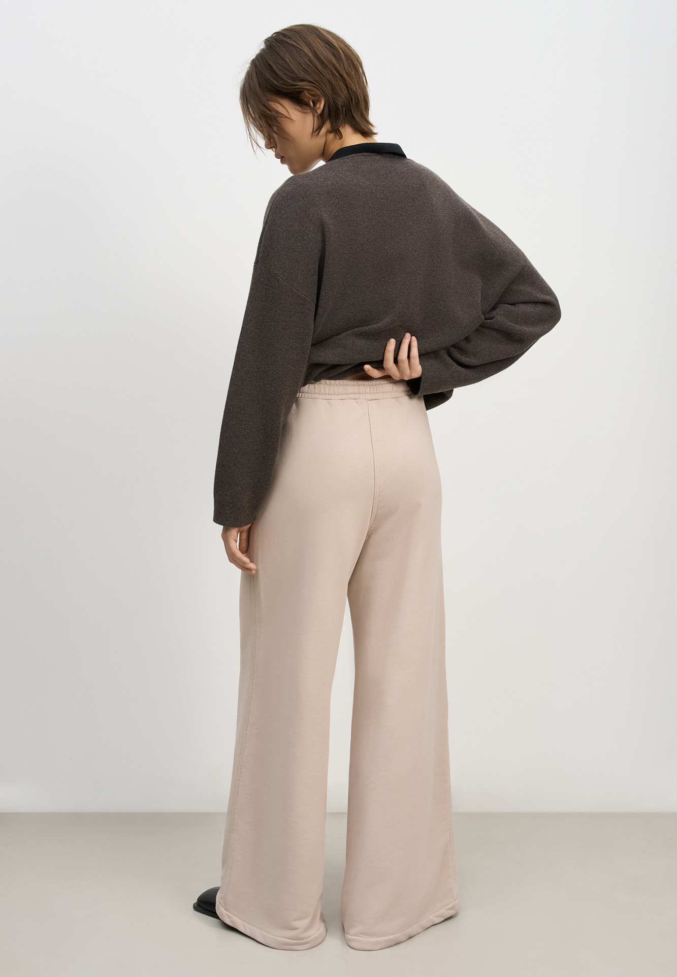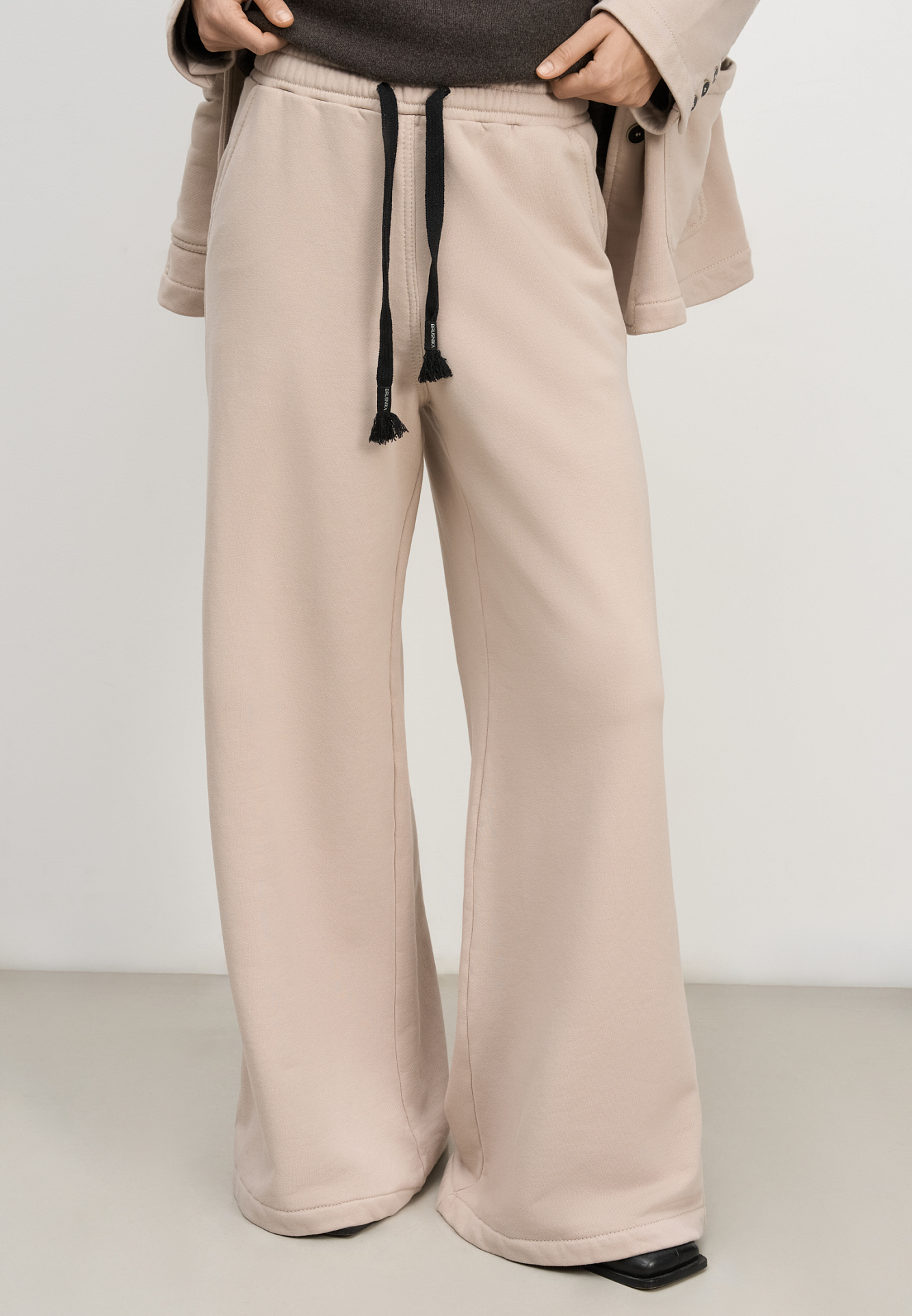 Широкие брюки из 100% хлопка с эластичным поясом на резинке, боковыми карманами и контрастной отстрочкой. Дополнить образ можно жакетом в таком же стиле.