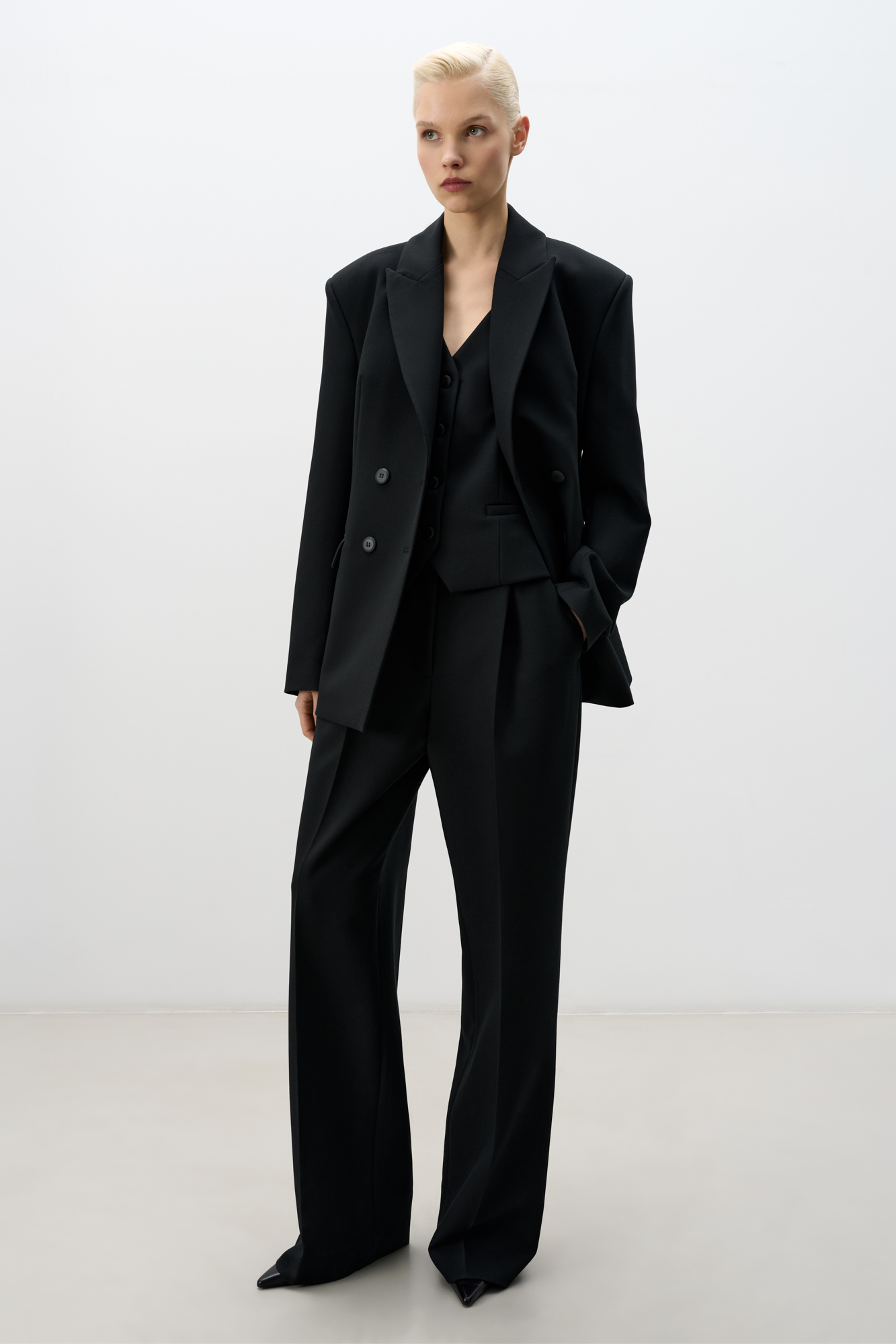 Классические брюки из поливискозы. Модель прямого кроя со стрелками. Застежка по пуговицу и молнию. Шлевки на поясе для ремня. Изделие на подкладке.
