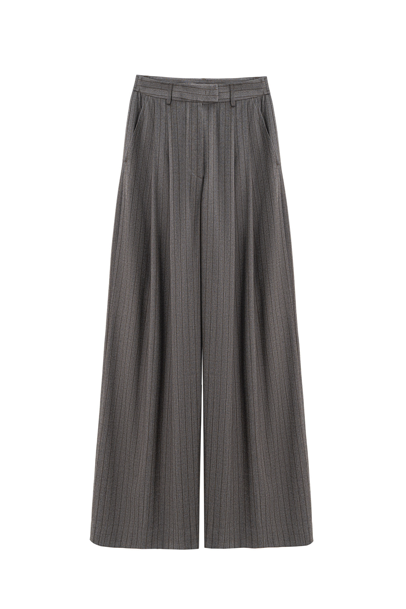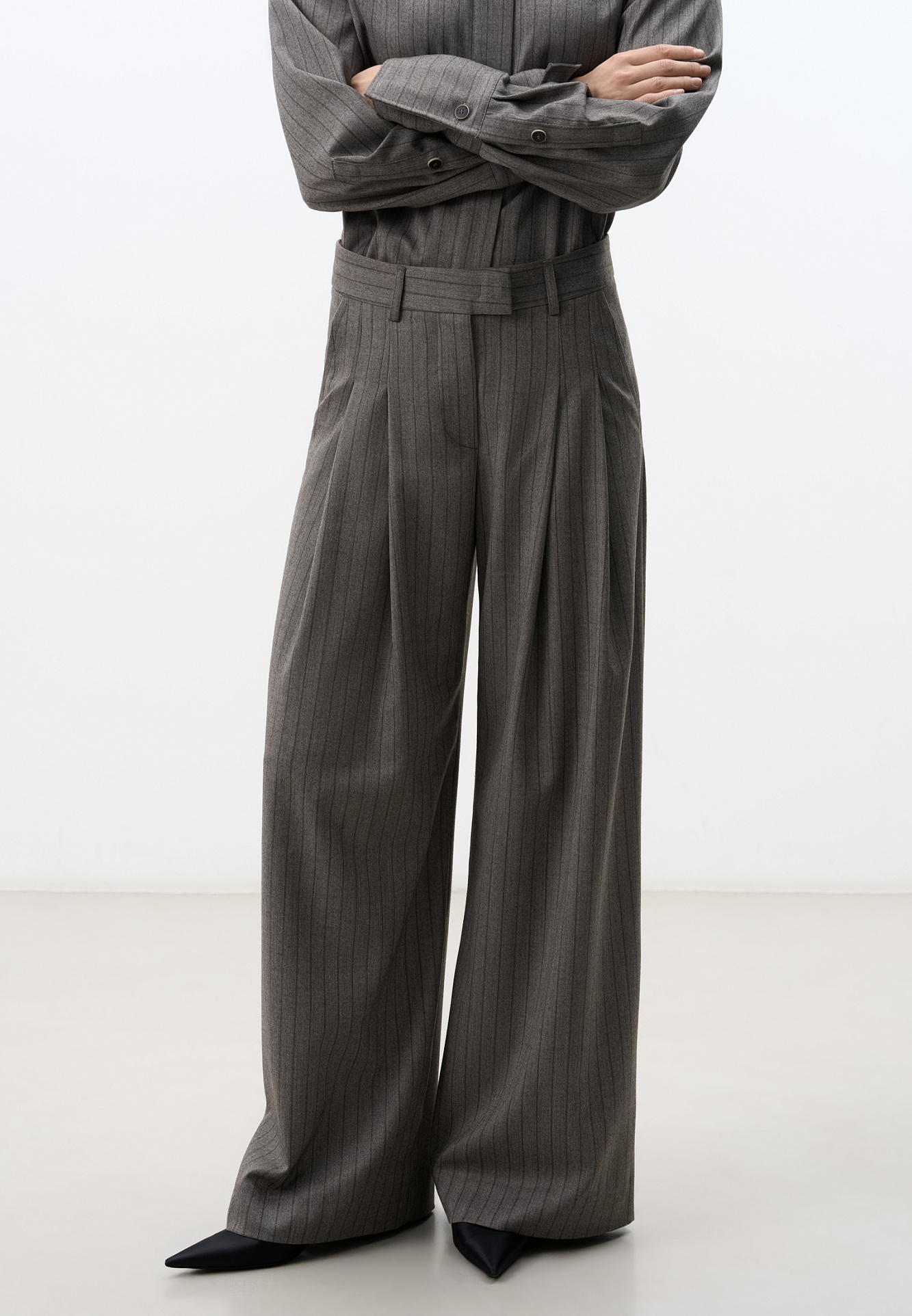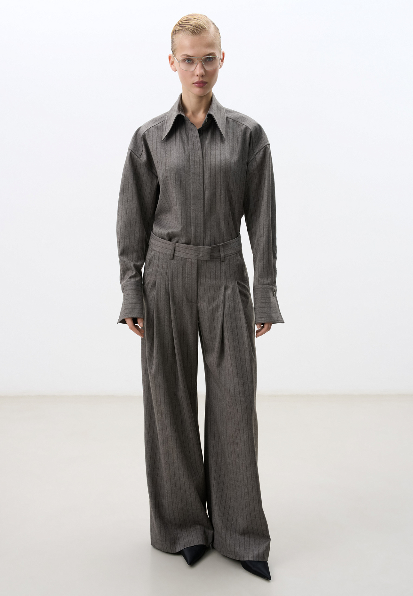Широкие офисные брюки из шерсти. Модель свободного кроя с защипами спереди, карманами, шлевками на поясе для ремня и застежкой на молнию и скрытую пуговицу.