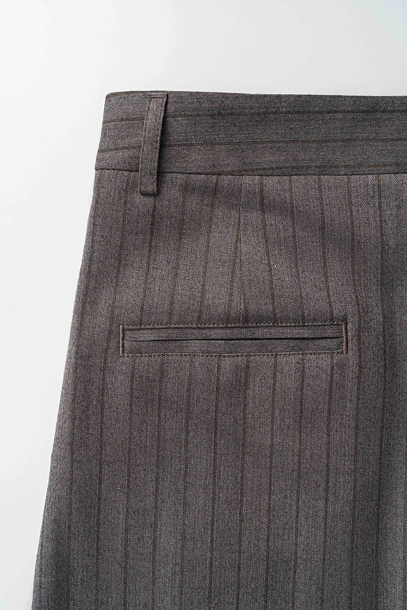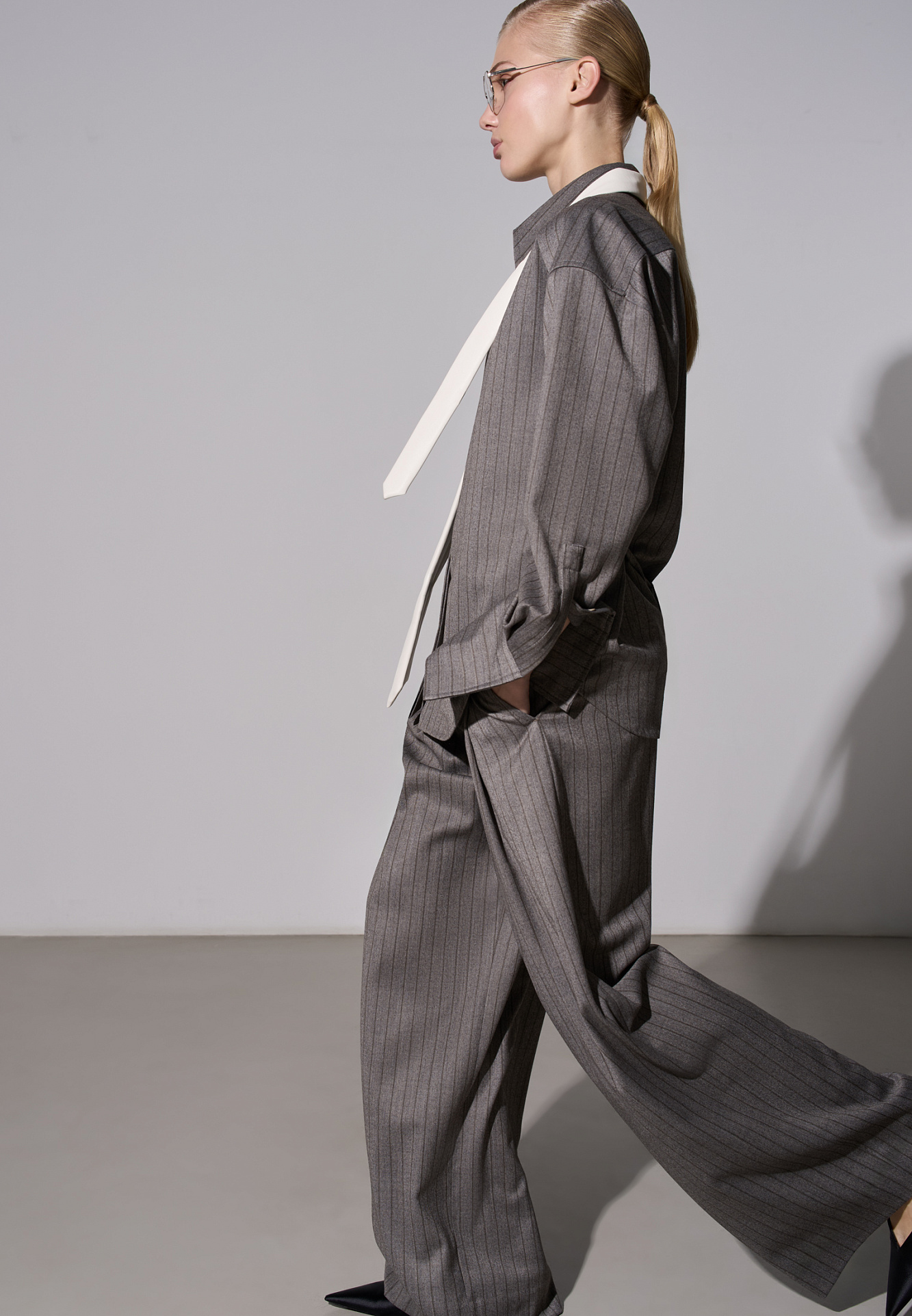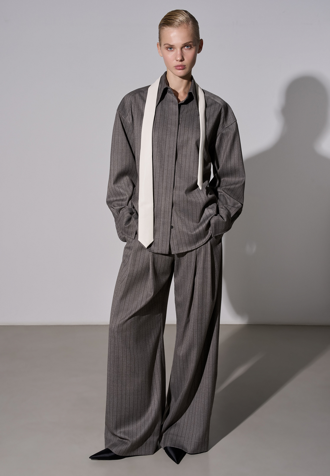 Широкие офисные брюки из шерсти. Модель свободного кроя с защипами спереди, карманами, шлевками на поясе для ремня и застежкой на молнию и скрытую пуговицу.
