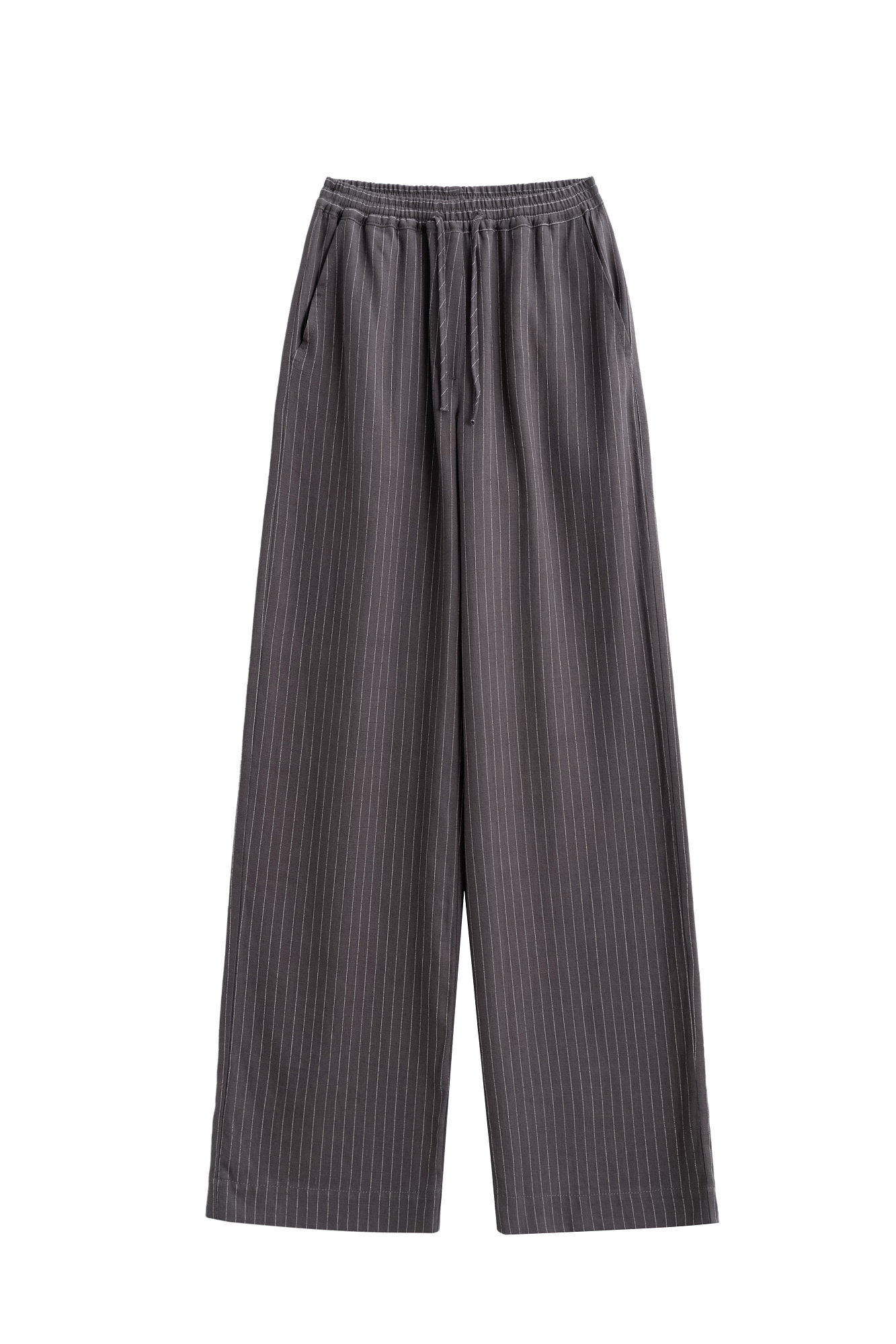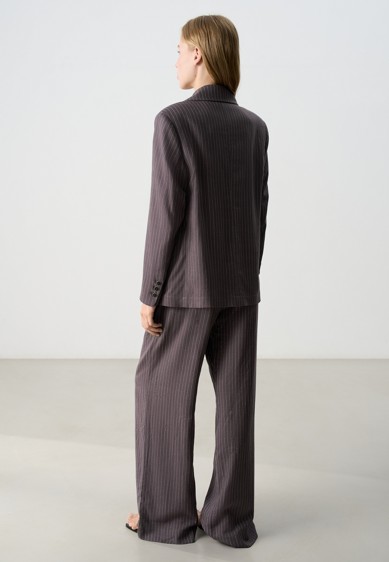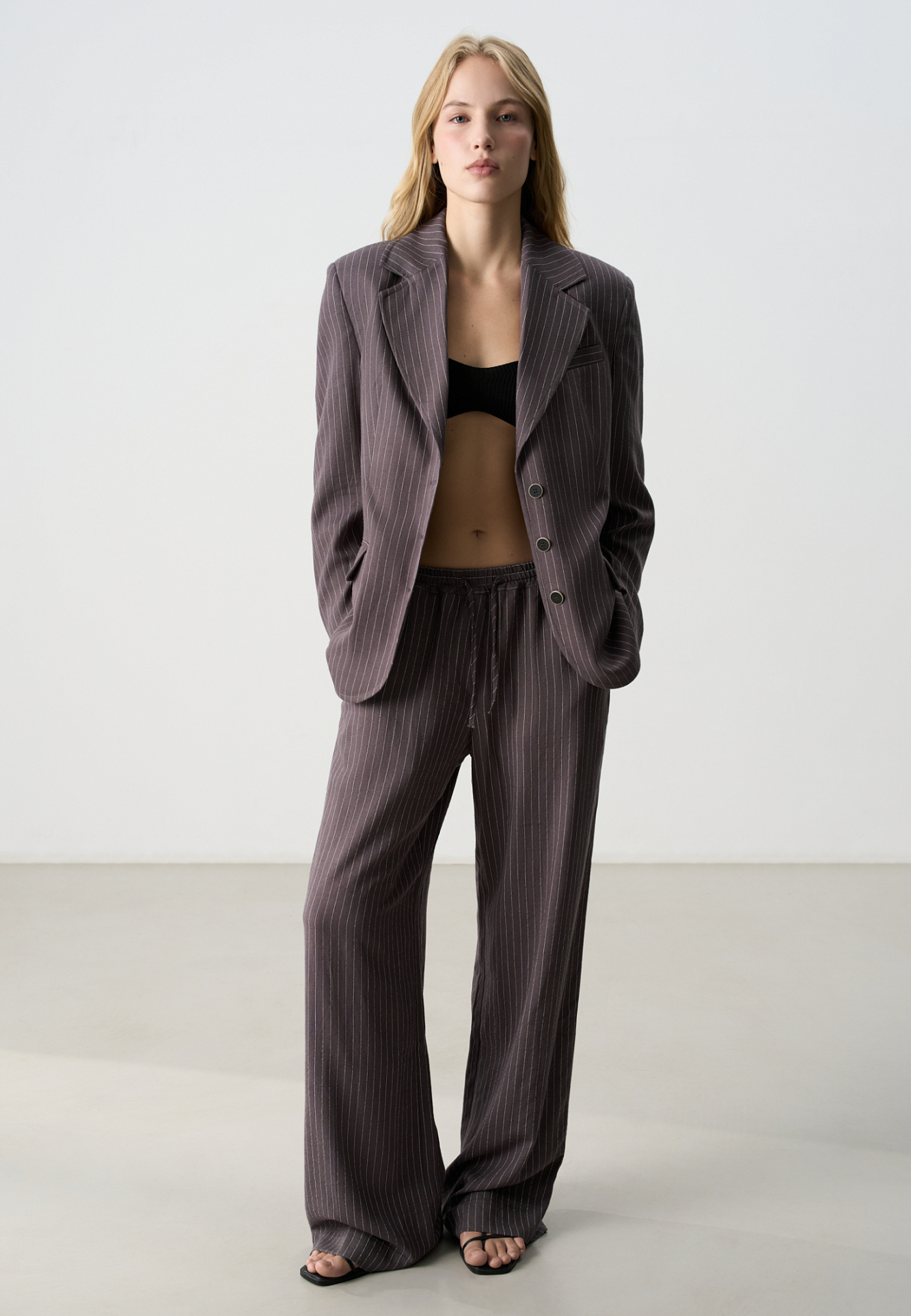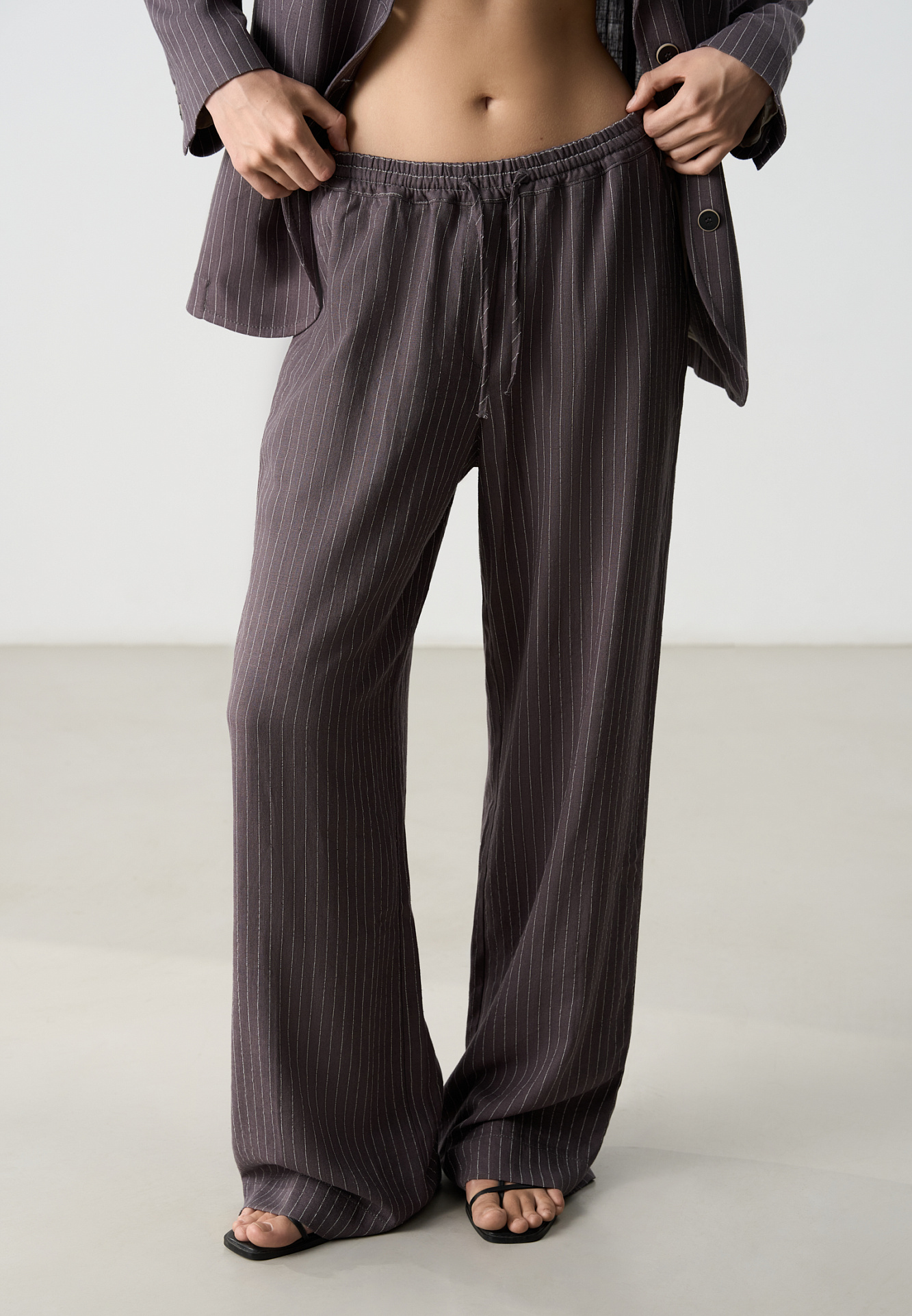 Брюки в полоску изо льна с добавлением вискозы. Модель прямого кроя, с эластичным поясом на кулиске. Дополнить образ можно жакетом.