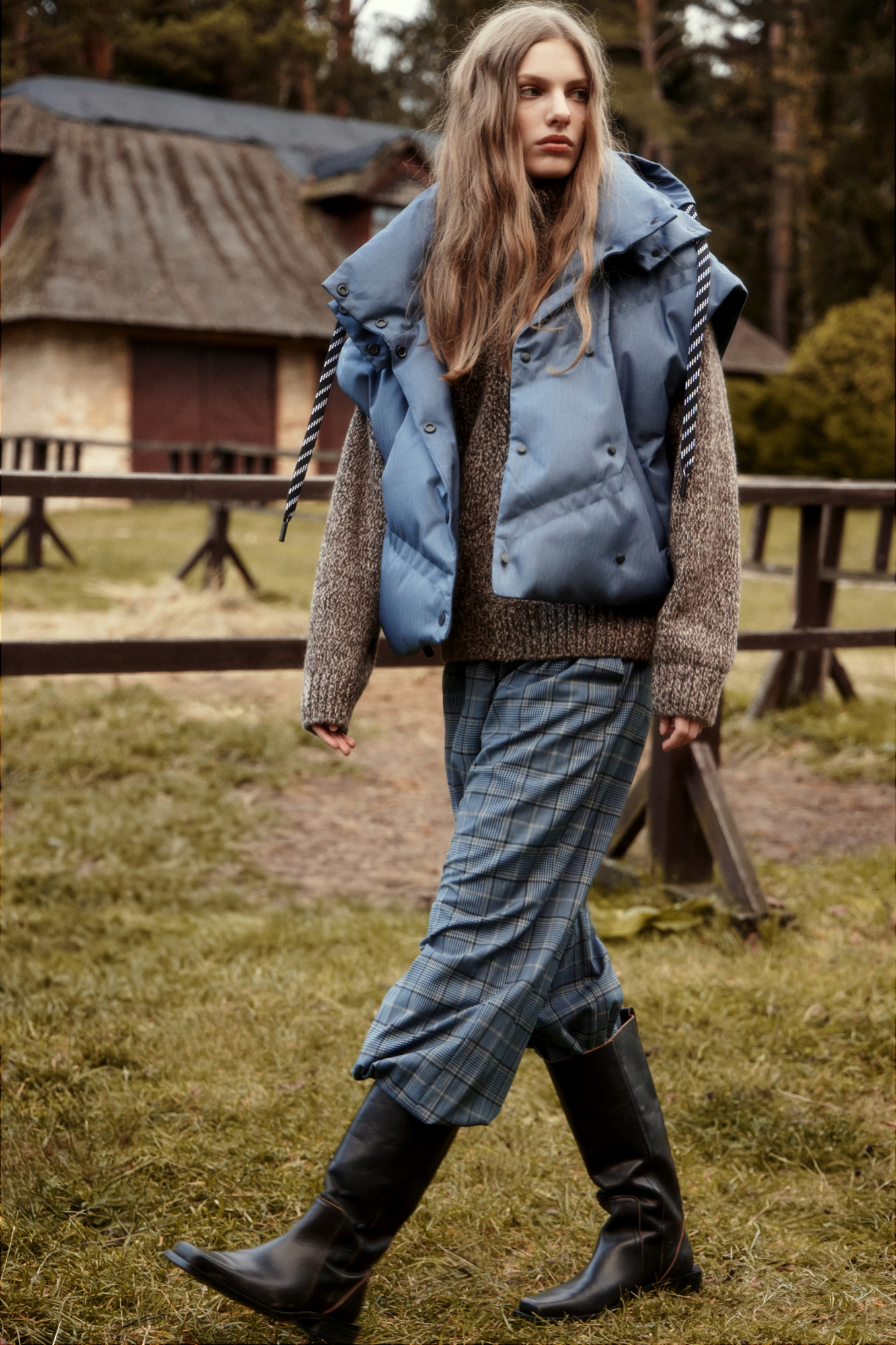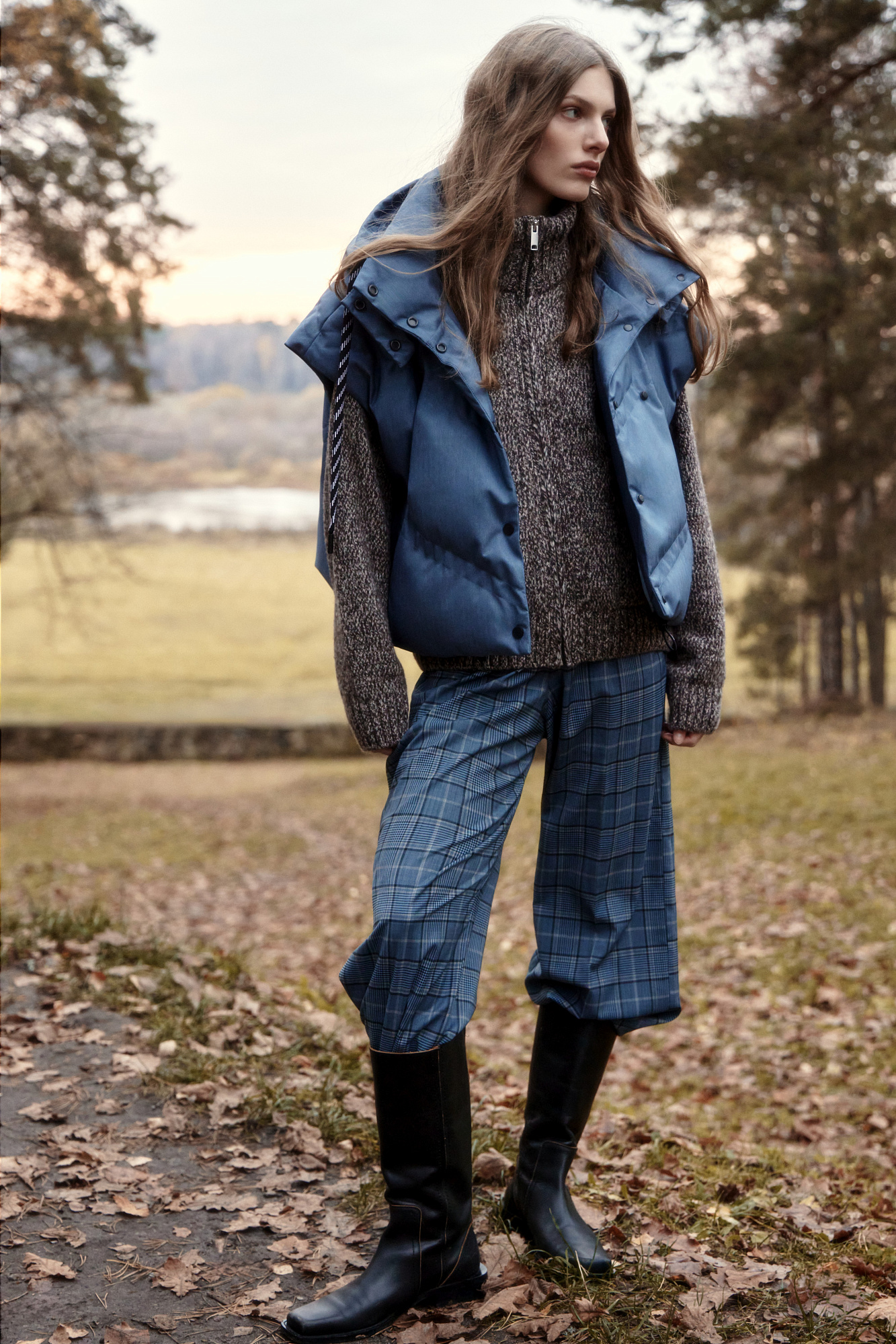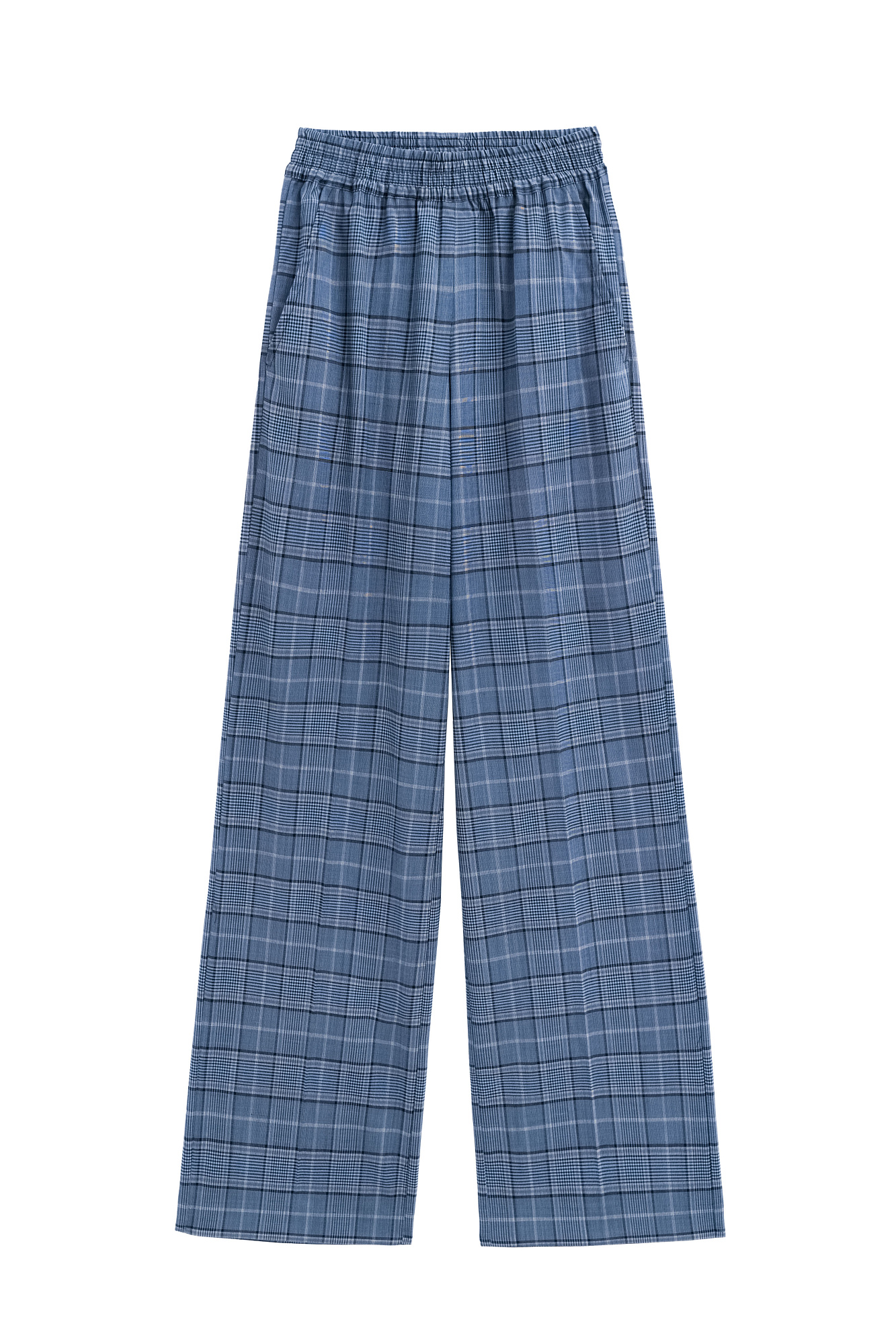 Прямые брюки из шерсти в клетку. Модель с широким поясом на эластичной резинке и двумя боковыми карманами.