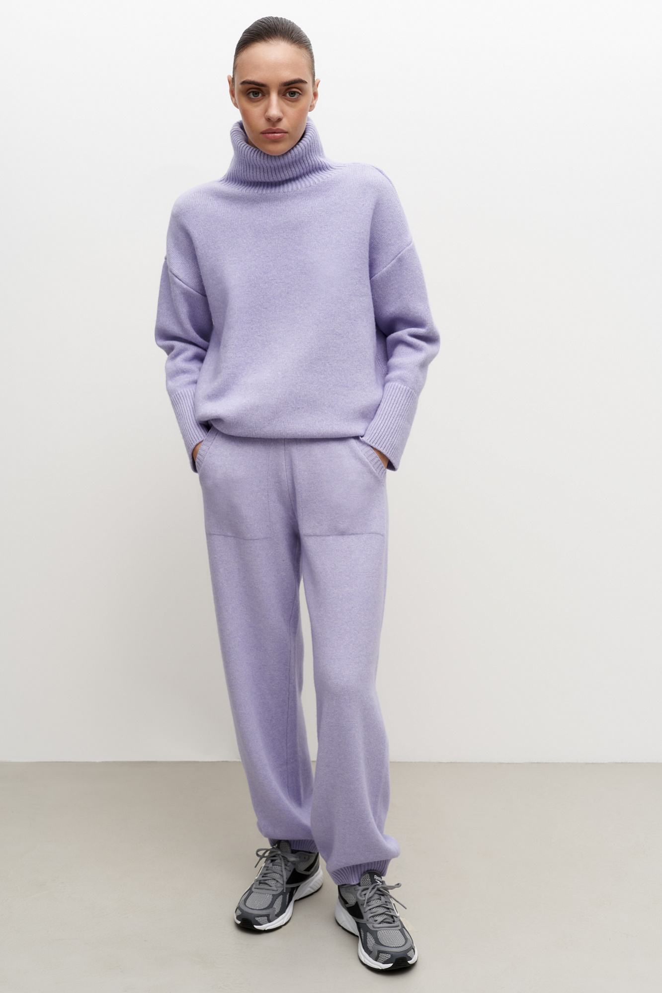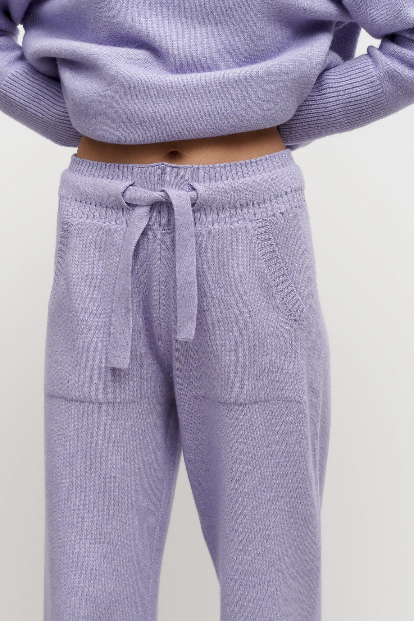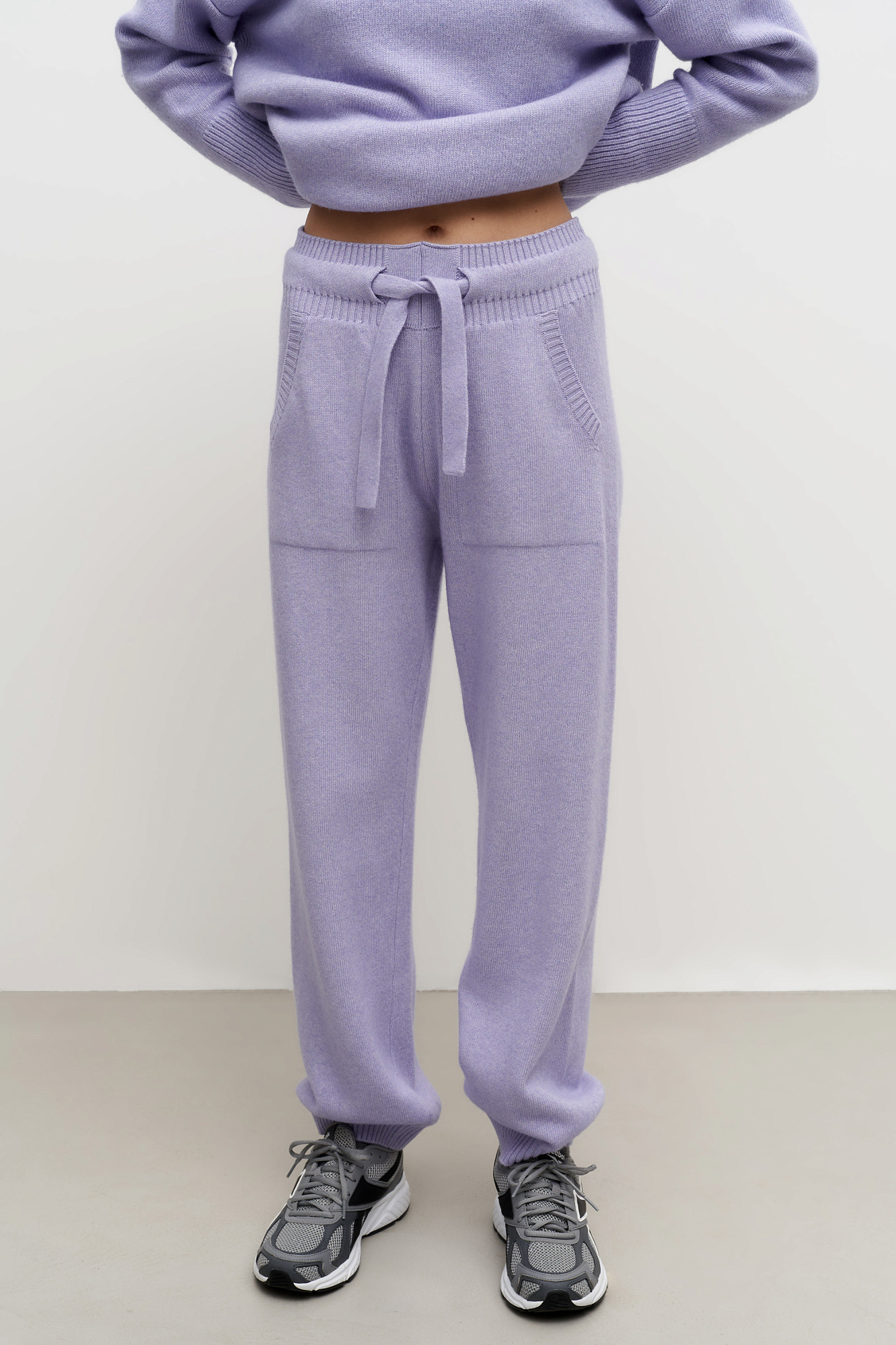 Трикотажные брюки-джоггеры из кашемира и шерсти. Модель с широким эластичным поясом на кулиске, манжетами на резинке и боковыми карманами.