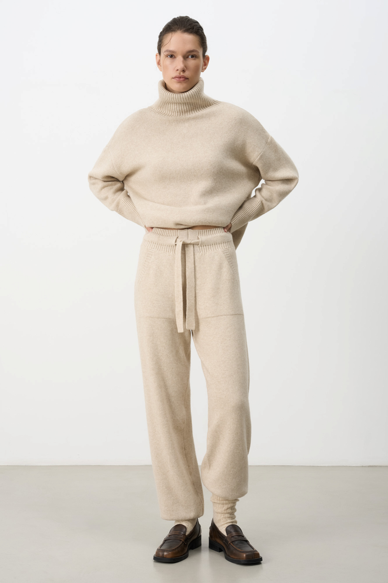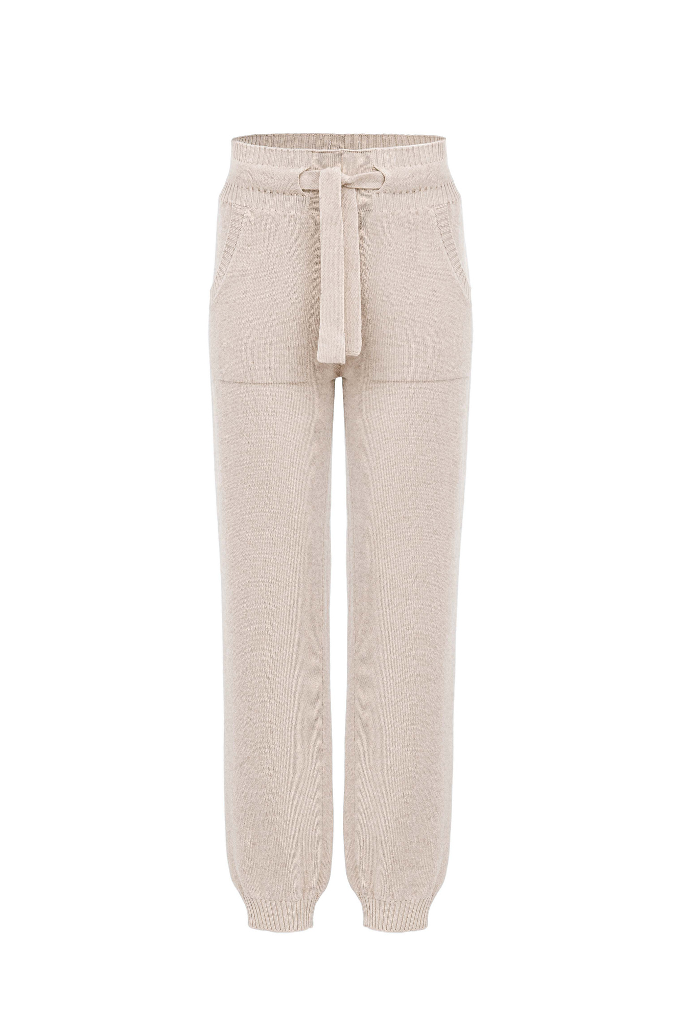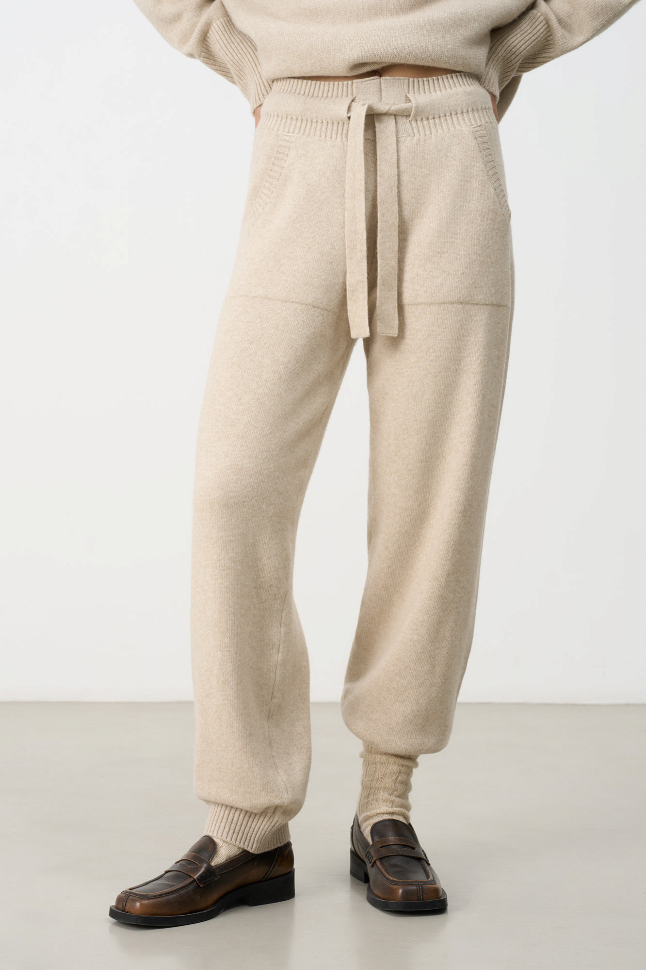 Трикотажные брюки-джоггеры из кашемира и шерсти. Модель с широким эластичным поясом на кулиске, манжетами на резинке и боковыми карманами.