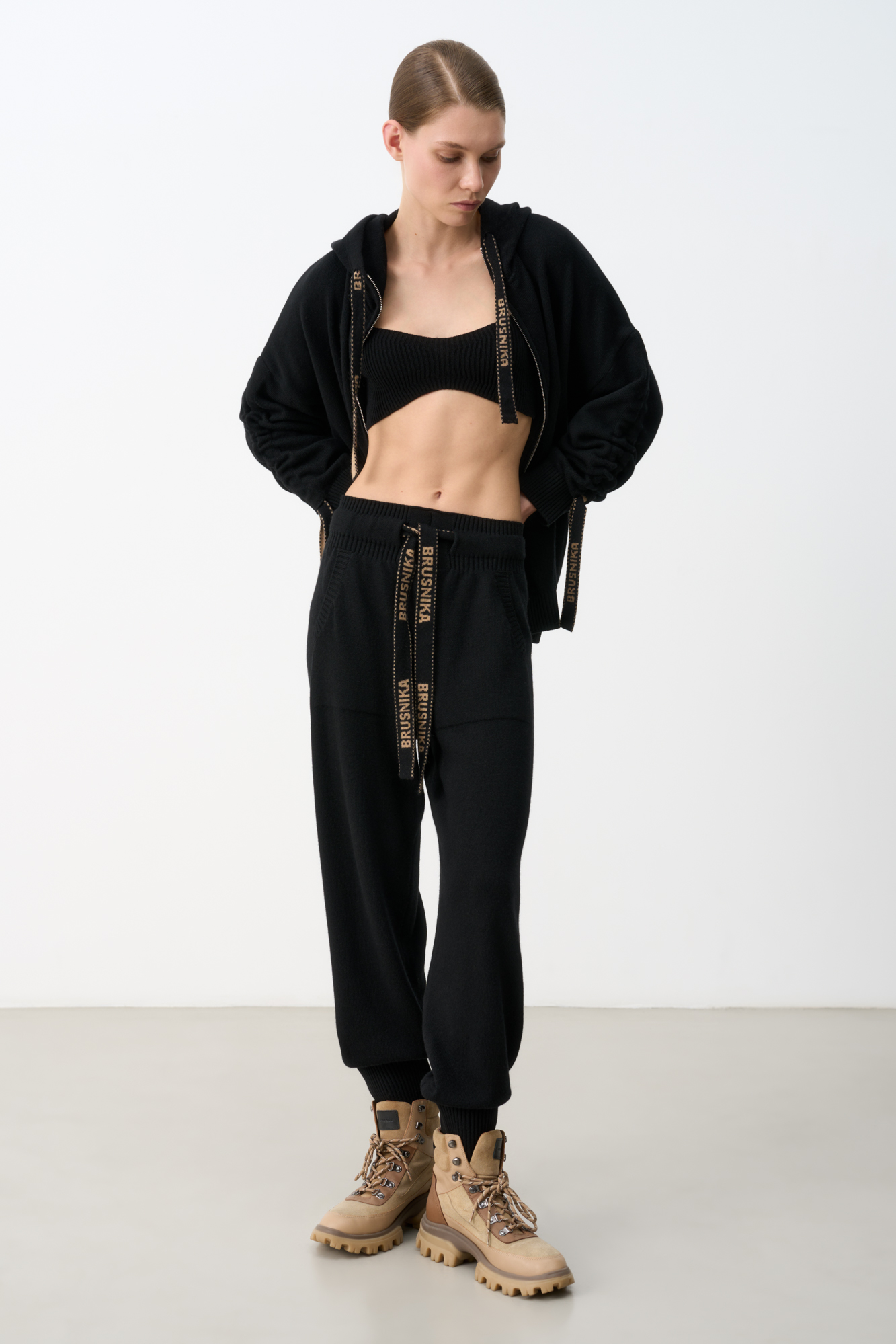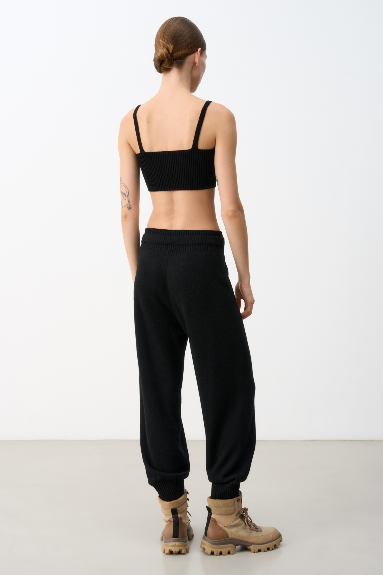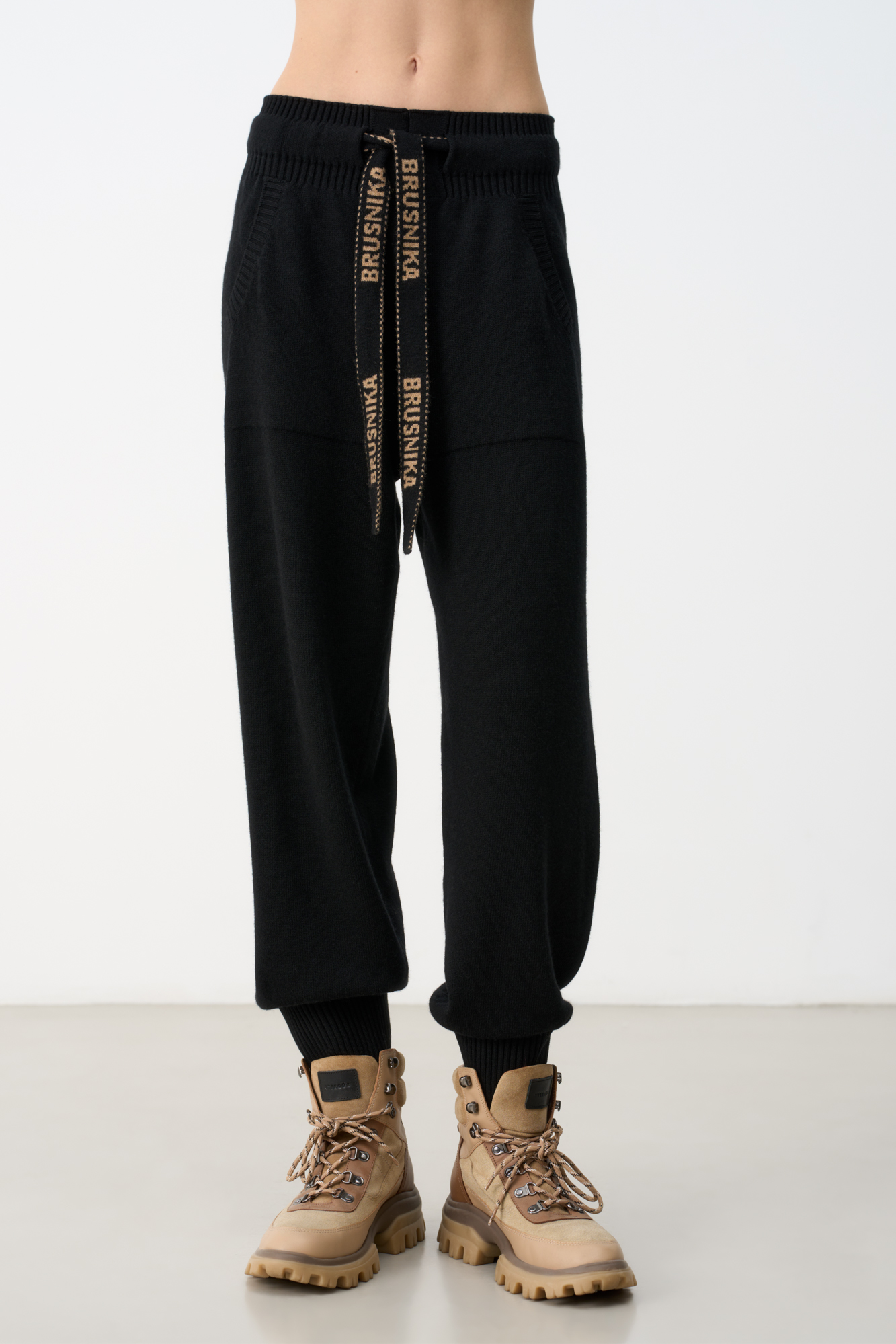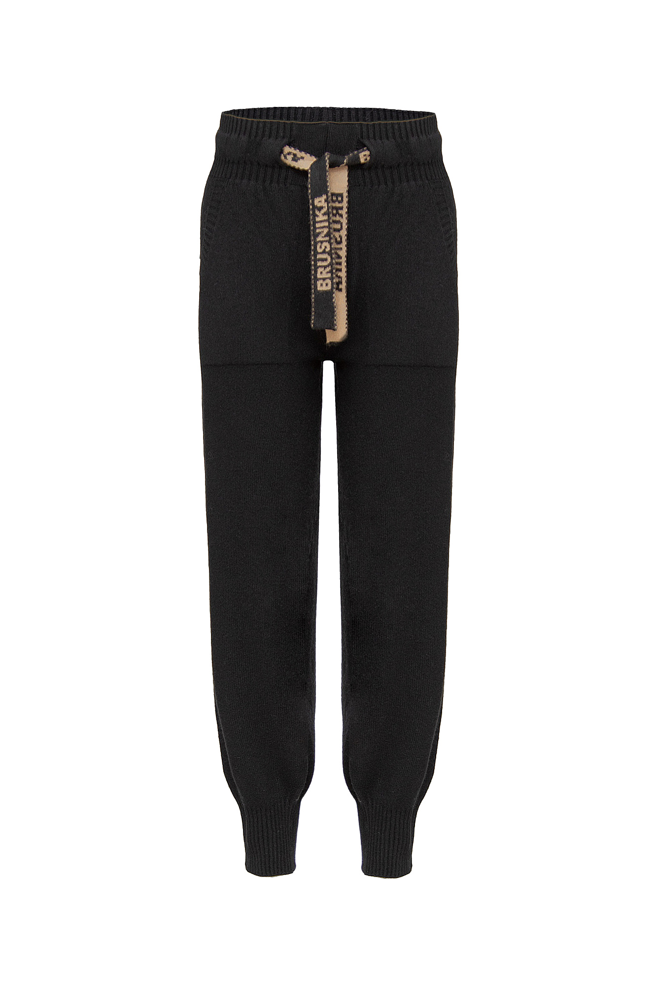 Брюки средней посадки из кашемира и шерсти. Пояс на резинке с кулиской из брендированной ленты. Два боковых кармана.