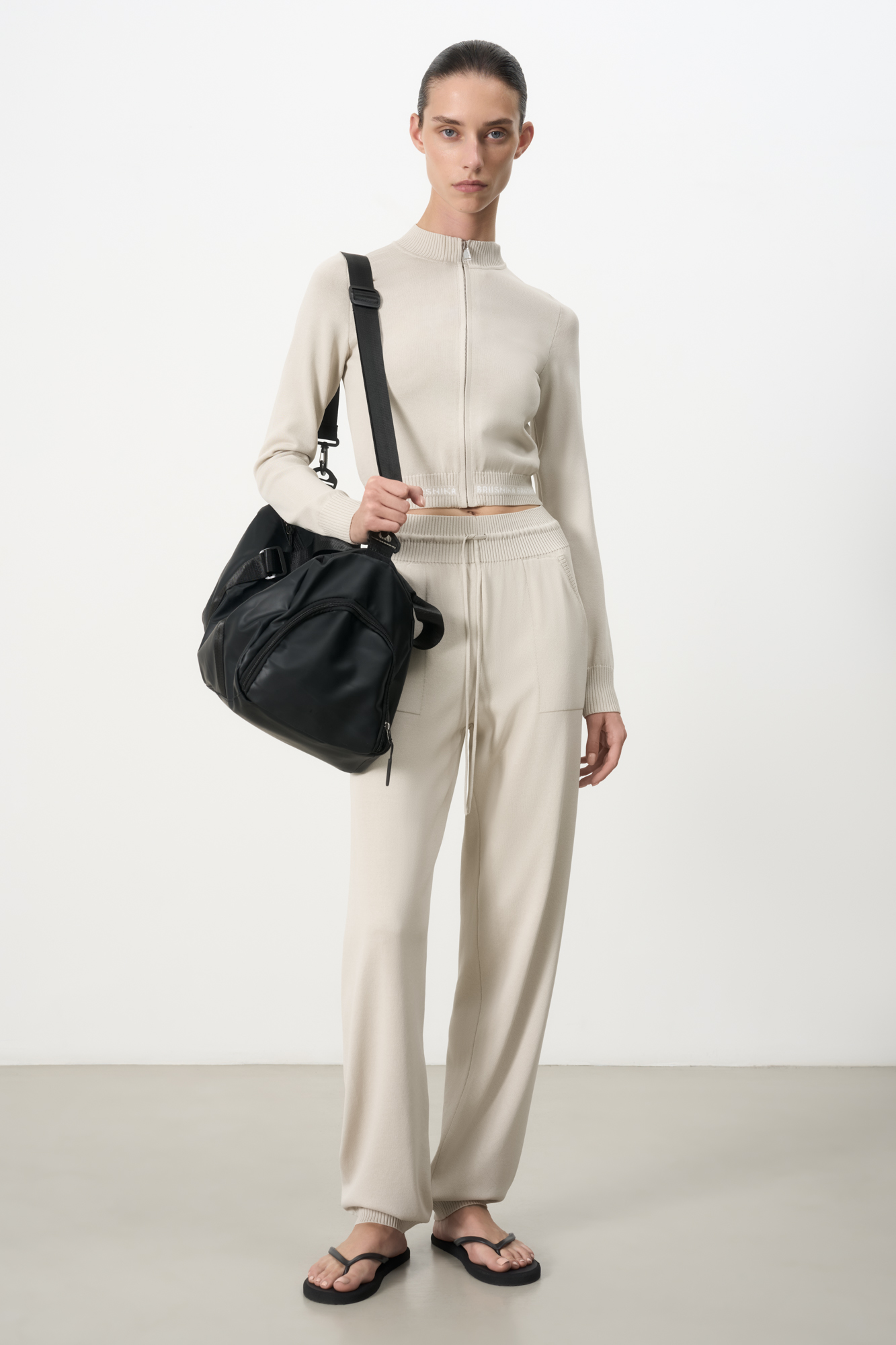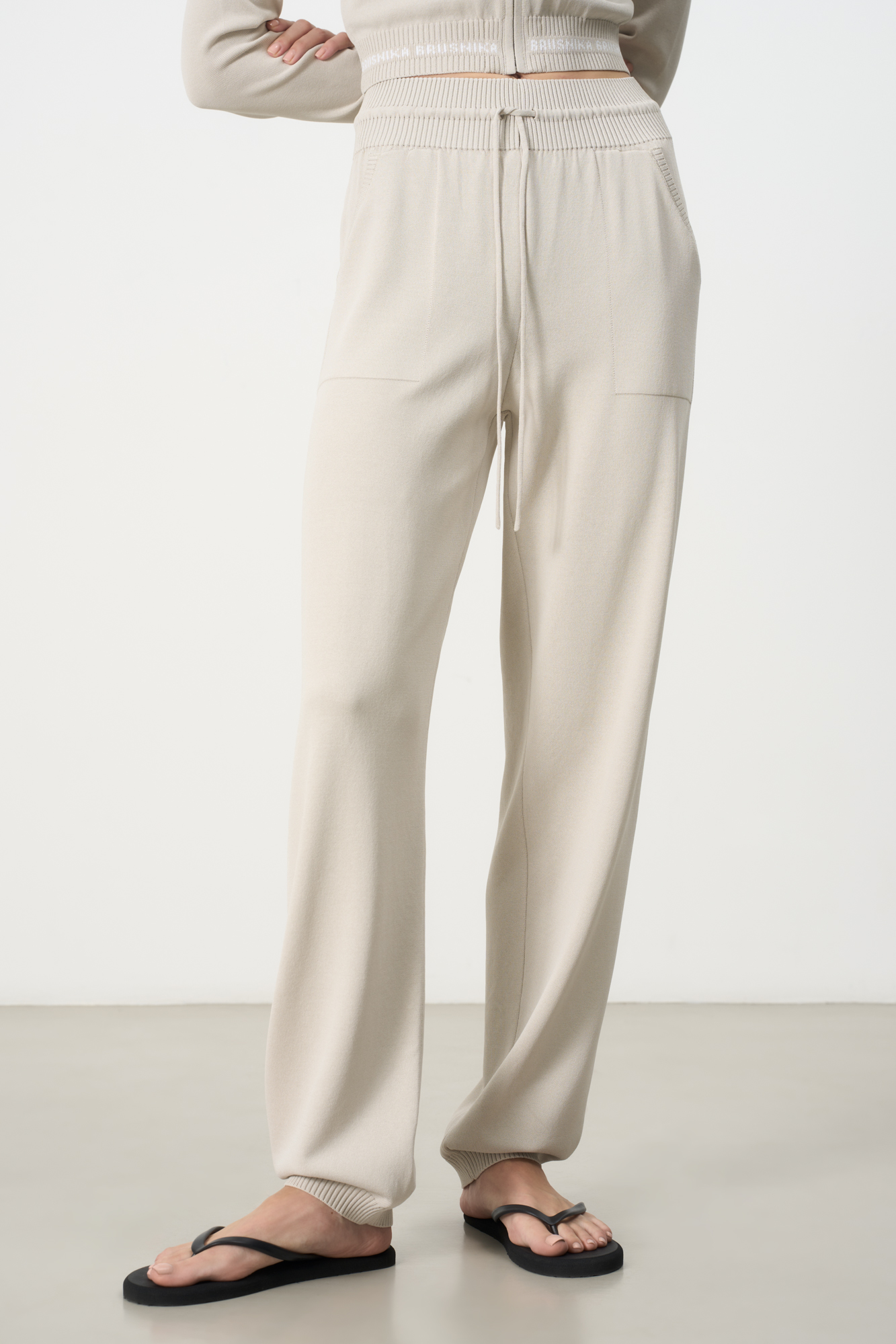 Трикотажные брюки из вискозы с боковыми карманами. Эластичный пояс с кулиской и манжеты на резинке в рубчик.