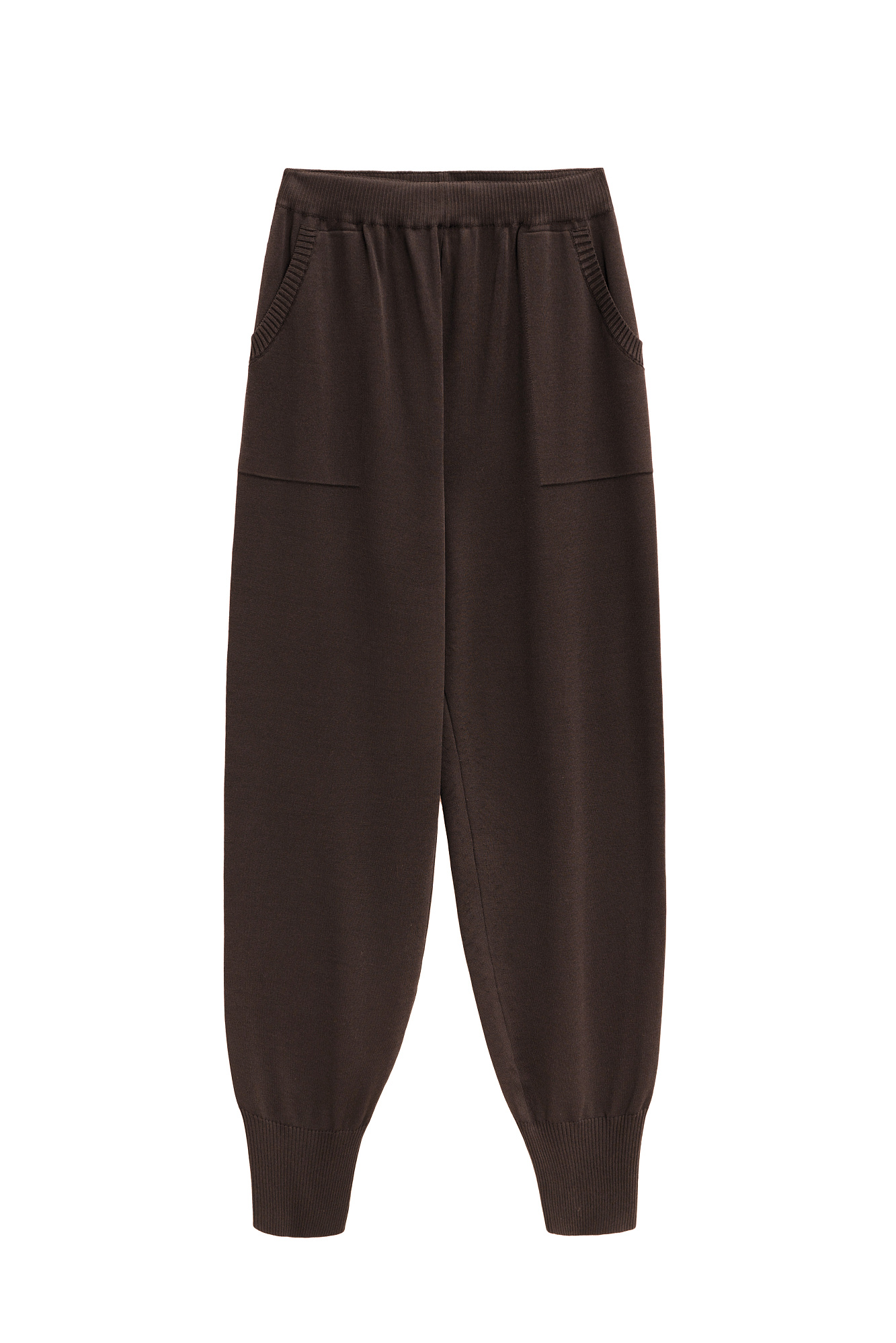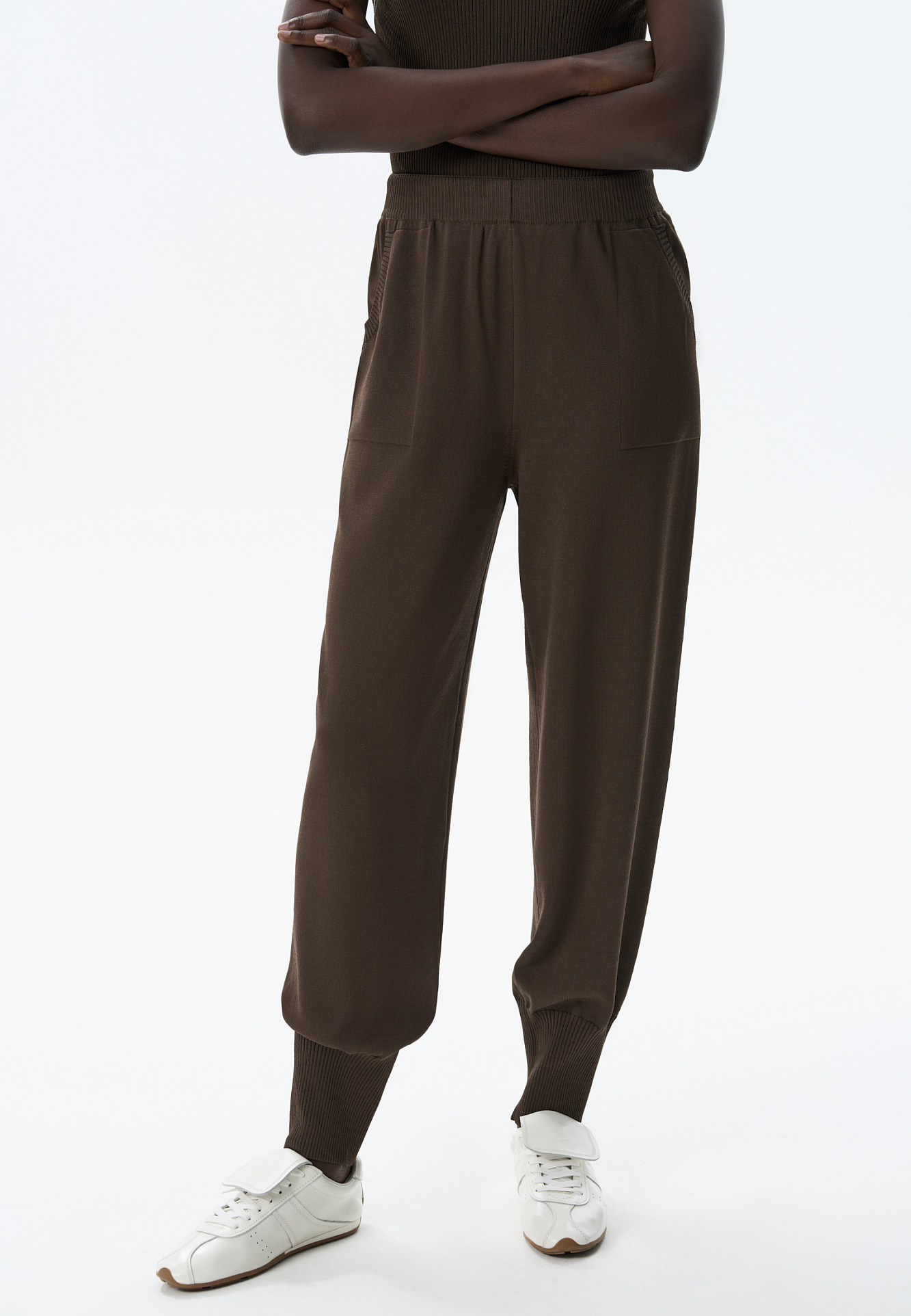 Трикотажные брюки из плотной вискозы в спортивном стиле. Регулируемый пояс на шнурке. Боковые карманы. Эластичные манжеты.