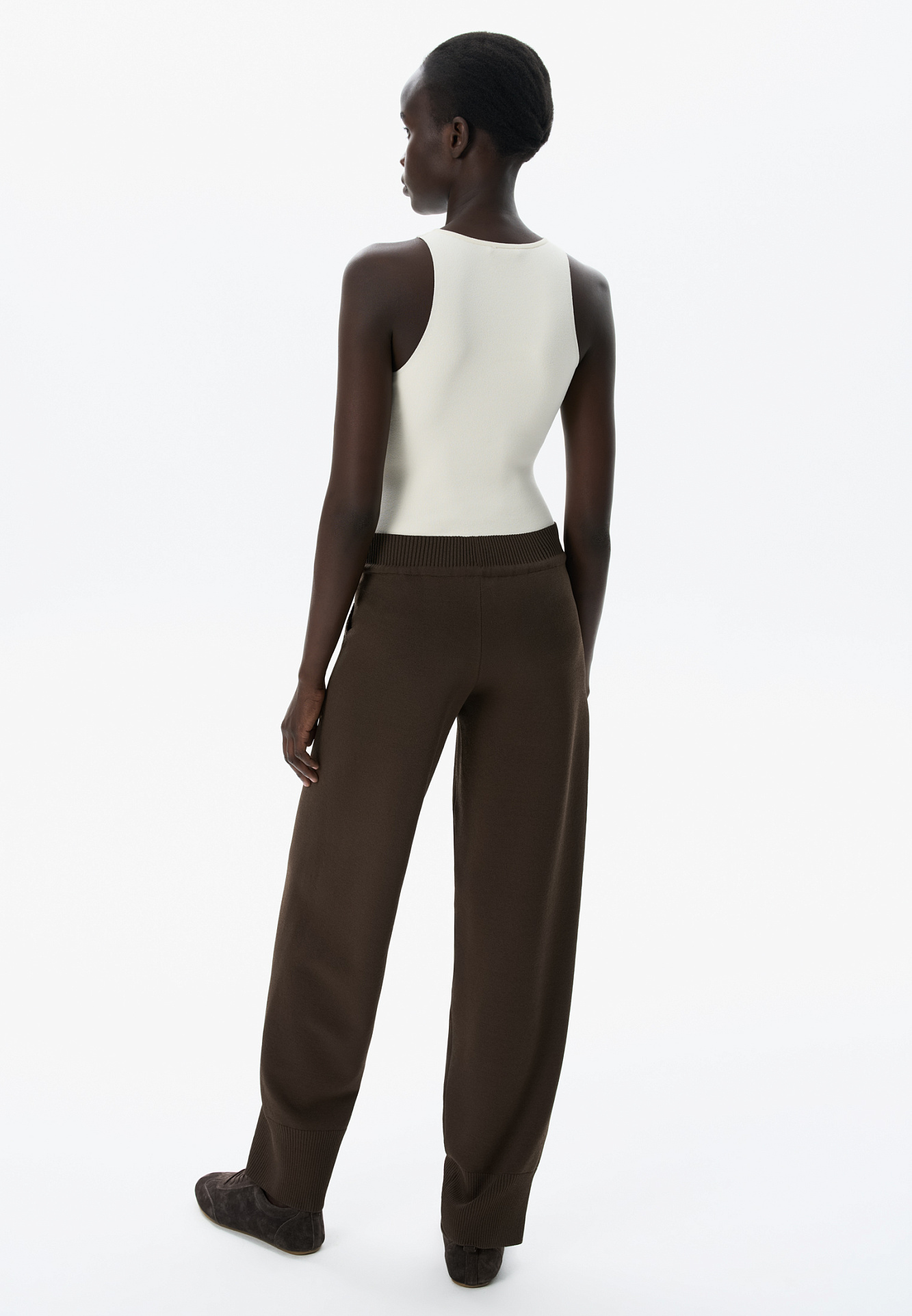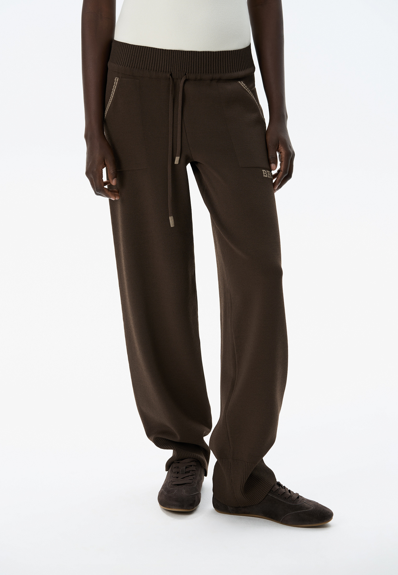 Трикотажные брюки из вискозы с добавлением эластана. Модель выполнена в спортивном стиле, с широким эластичным поясом на кулиске, боковыми карманами и широкими манжетами на резинке.