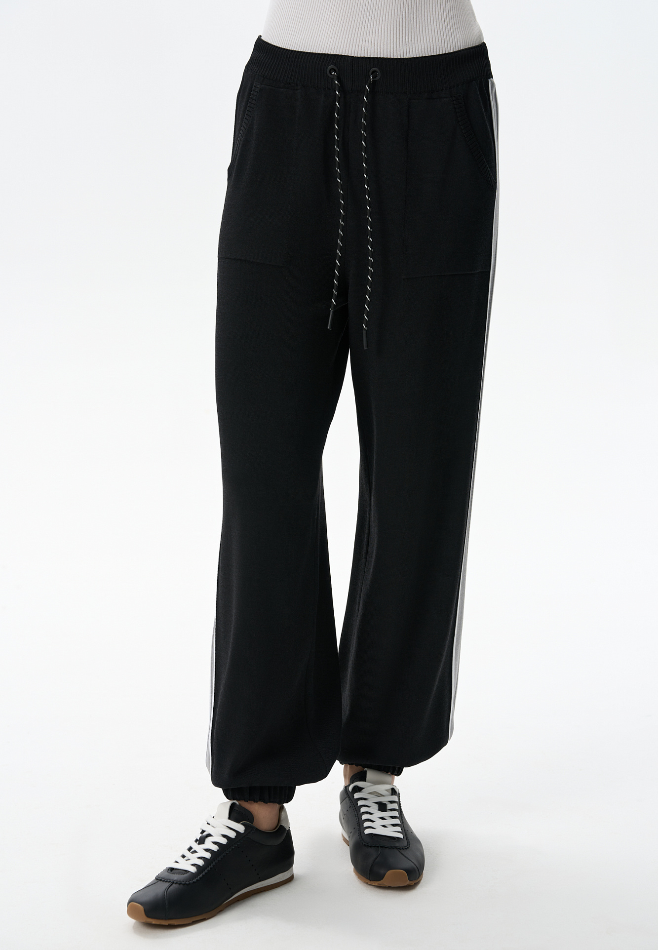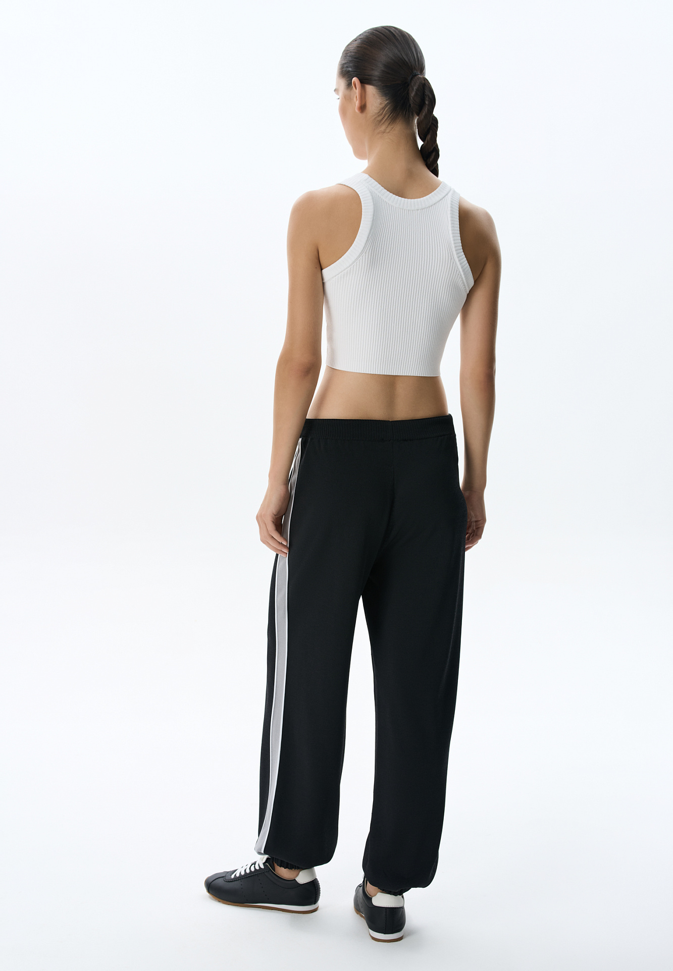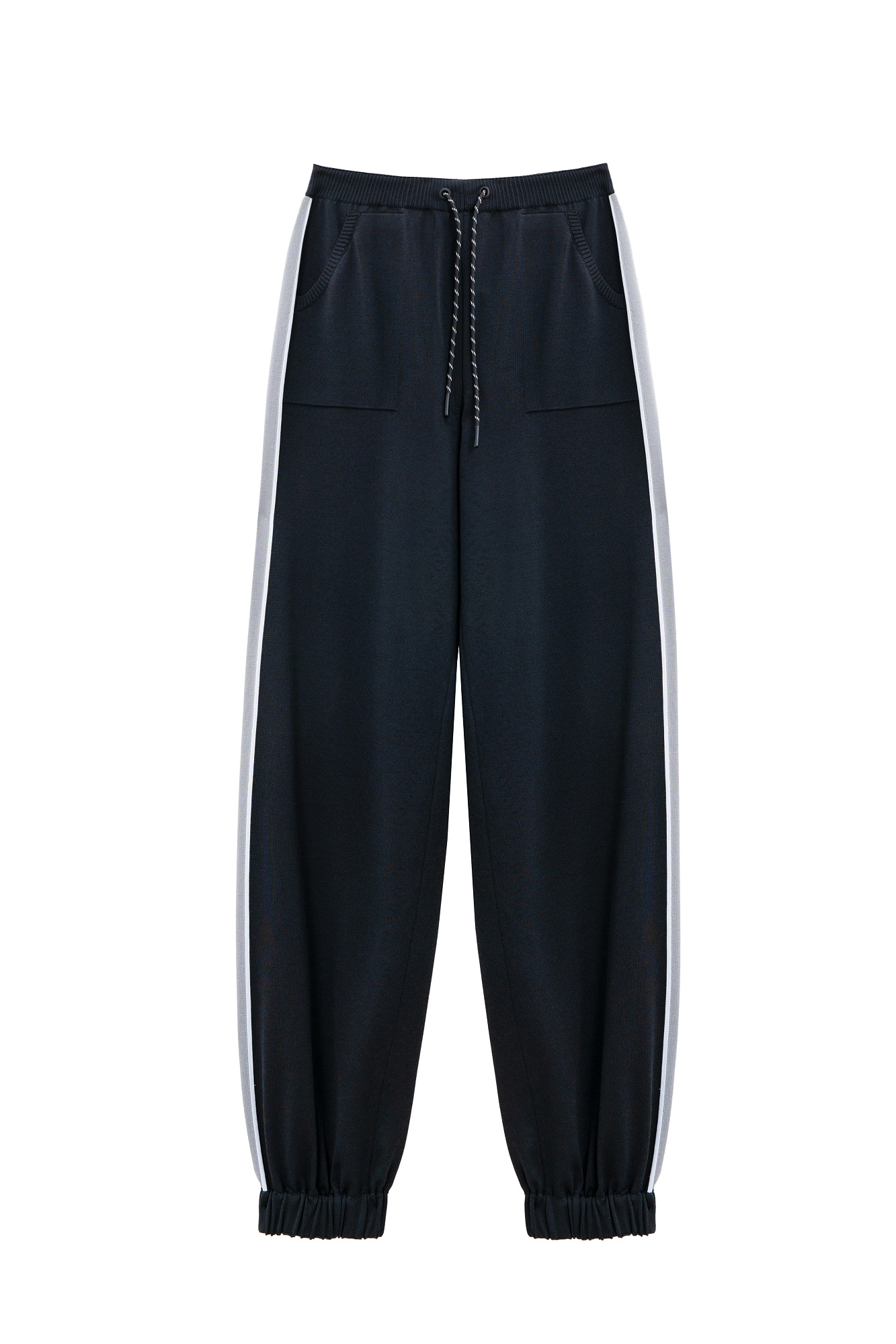 Трикотажные брюки-джоггеры из вискозы. Модель выполнена в спортивном стиле, с эластичным поясом со шнурком, боковыми карманами и манжетами на резинке. Изделие декорировано широкими лампасами контрастного цвета.