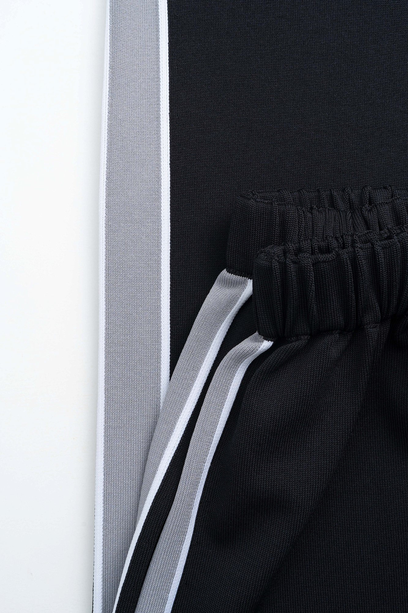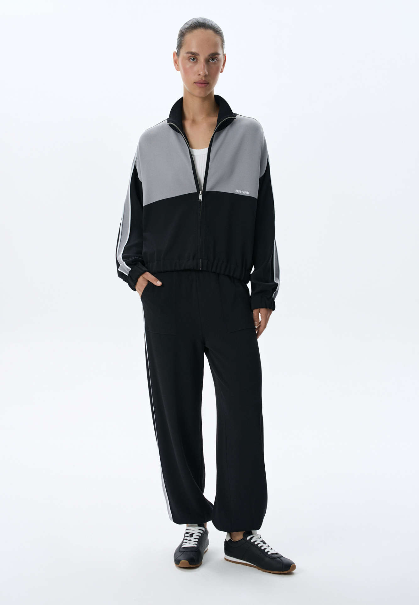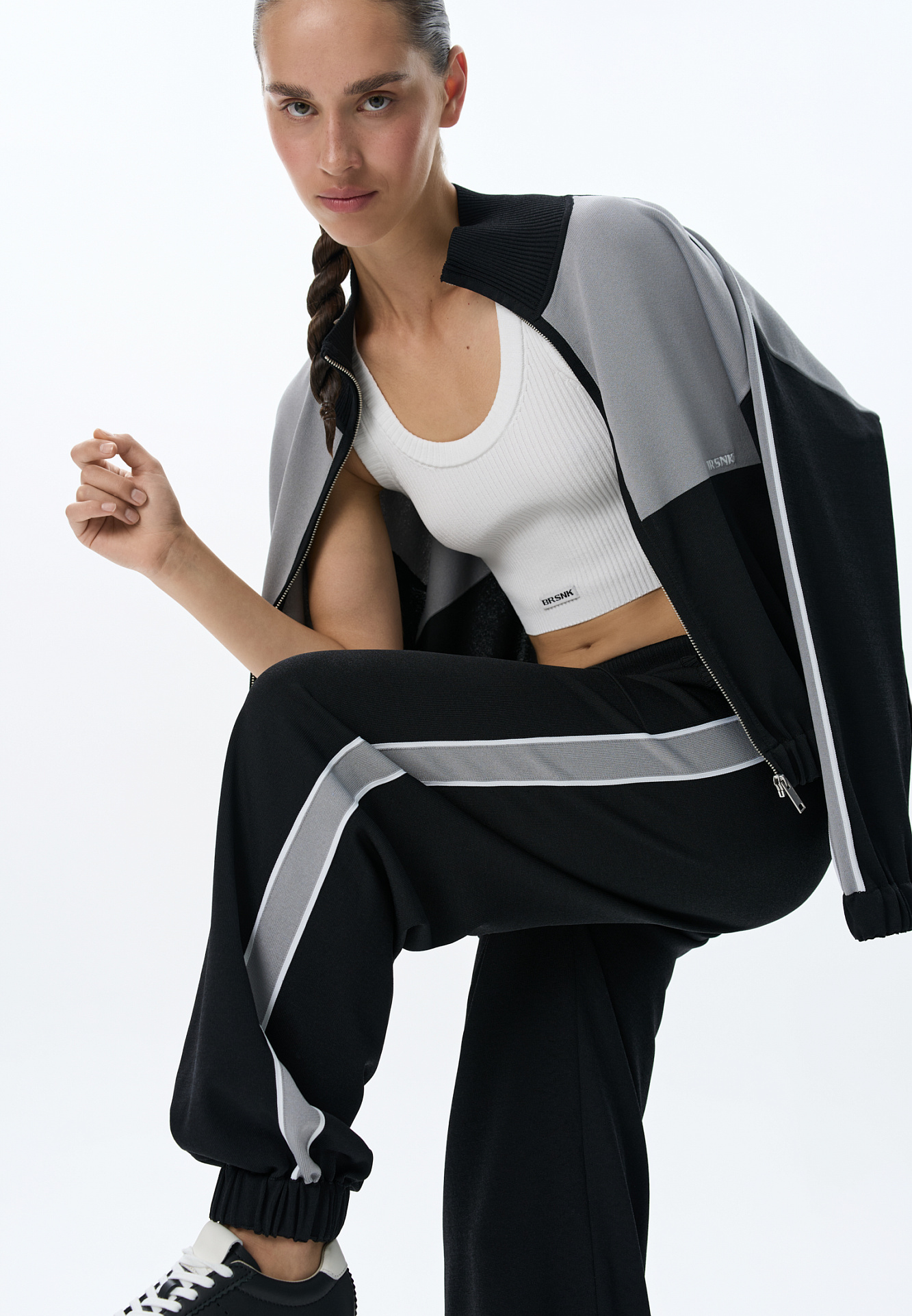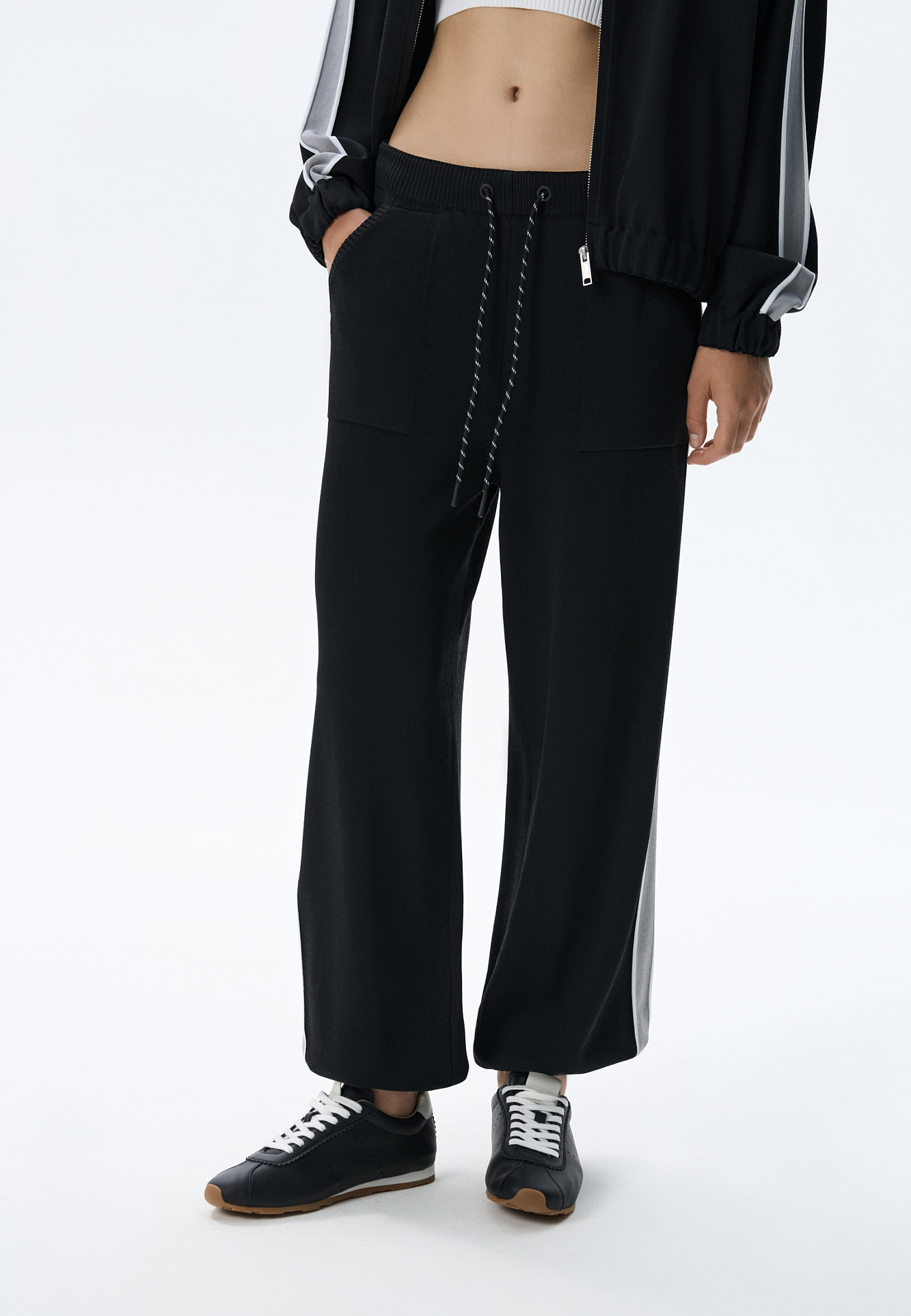 Трикотажные брюки-джоггеры из вискозы. Модель выполнена в спортивном стиле, с эластичным поясом со шнурком, боковыми карманами и манжетами на резинке. Изделие декорировано широкими лампасами контрастного цвета.