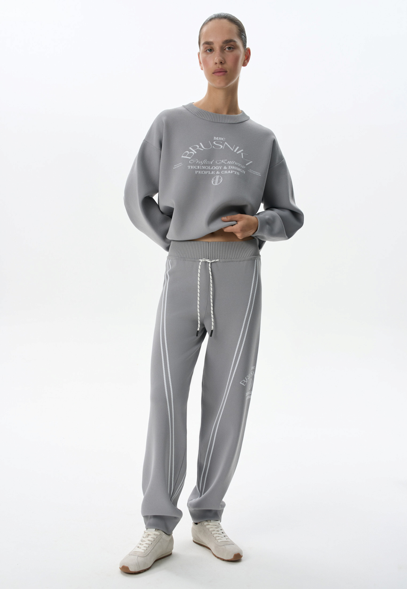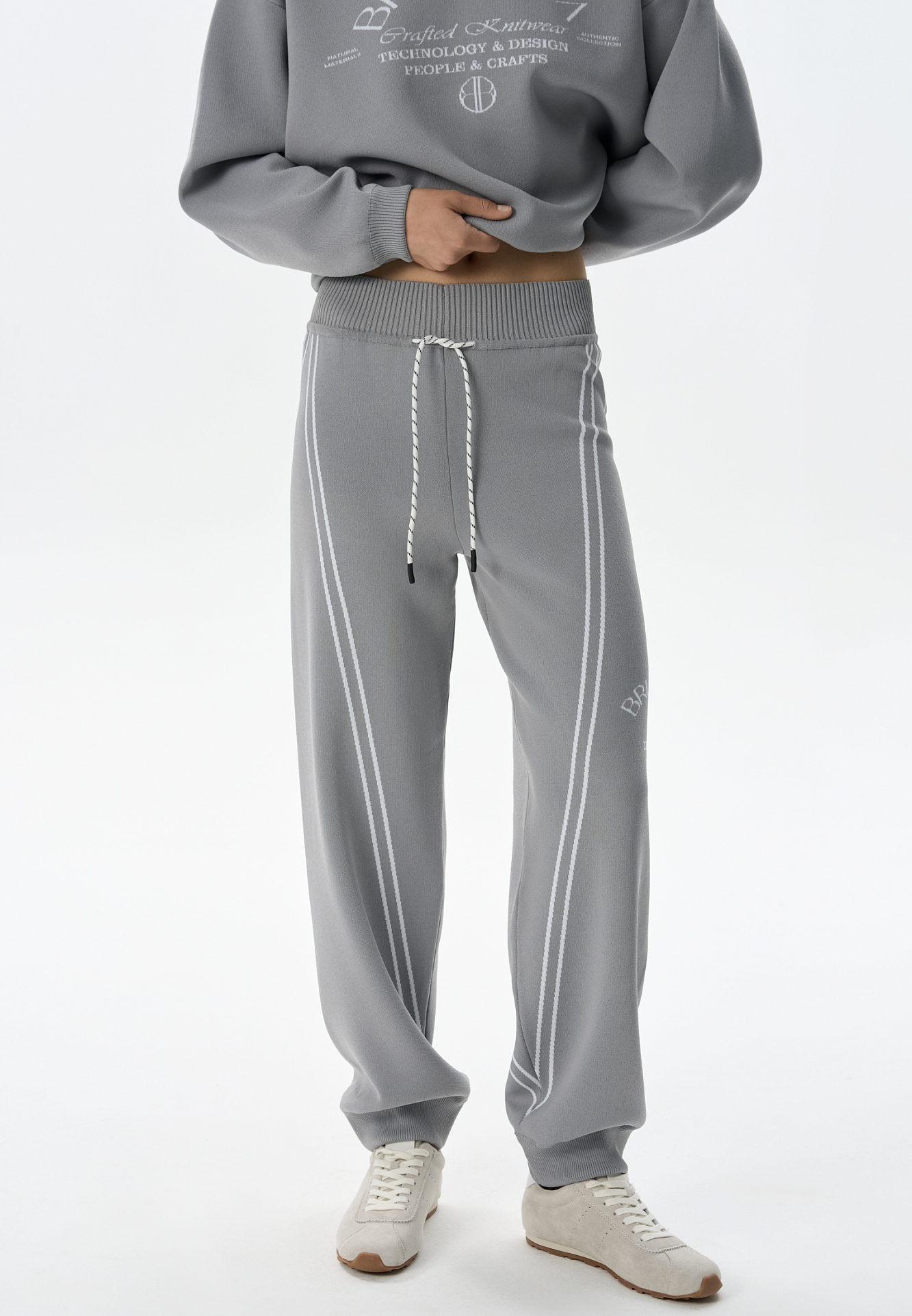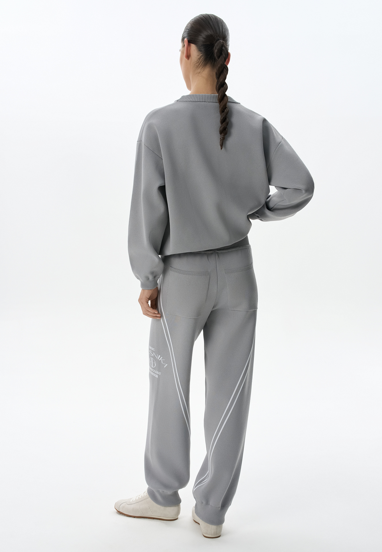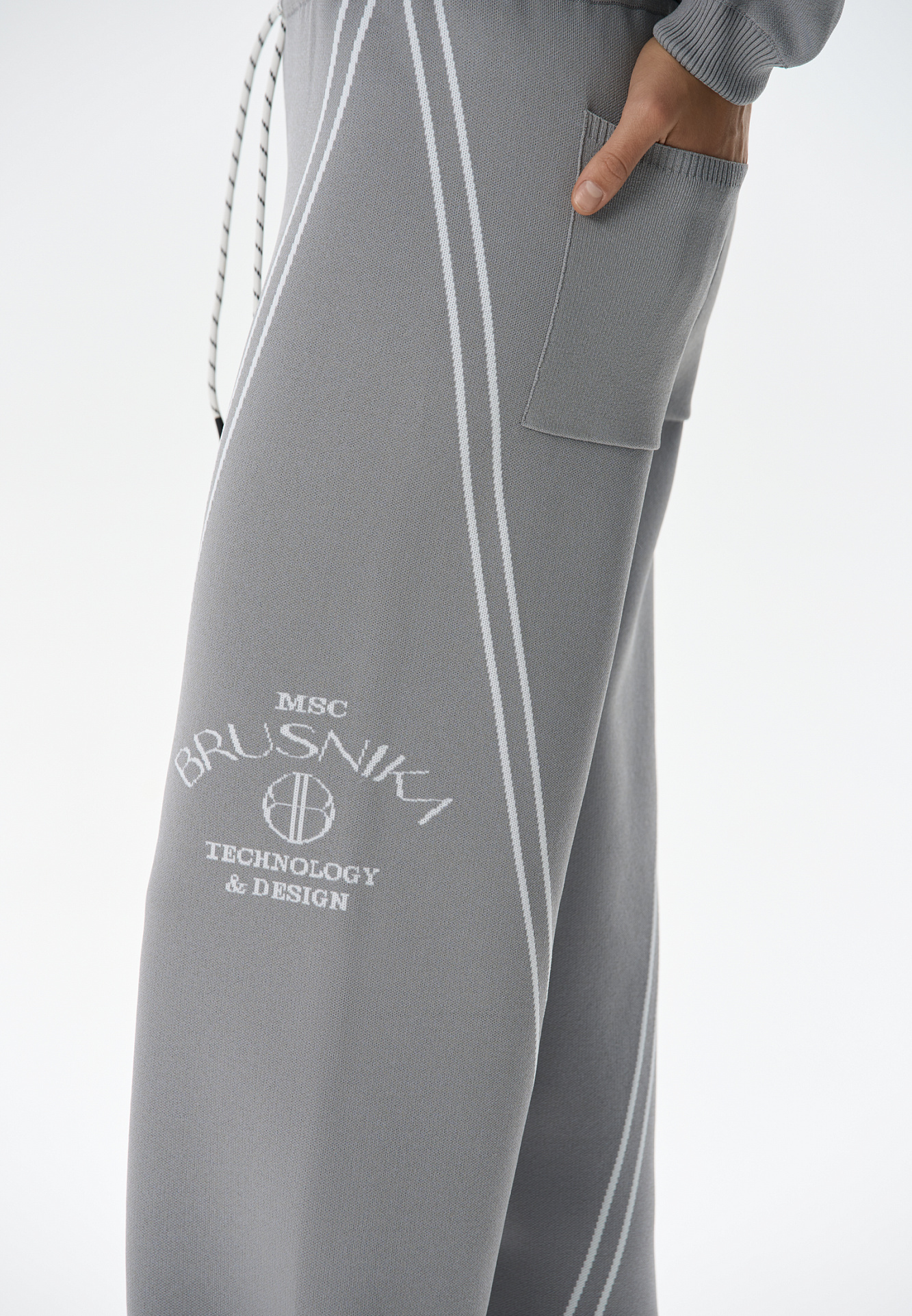 Трикотажные джоггеры из вискозы. Модель свободного силуэта, с широким эластичным поясом на кулиске, боковыми и задними карманами. Изделие декорировано брендированным жаккардом и лампасами контрастного цвета.