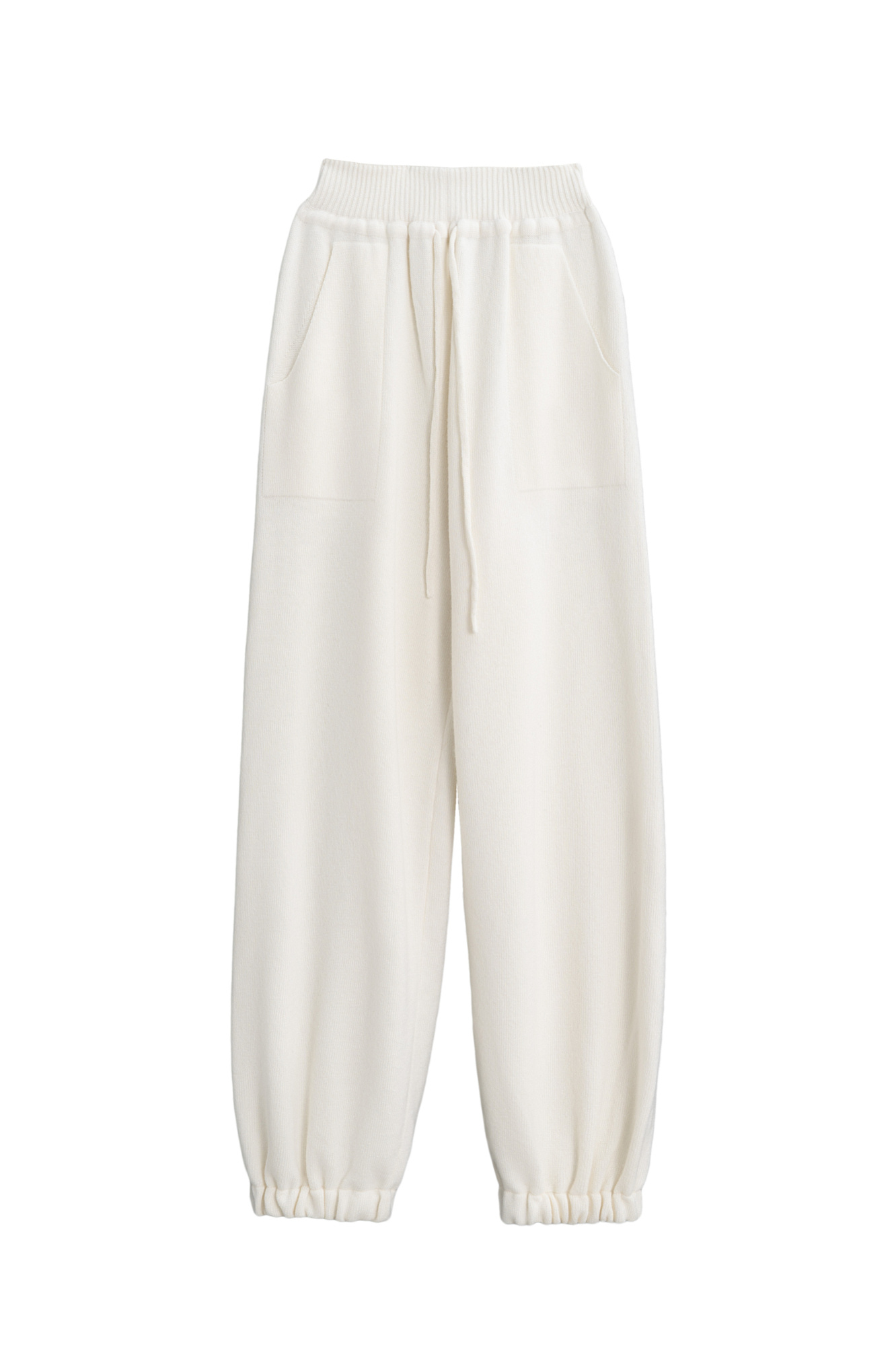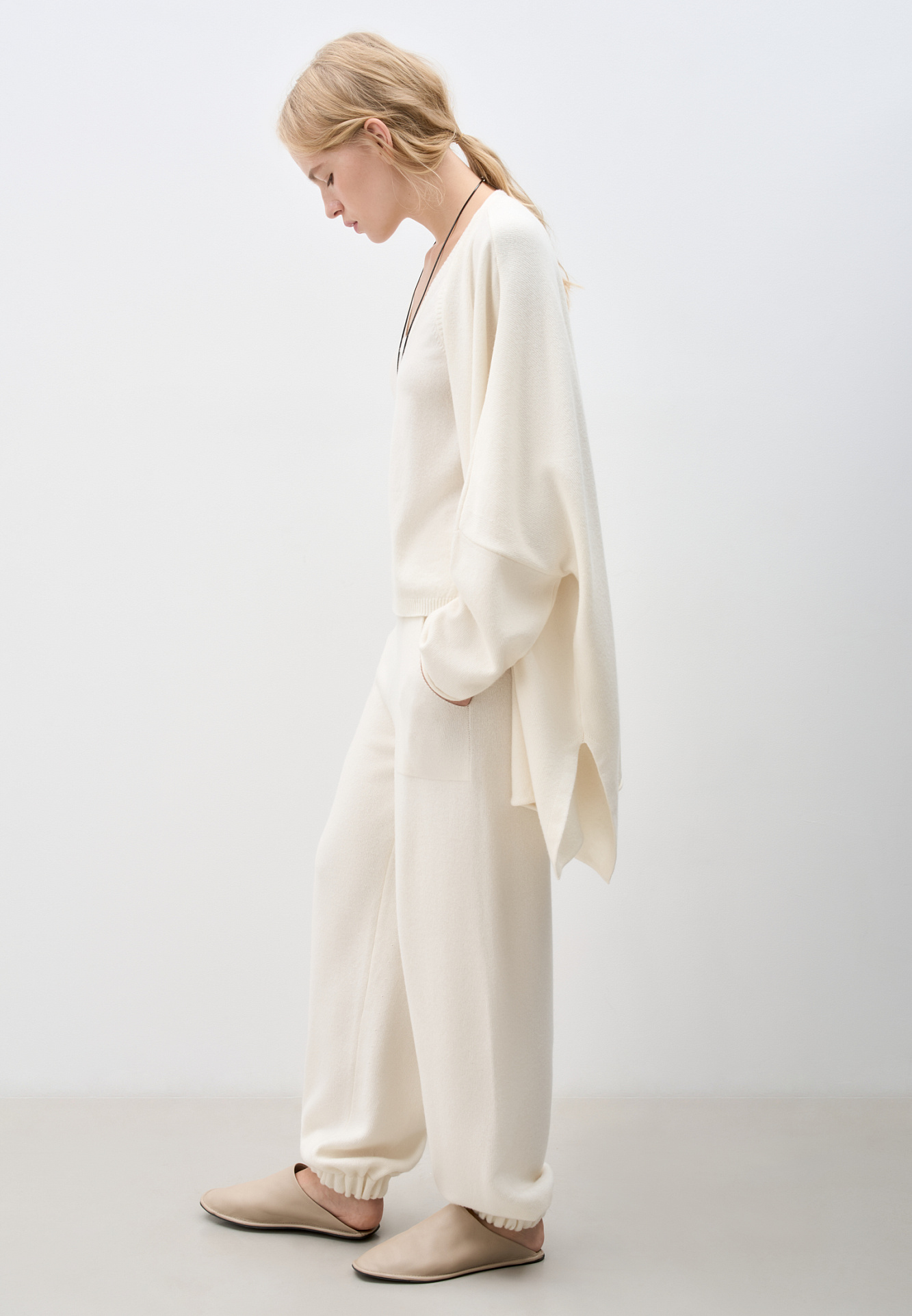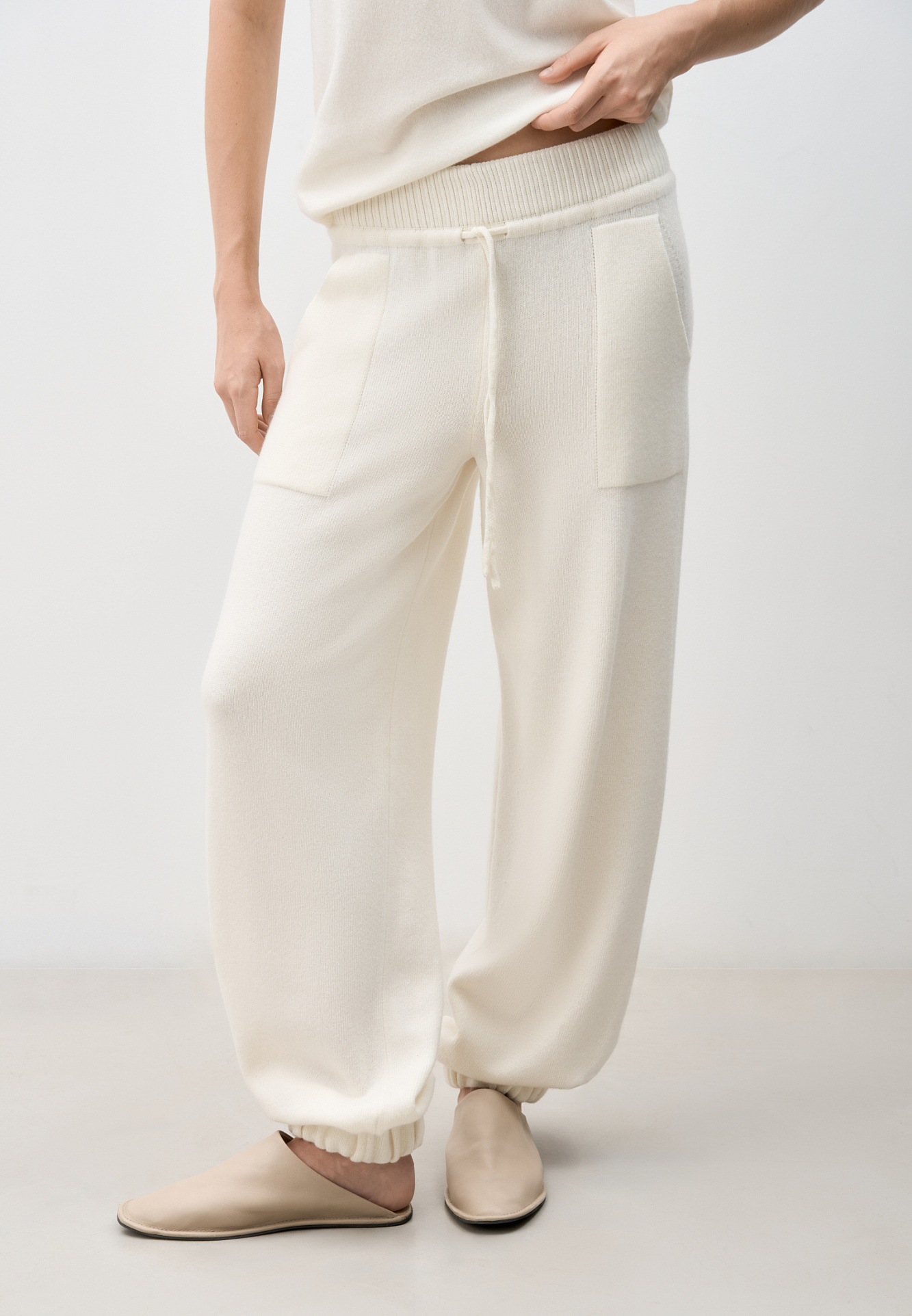 Трикотажные брюки-бананы из кашемира и шерсти. Модель свободного силуэта, с эластичным поясом в рубчик, дополненным кулиской, и двумя большими карманами. Манжеты выполнены на резинках.