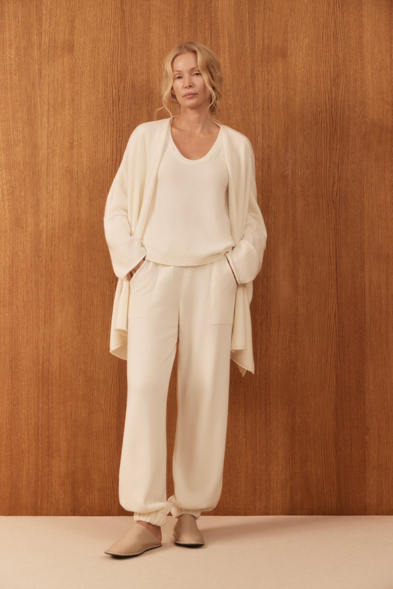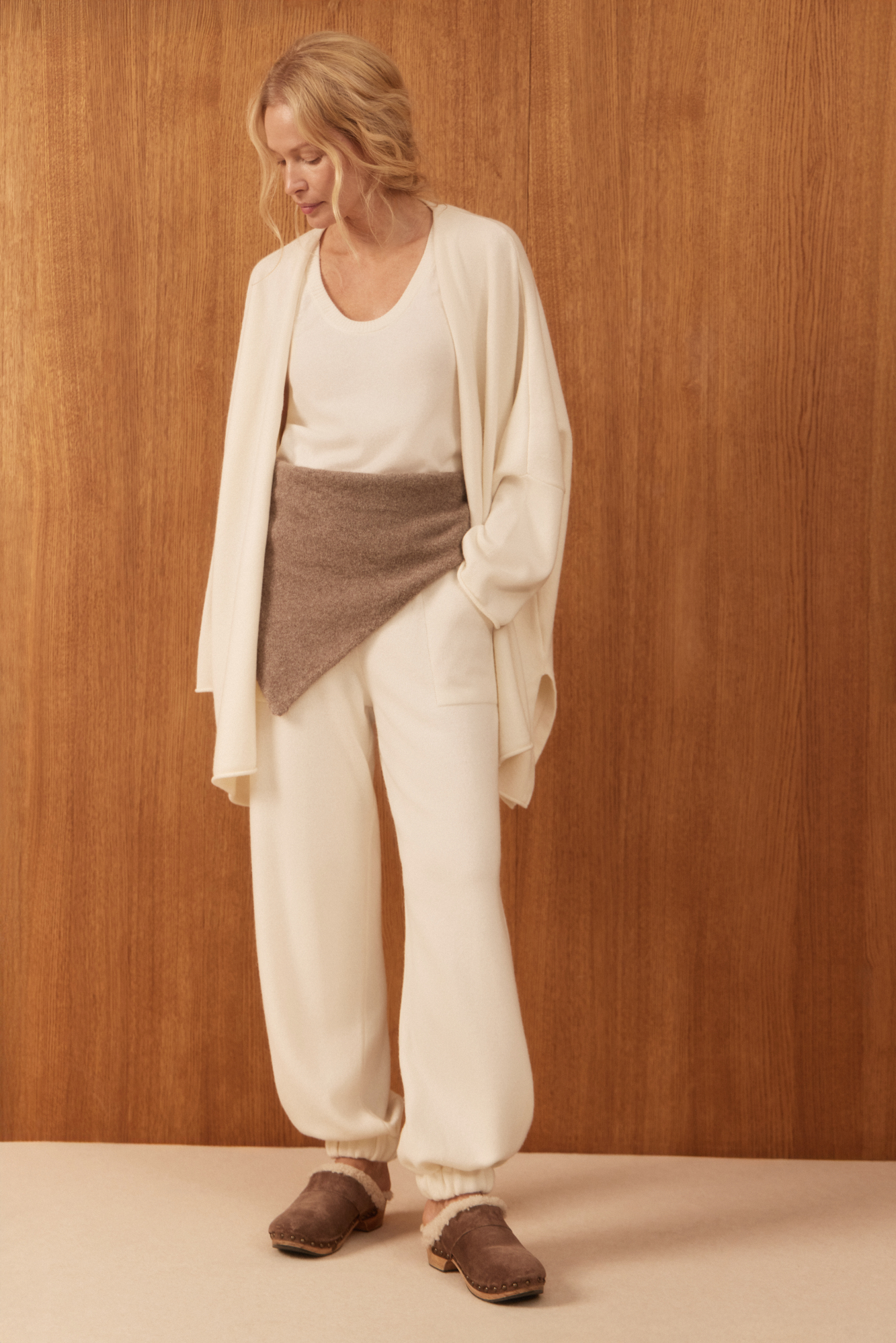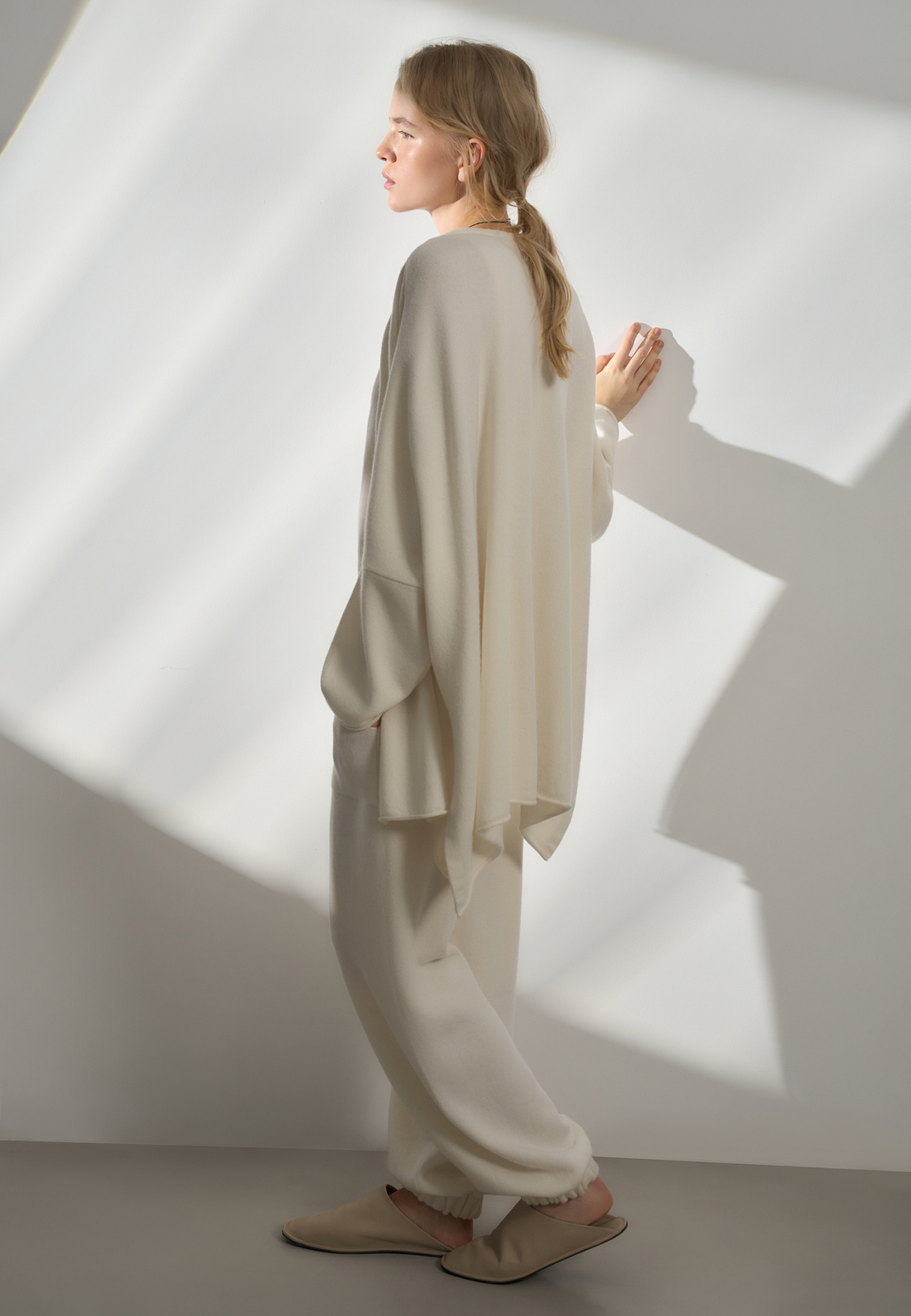 Трикотажные брюки-бананы из кашемира и шерсти. Модель свободного силуэта, с эластичным поясом в рубчик, дополненным кулиской, и двумя большими карманами. Манжеты выполнены на резинках.