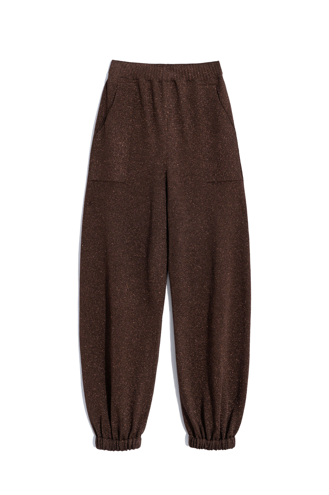 Трикотажные брюки-джоггеры из вискозы с добавлением люрекса. Модель с эластичным поясом на кулиске, боковыми карманами и манжетами на резинке.
