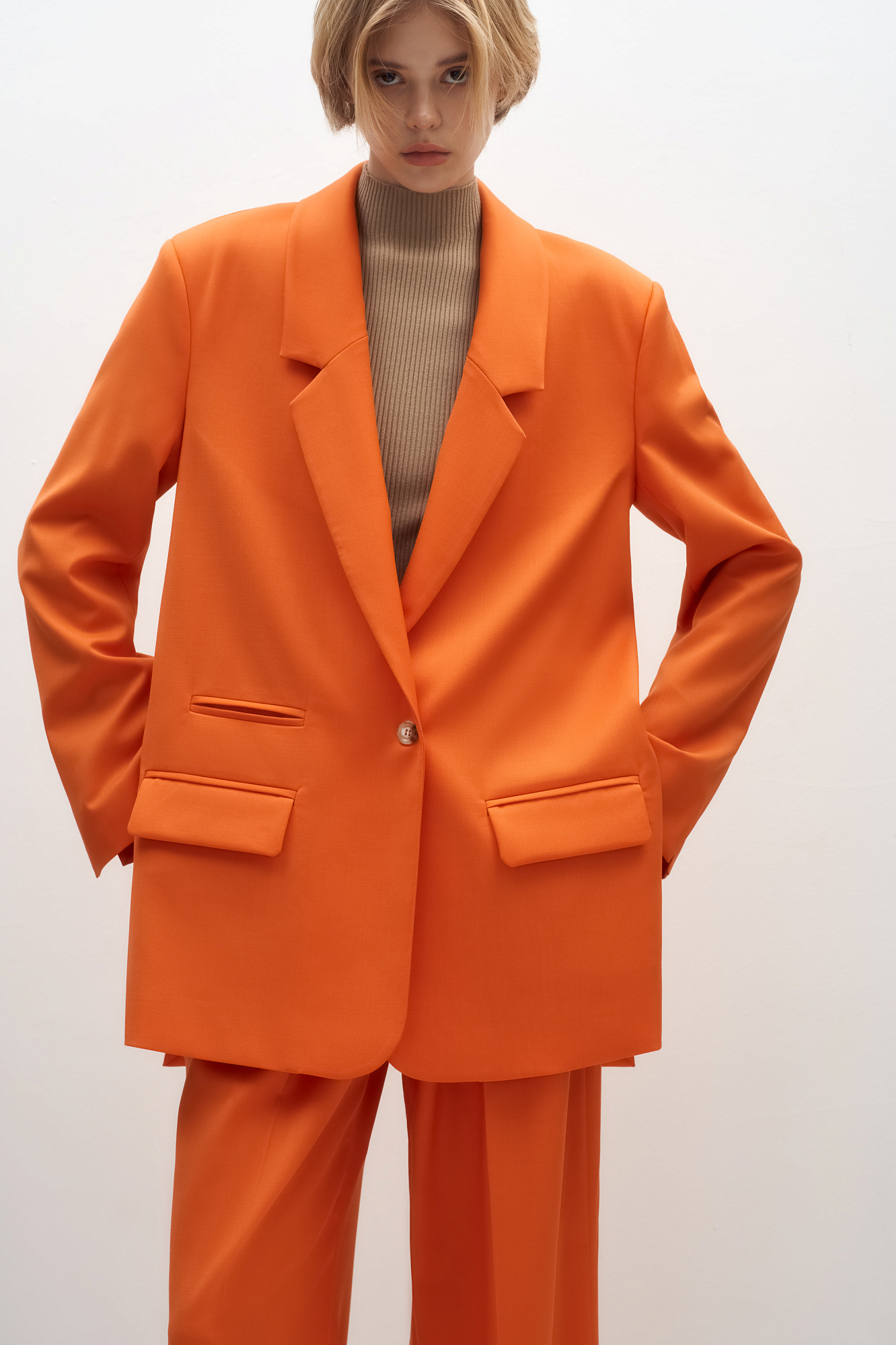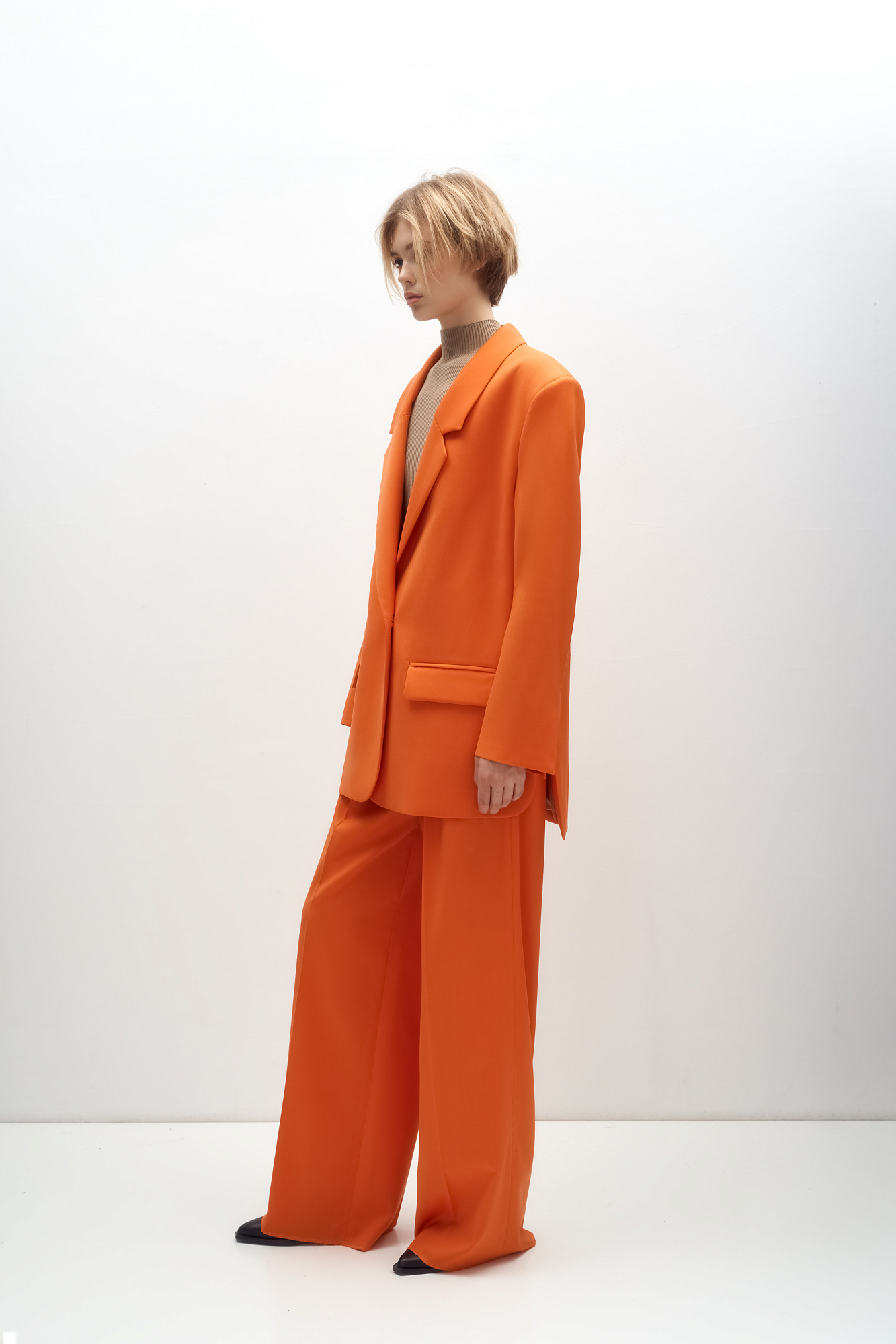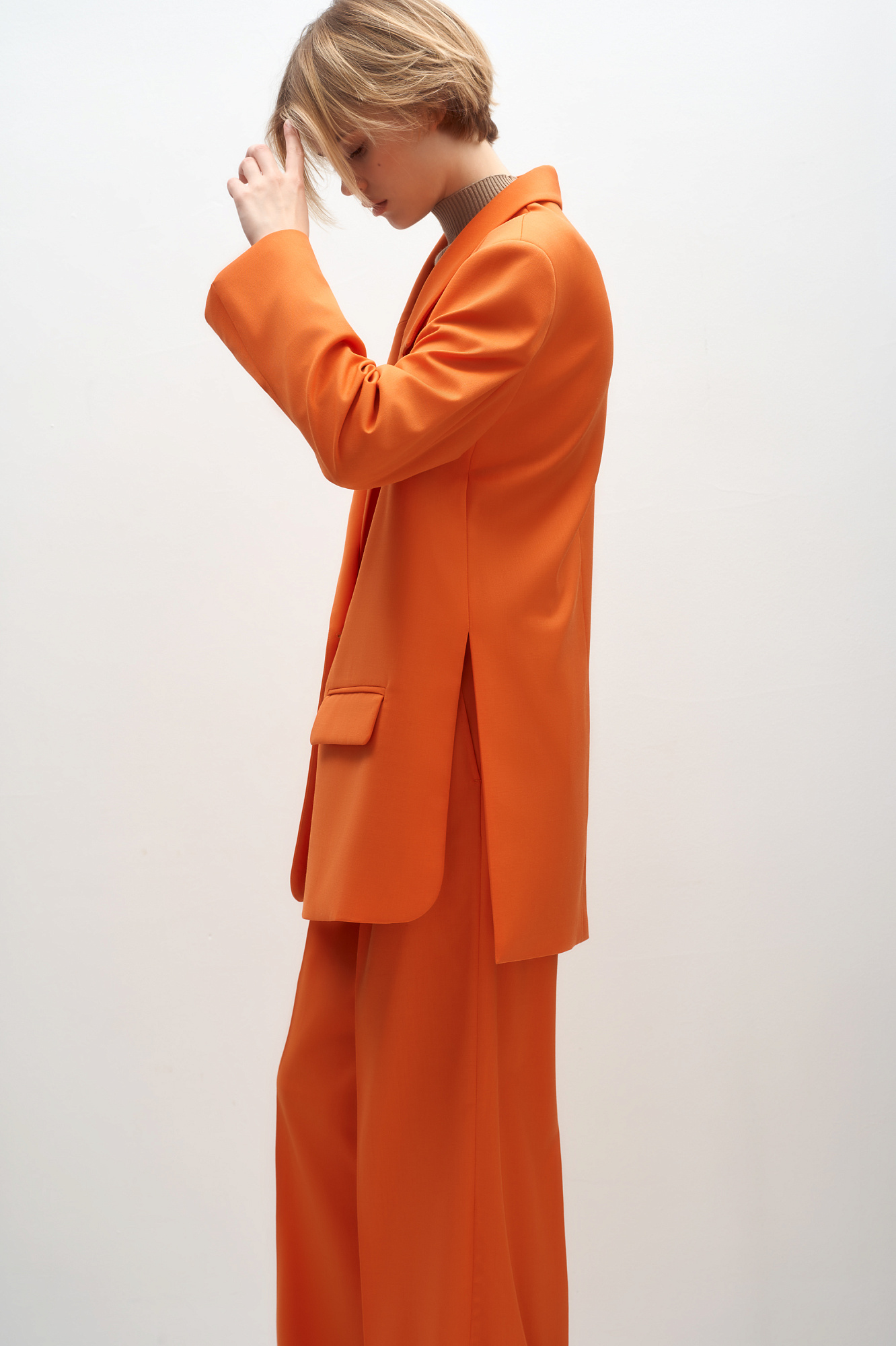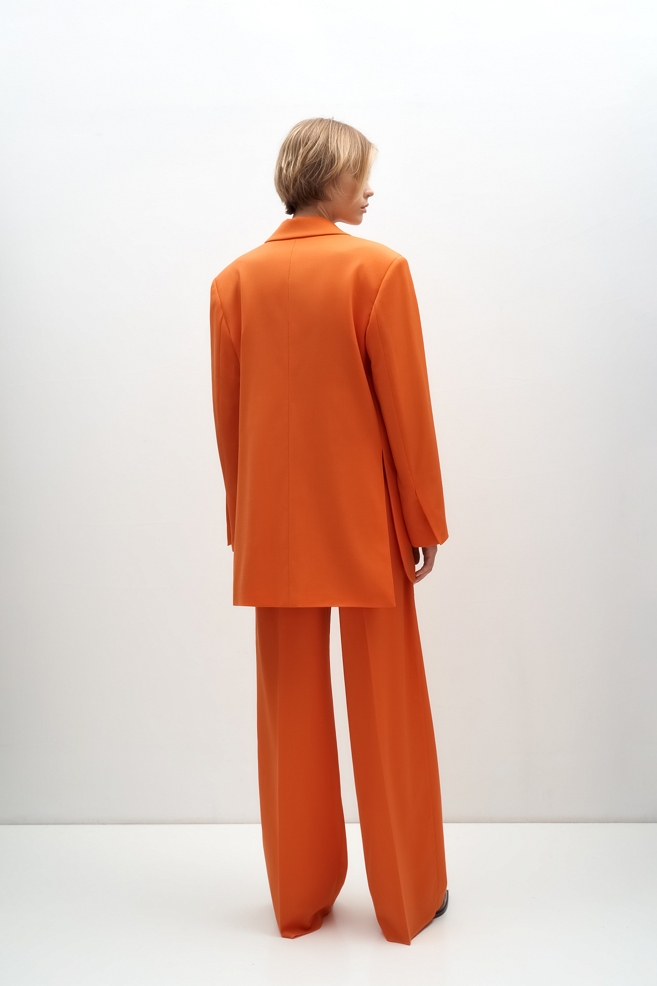 Классический костюм, состоящий из однобортного жакета и брюк палаццо. Жакет прямого кроя судлиненной спинкой, лацканами и двумя прорезными карманами с клапанами. Брюки прямого кроя с боковыми карманами и застежкой на молнию.