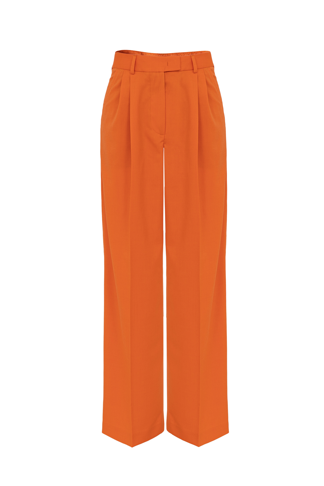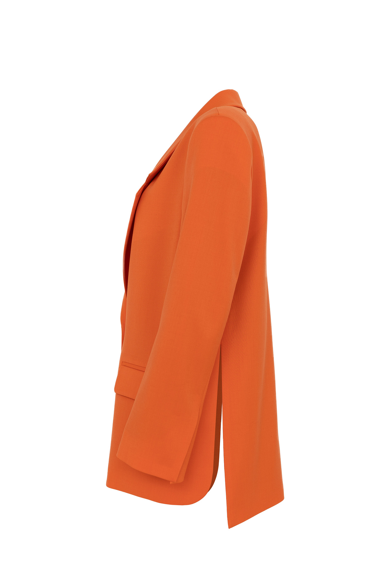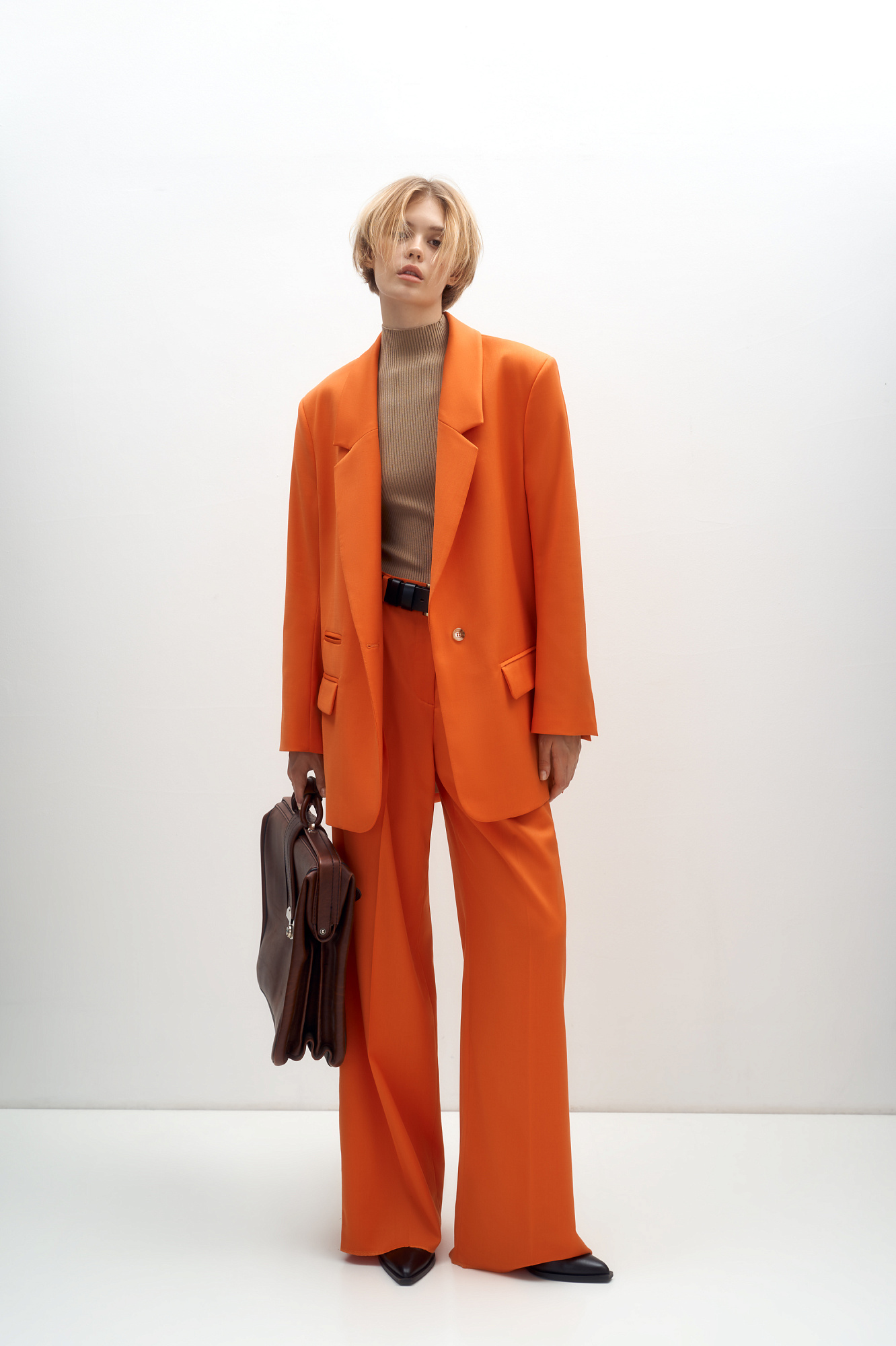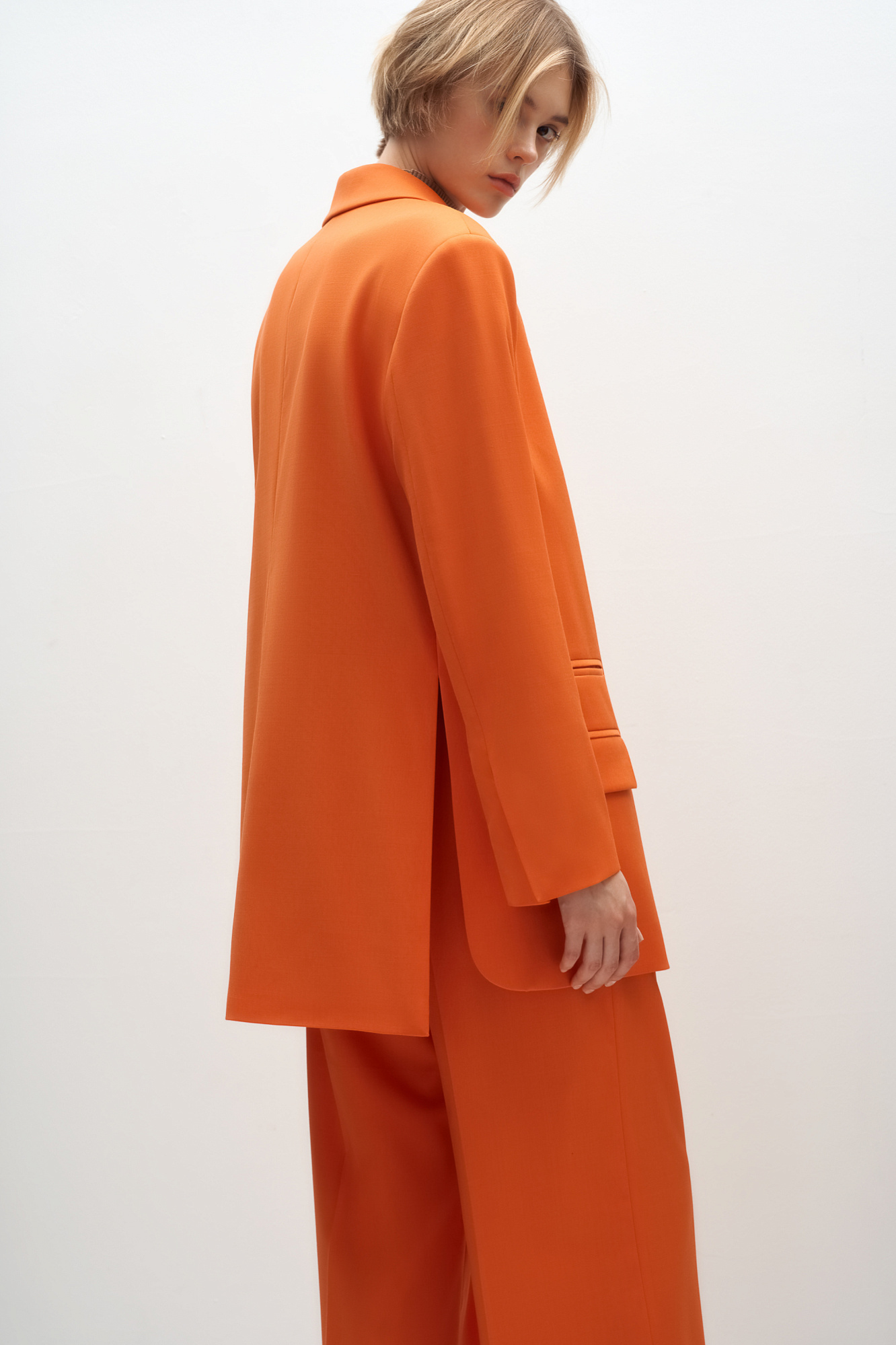 Классический костюм, состоящий из однобортного жакета и брюк палаццо. Жакет прямого кроя судлиненной спинкой, лацканами и двумя прорезными карманами с клапанами. Брюки прямого кроя с боковыми карманами и застежкой на молнию.