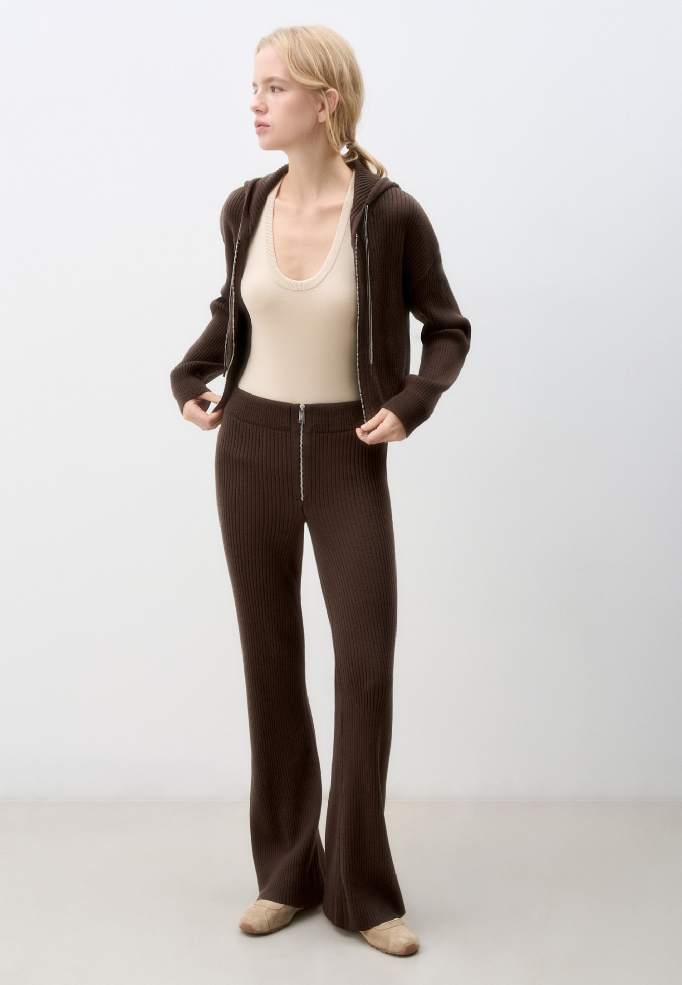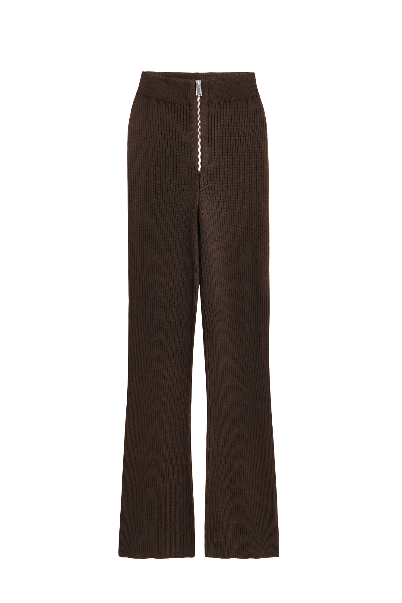 Трикотажные брюки в рубчик. Модель прямого кроя с расклешением к низу. Застежка на молнию. Эластичный пояс на резинке.