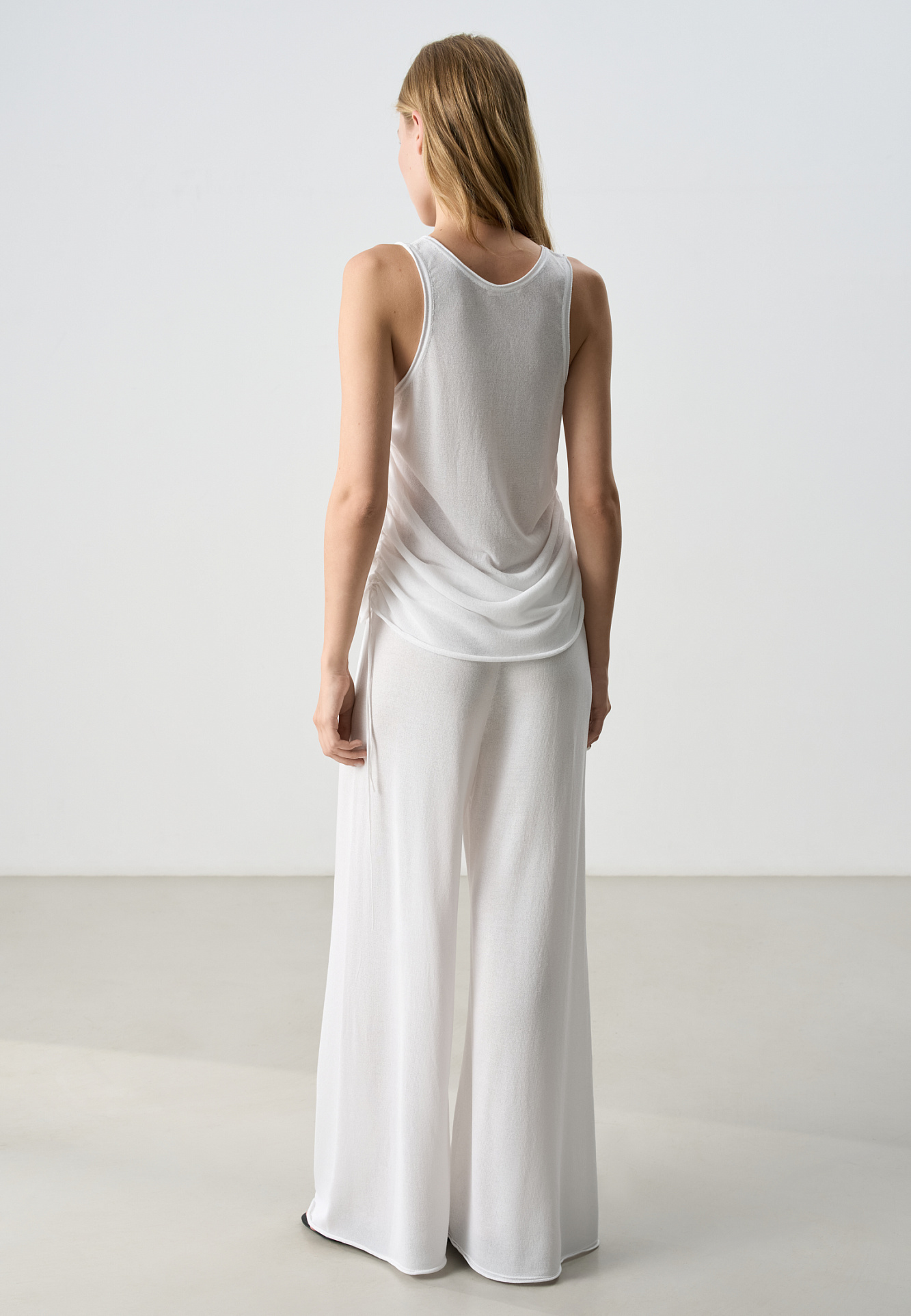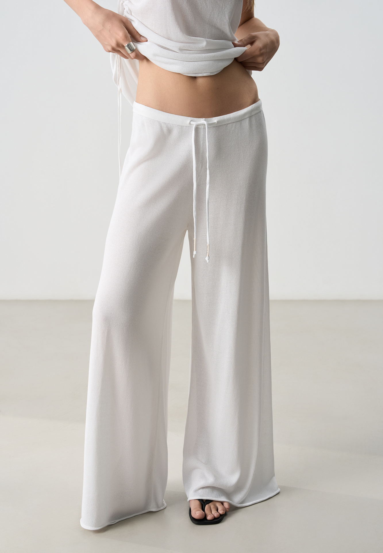 Трикотажные брюки палаццо из легкой вискозы. Модель свободного кроя с поясом на кулиске.