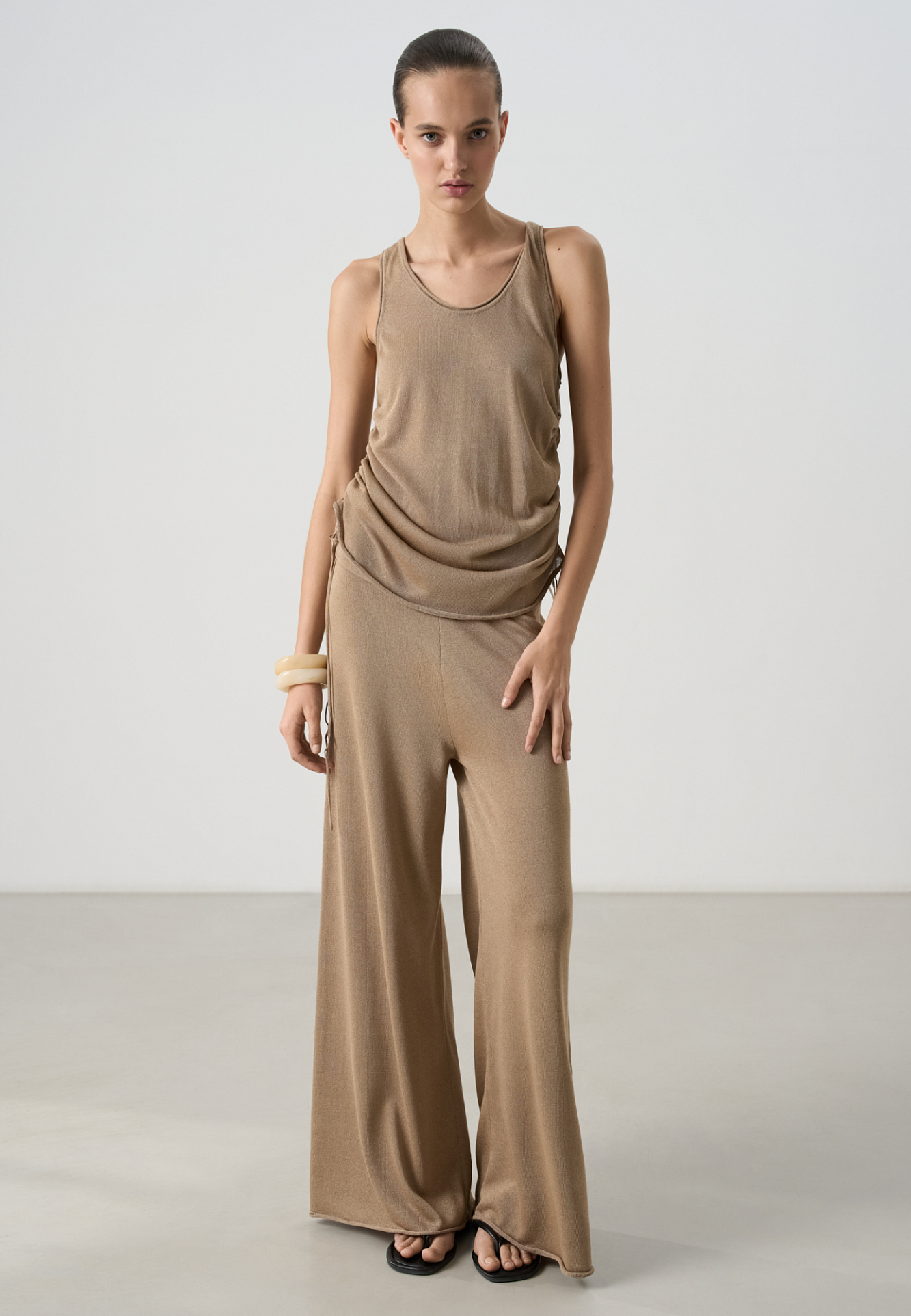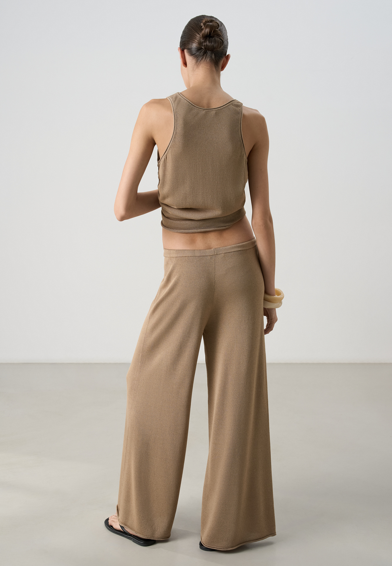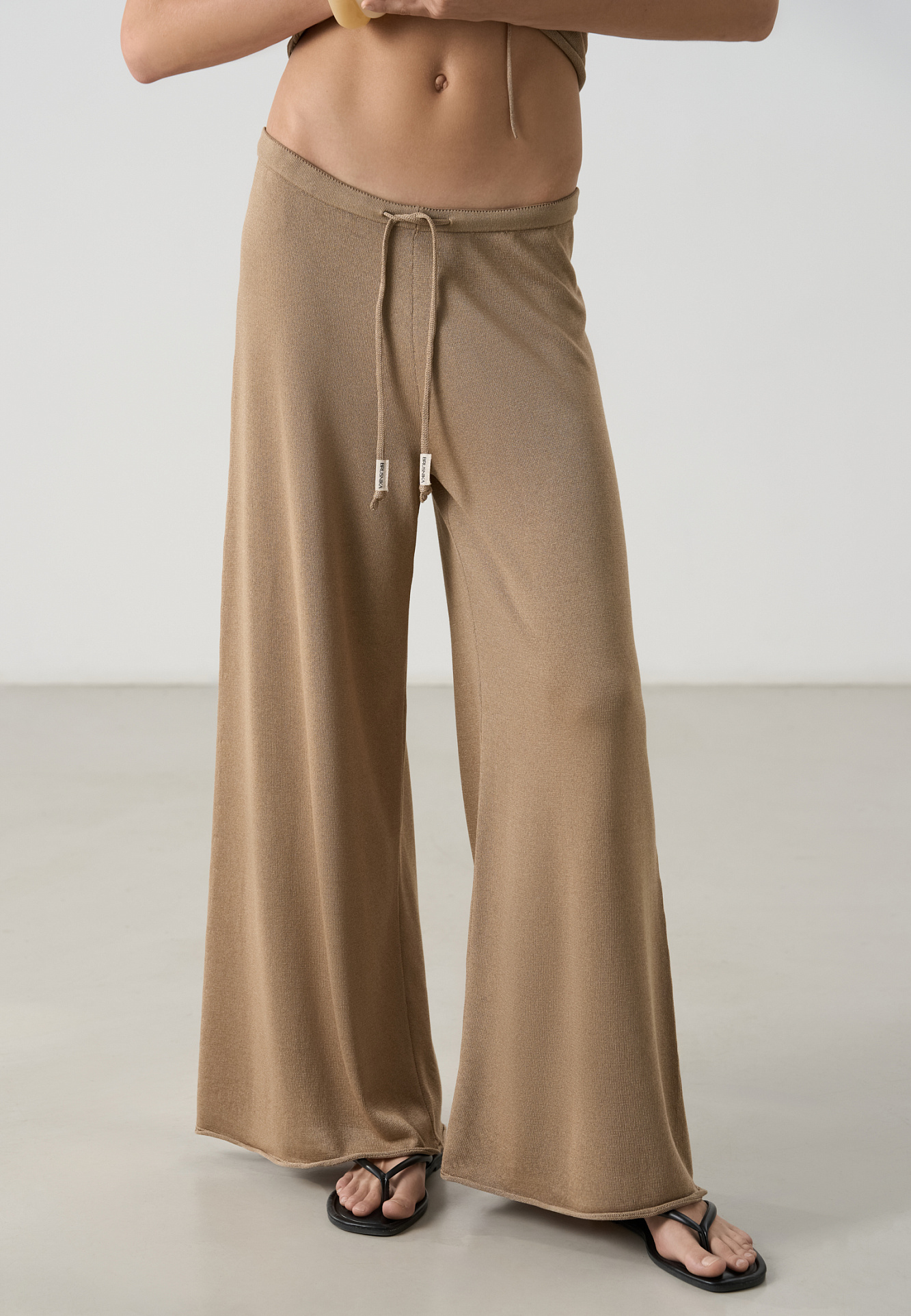 Трикотажные брюки палаццо из легкой вискозы. Модель свободного кроя с поясом на кулиске.