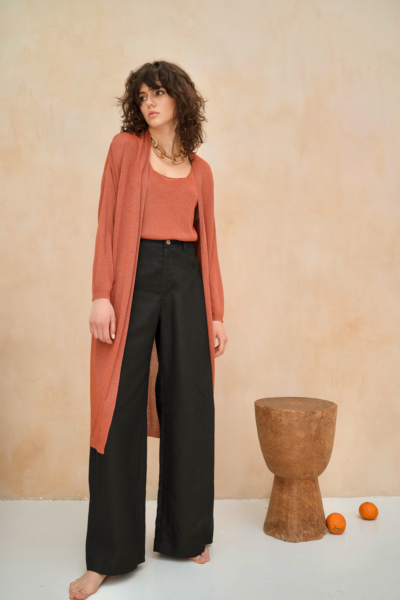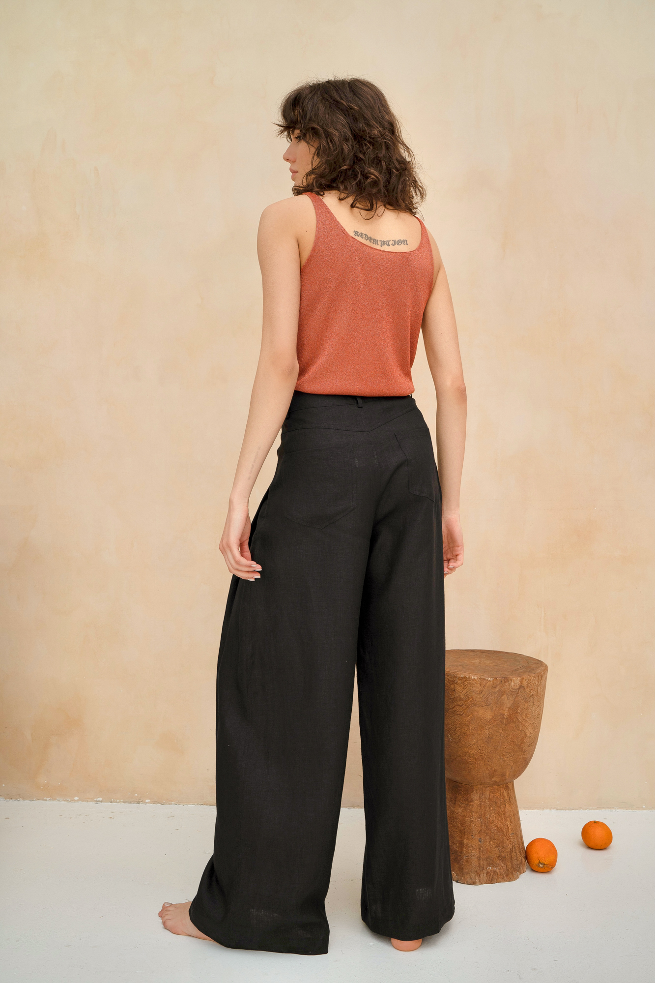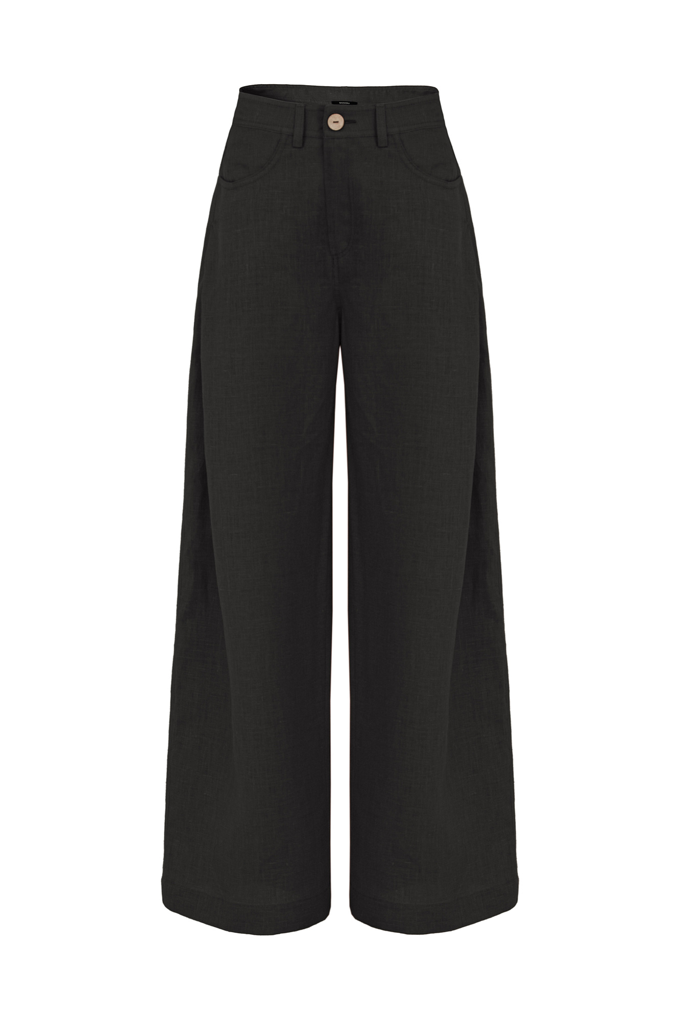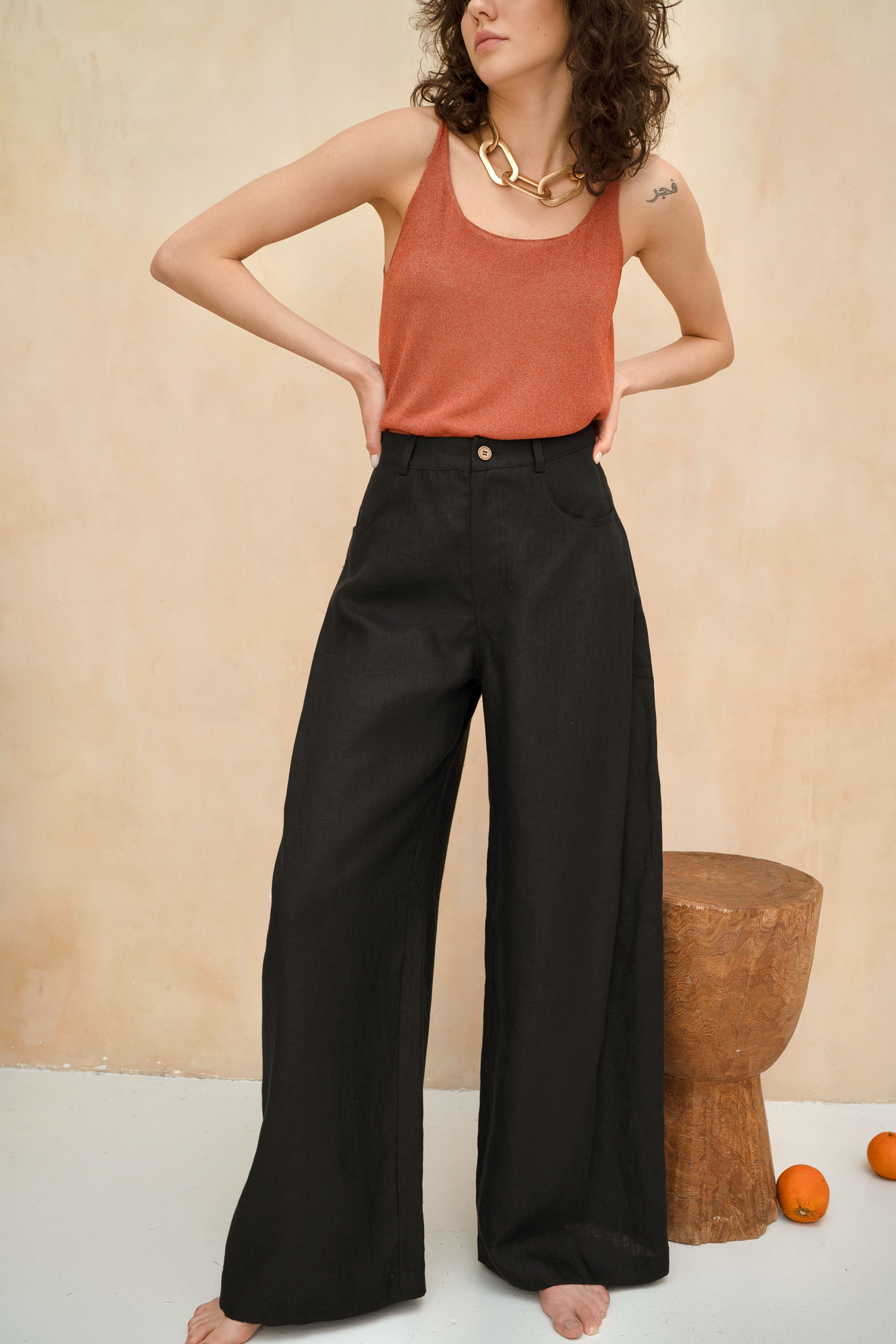 Брюки свободного кроя из 100% льна с высокой посадкой и потайной застежкой на молнию и пуговицу.