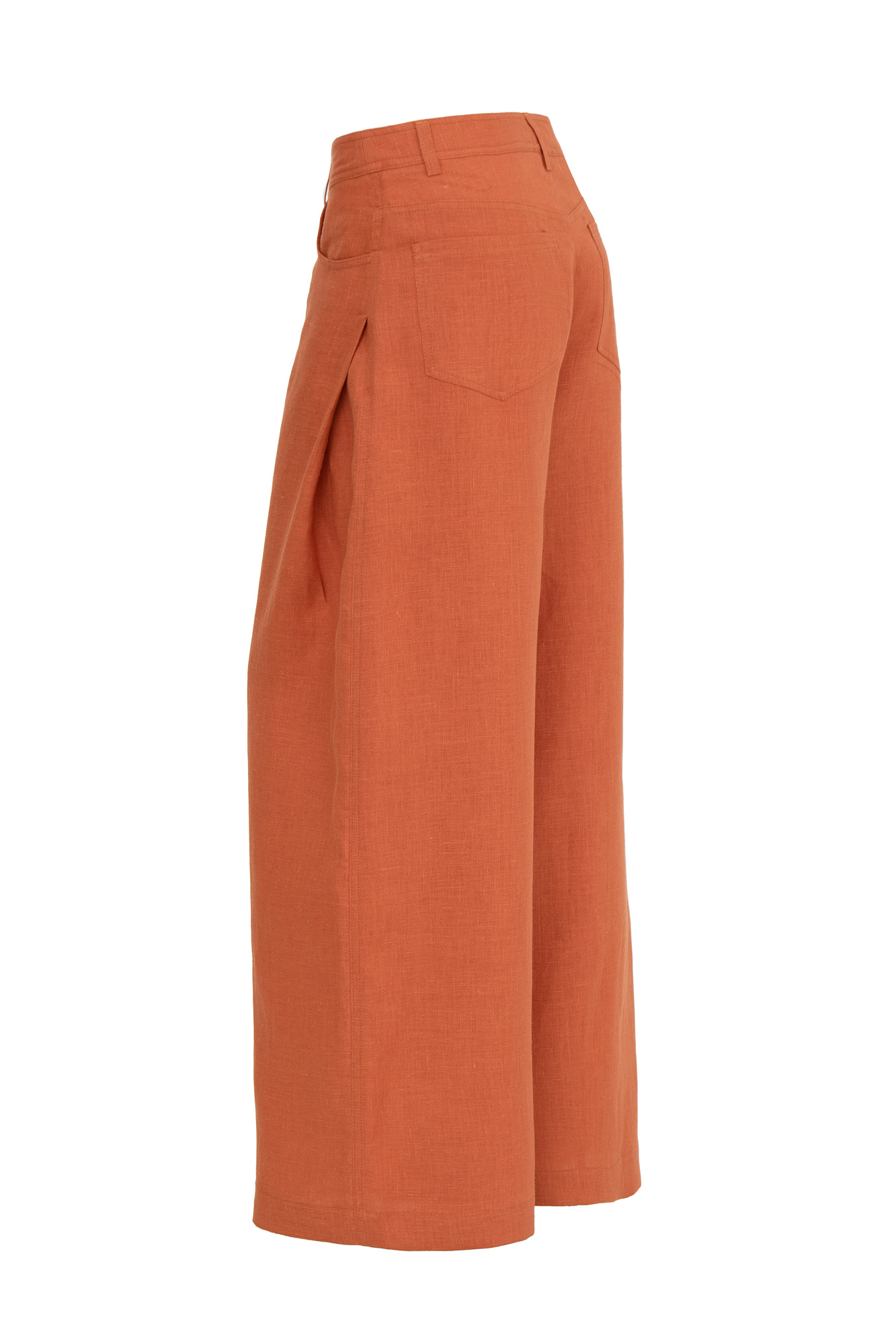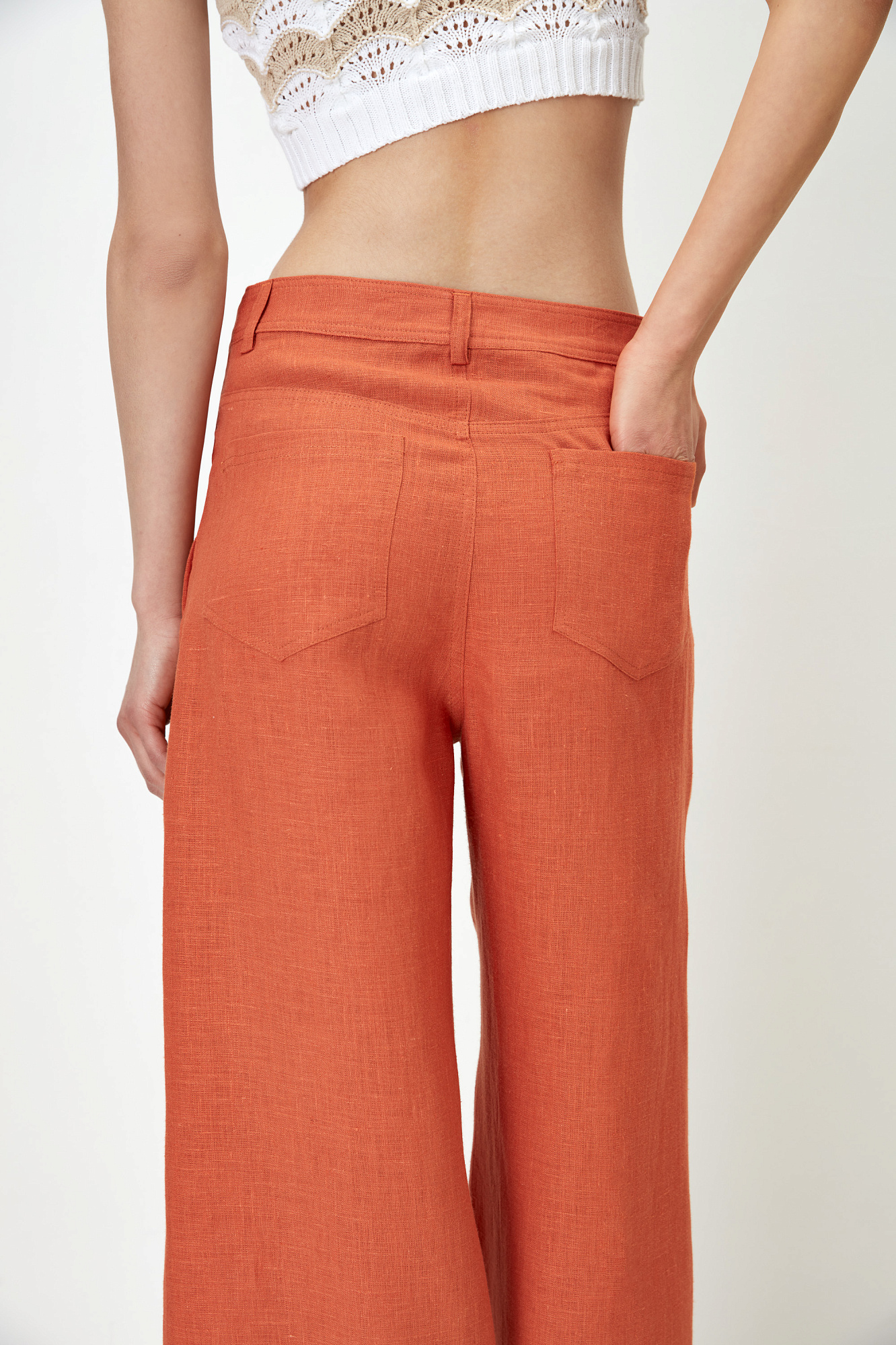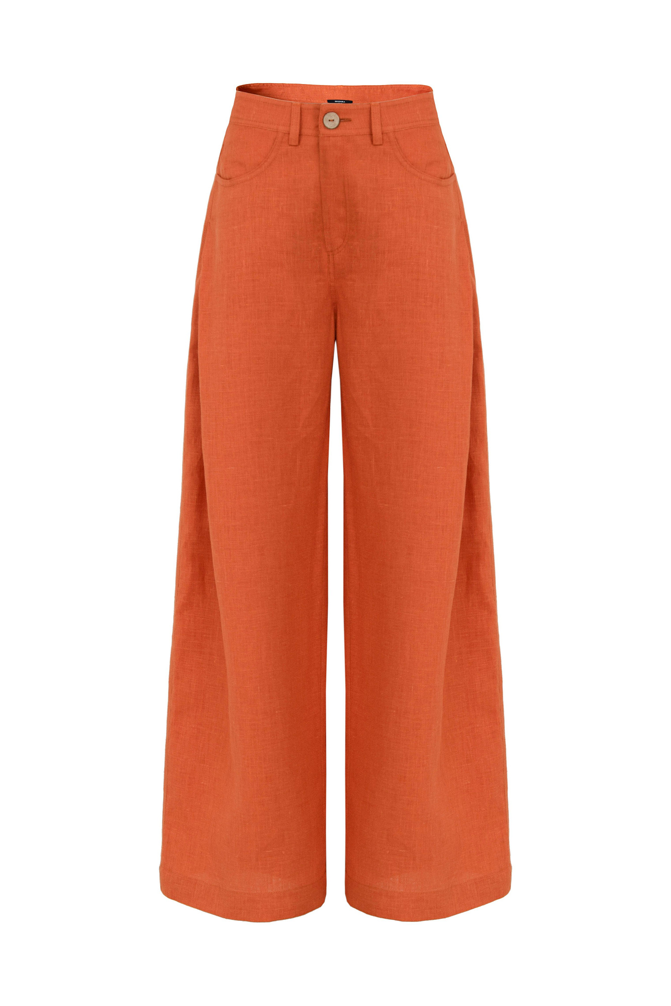 Брюки свободного кроя из 100% льна с высокой посадкой и потайной застежкой на молнию и пуговицу.