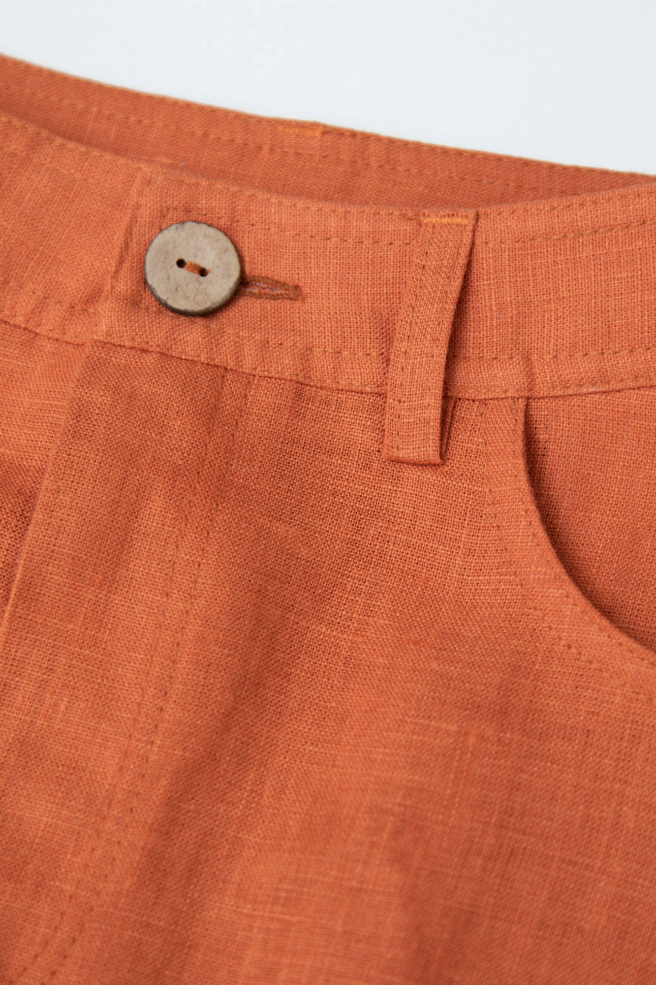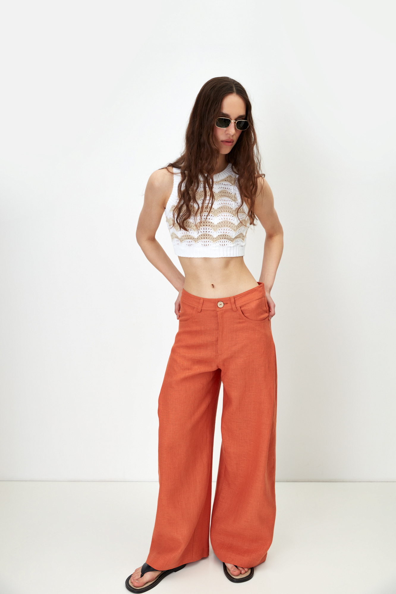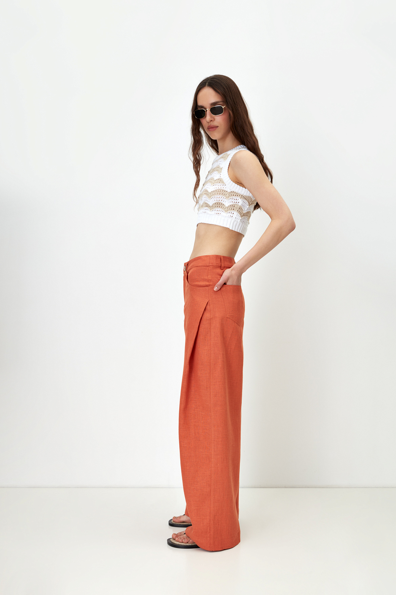 Брюки свободного кроя из 100% льна с высокой посадкой и потайной застежкой на молнию и пуговицу.