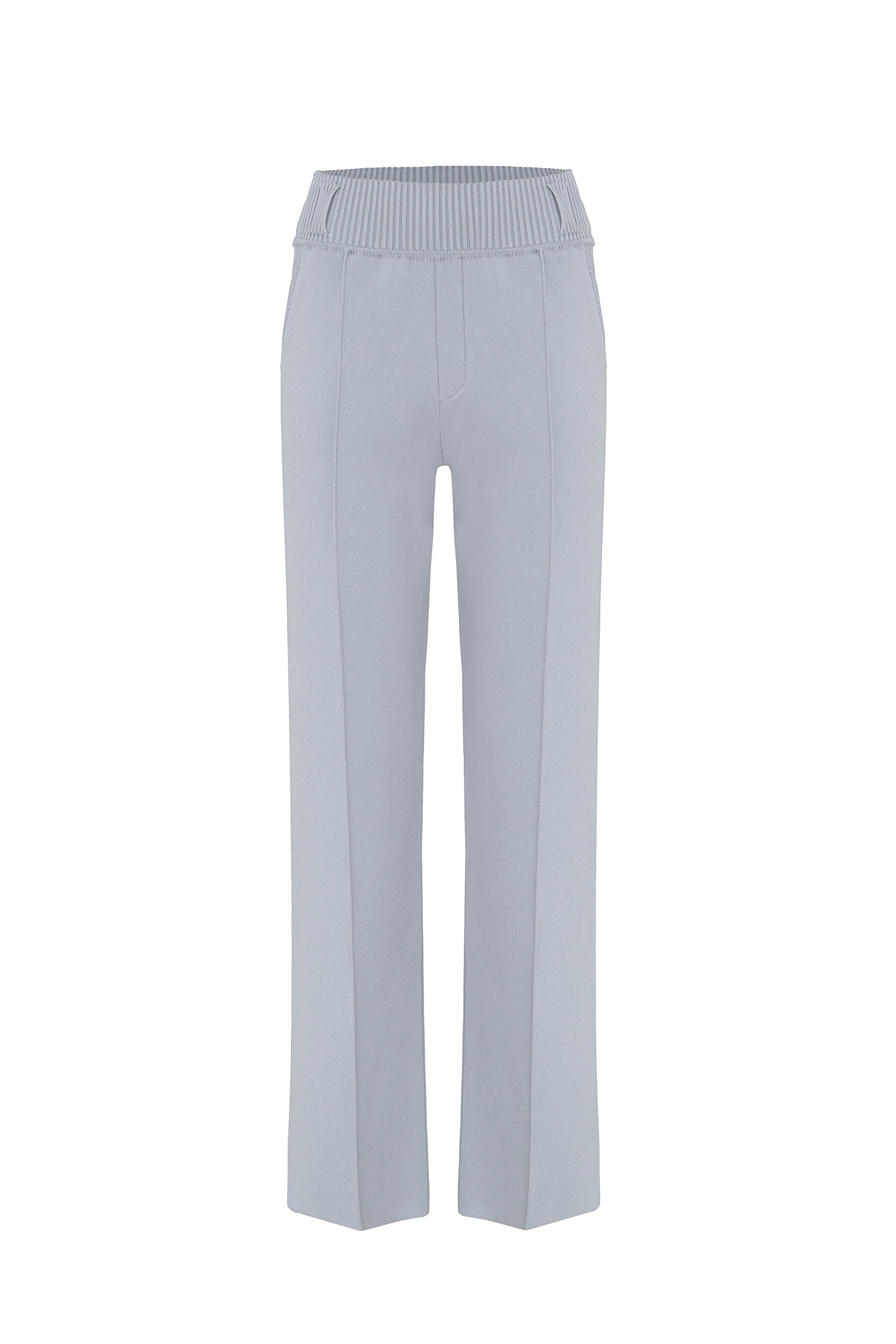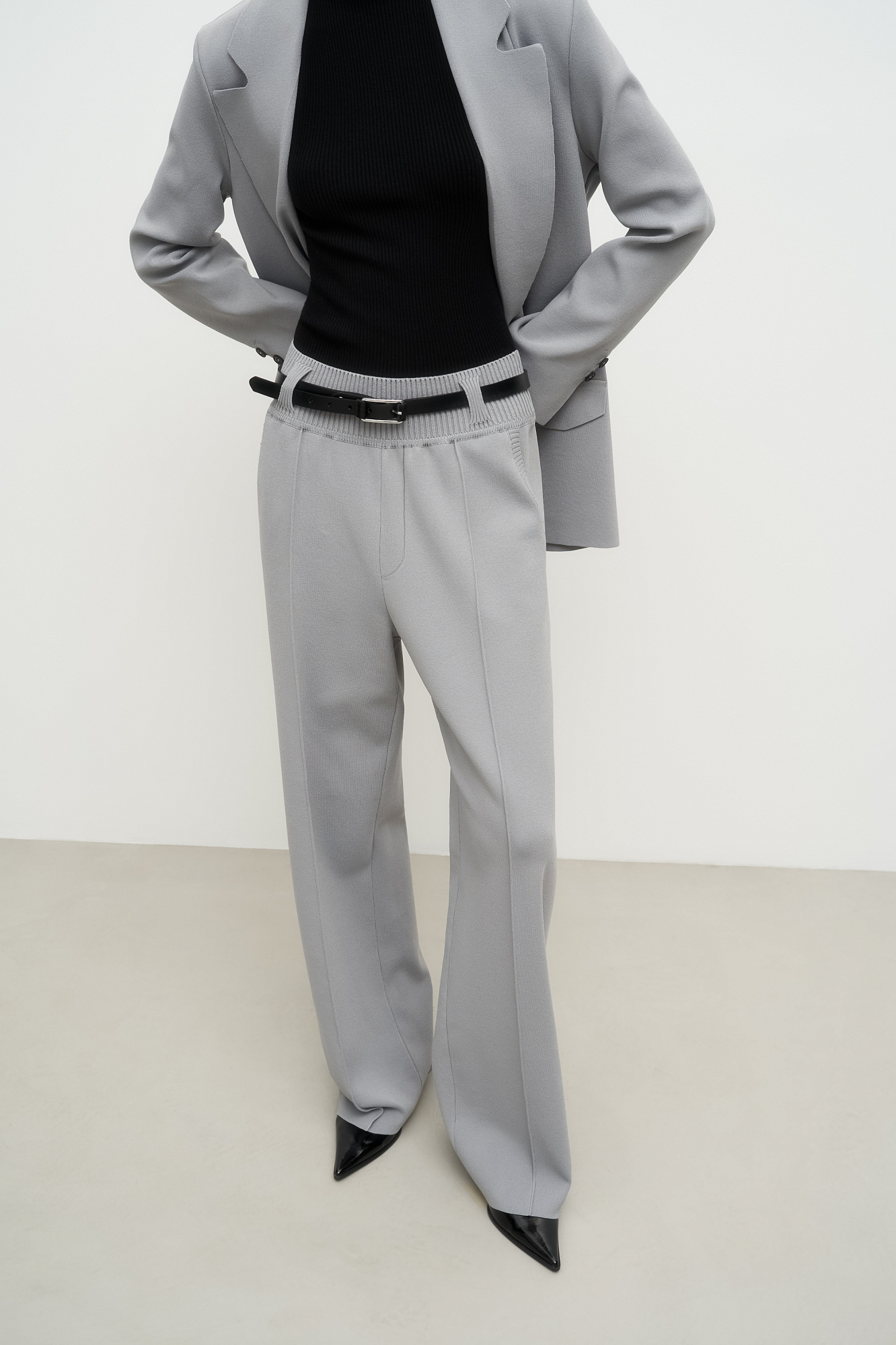 Классические брюки прямого кроя из плотной вискозы со стрелками и поясом-резинкой со шлевками. Для создания комплекта сочетайте их с двубортным жакетом в тон.