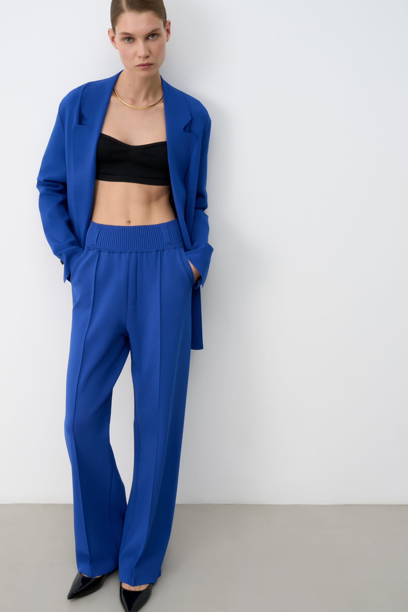 Классические брюки прямого кроя из плотной вискозы со стрелками и поясом-резинкой со шлевками. Для создания комплекта сочетайте их с двубортным жакетом в тон.